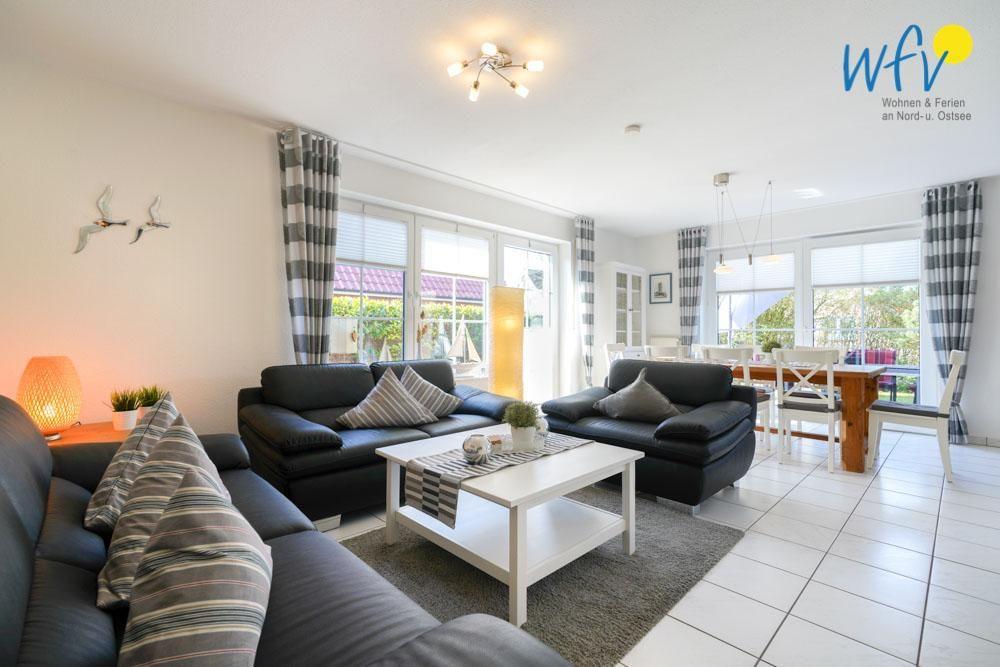 Nach der Fahrradtour oder dem Strandtag können Sie sich im gemütlichen Wohnzimmer erholen, das u.a. mit einer Sitzecke, einer HiFi-Anlage mit Radio und CD-Player und einem modernen Flachbildfernseher ausgestattet ist.