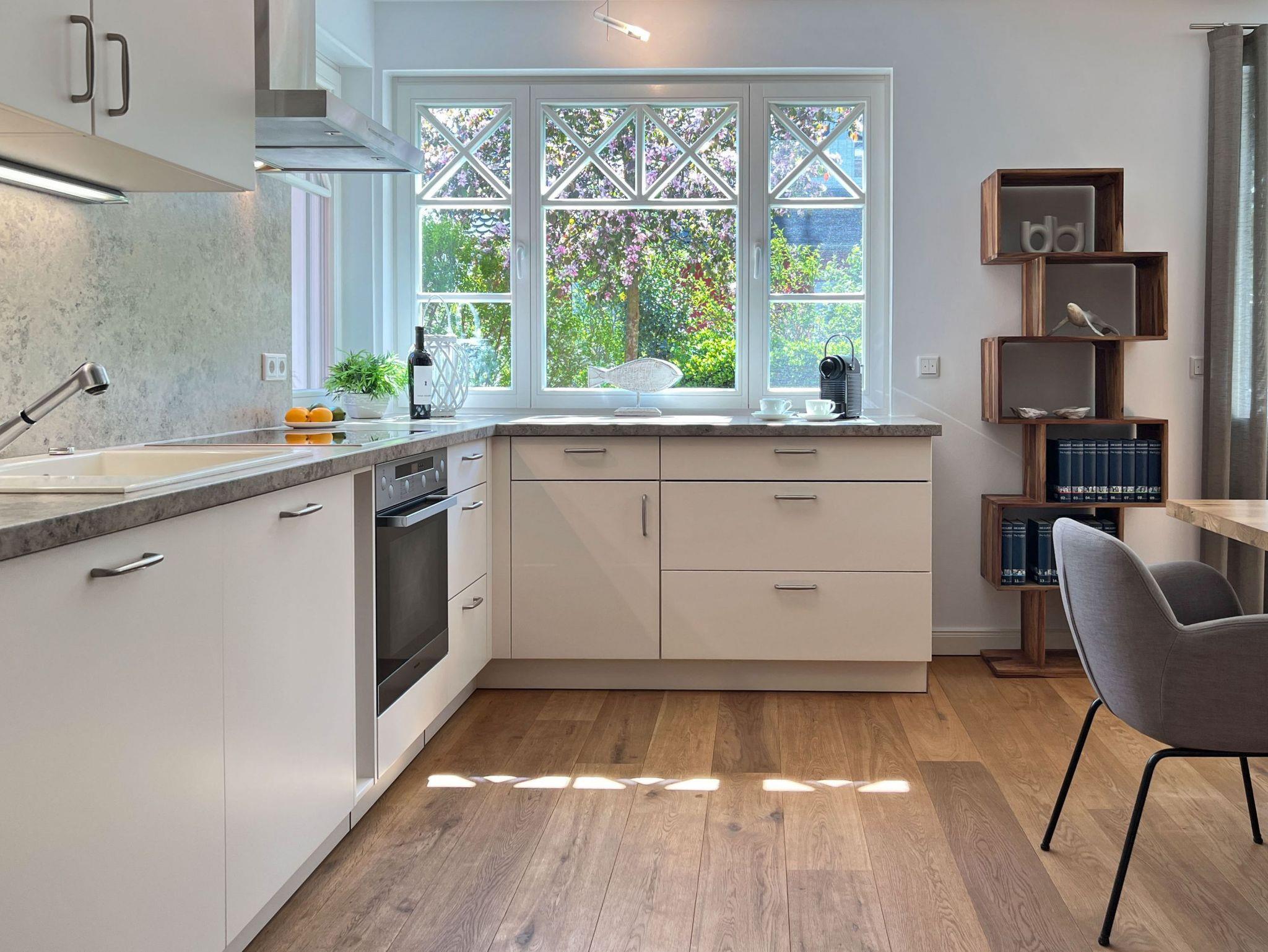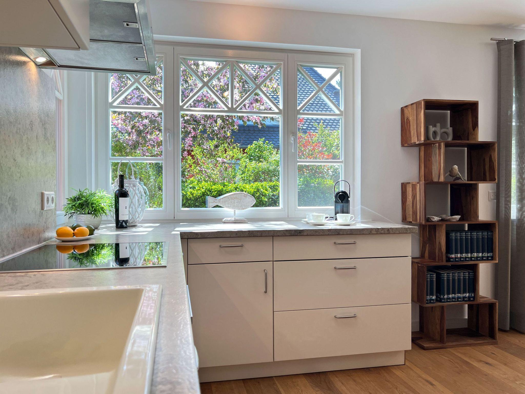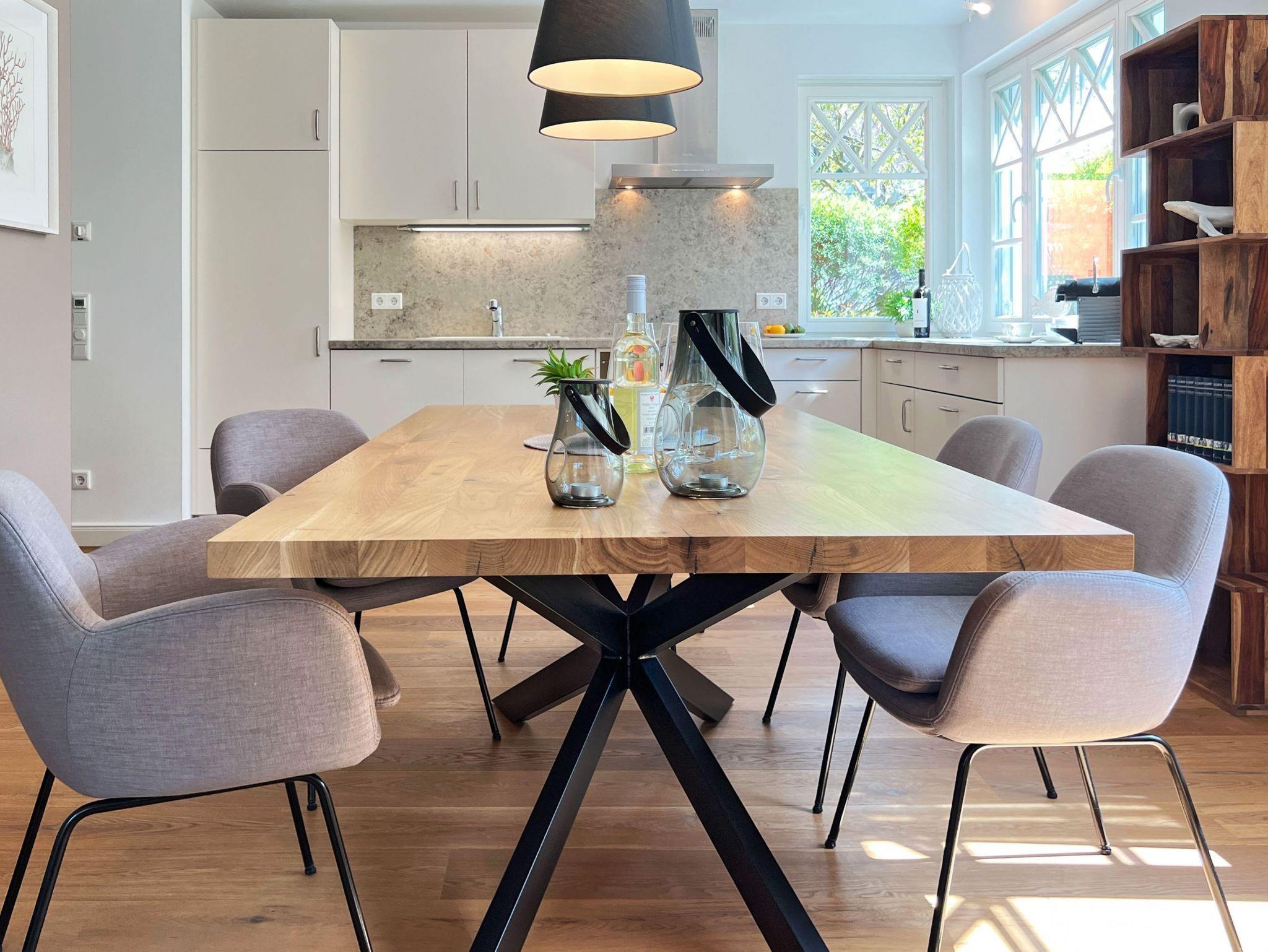 Die offene Küche lädt dazu ein, Lieblingsgerichte zuzubereiten und diese am Esstisch oder auf der großen Terrasse im Freien zu genießen.
