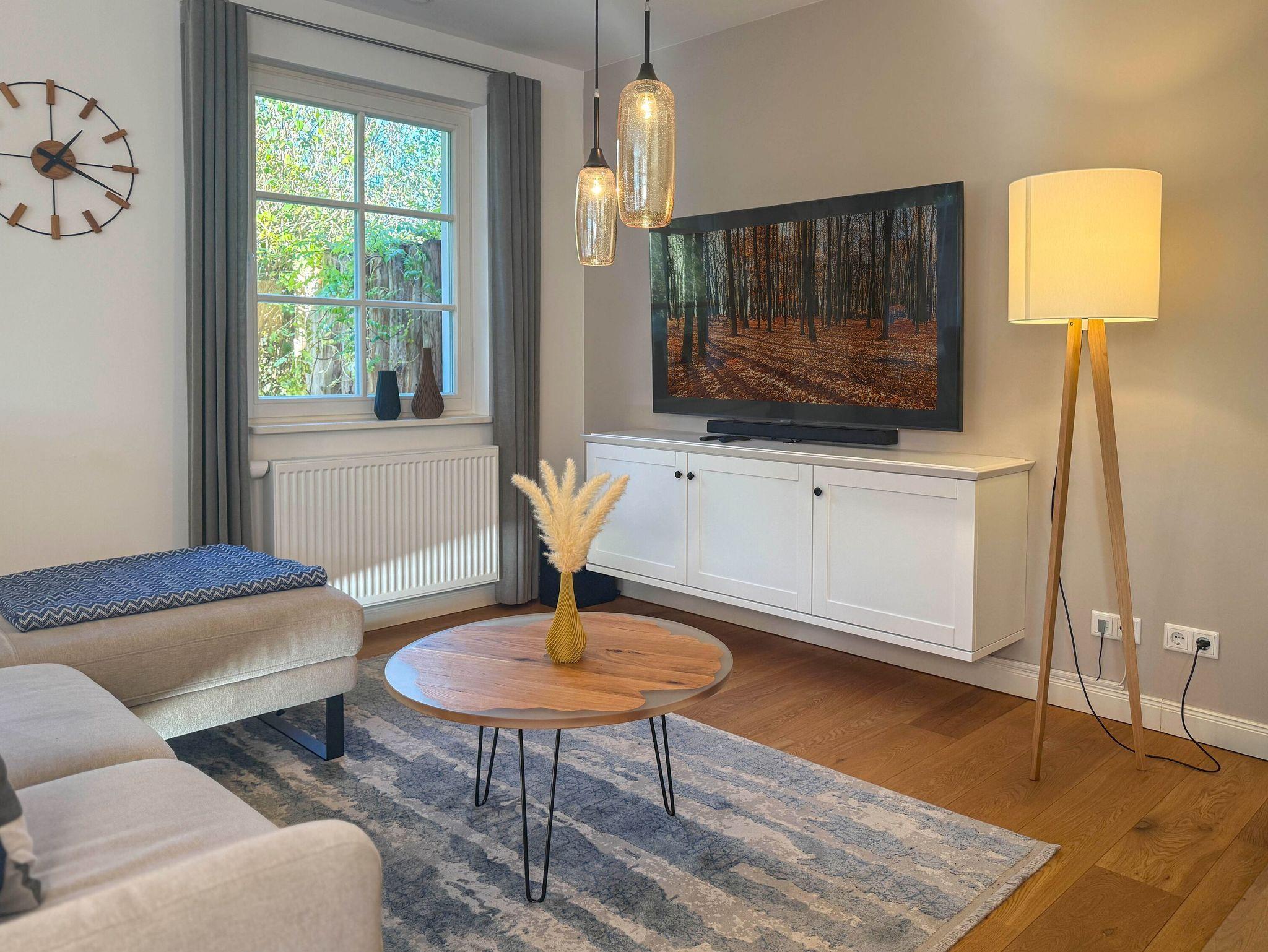 • Gemütlicher Wohn- und Essbereich mit Kamin, komfortabler Sitzgruppe, großem Smart-TV und Soundbar