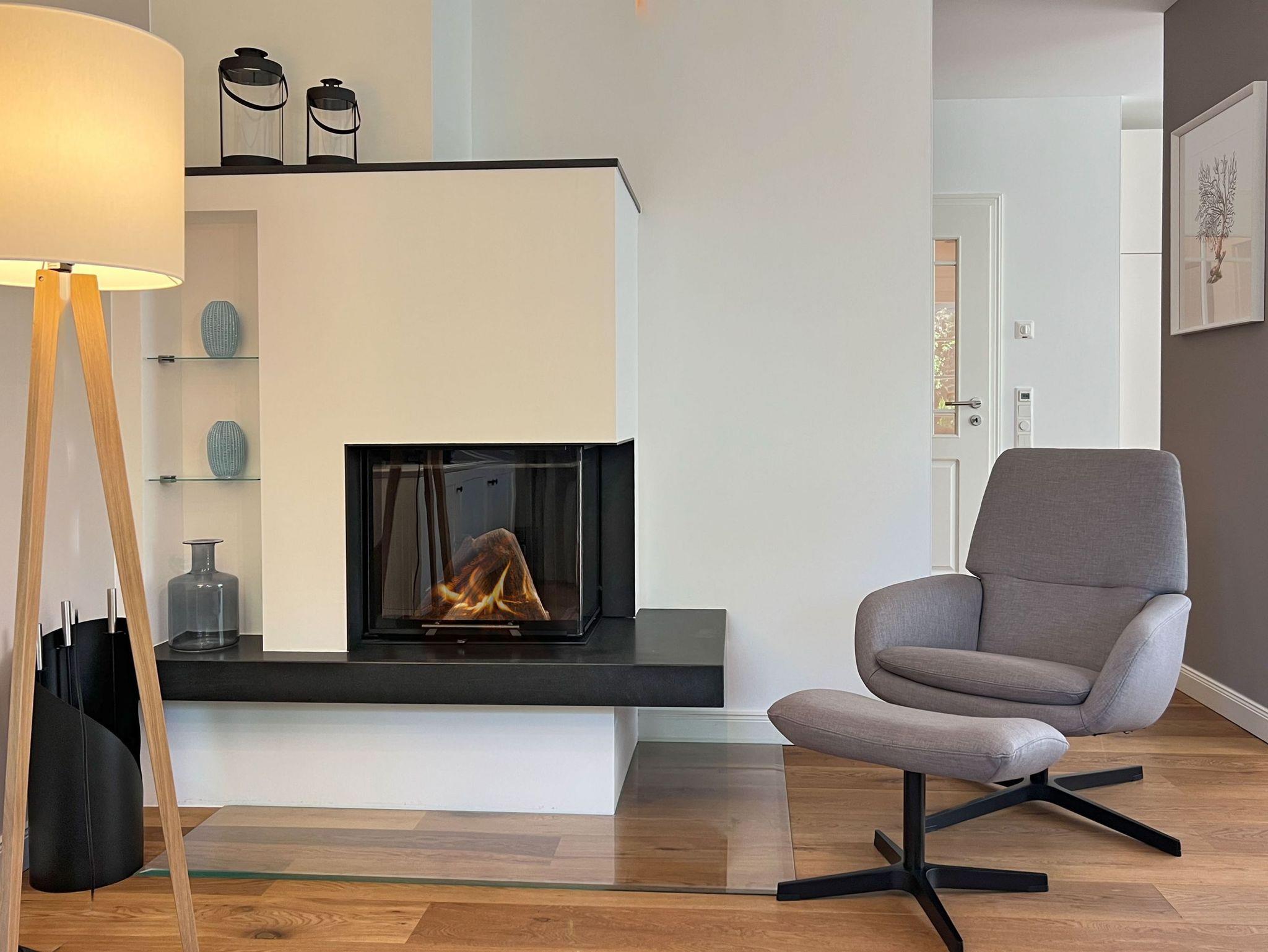 Der großzügige Wohnbereich mit Kamin bildet das Herzstück des Hauses hier treffen edle Materialien auf Gemütlichkeit und schaffen Raum für gemeinsame Stunden.