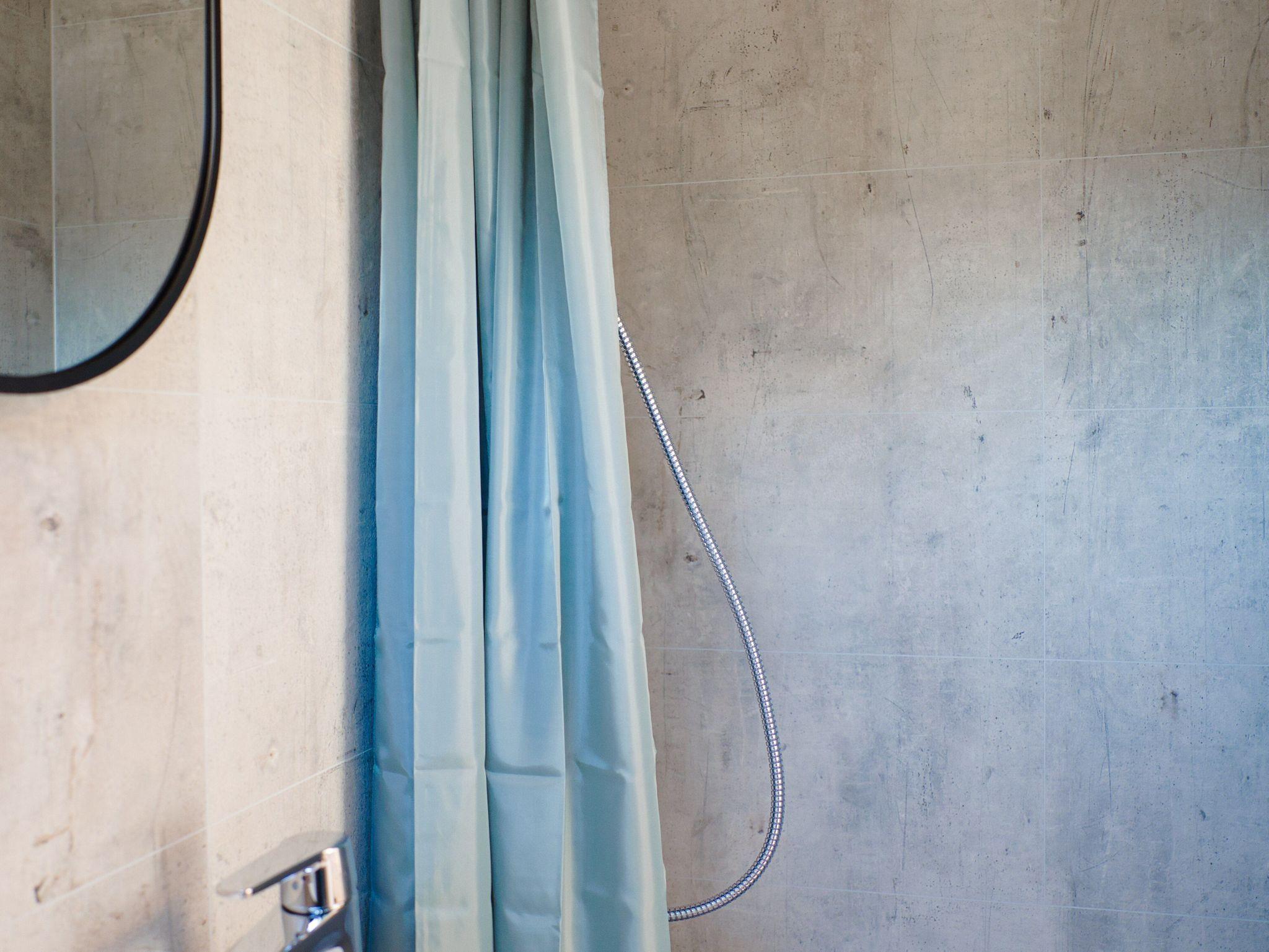 Das bequeme Doppelbett mit zwei Einzelmatratzen befindet sich im Schlafbereich. An diesen schließt das Badezimmer an, welches ein echtes Raumwunder ist - Dusche, Toilette sowie Waschbecken haben hier Platz.