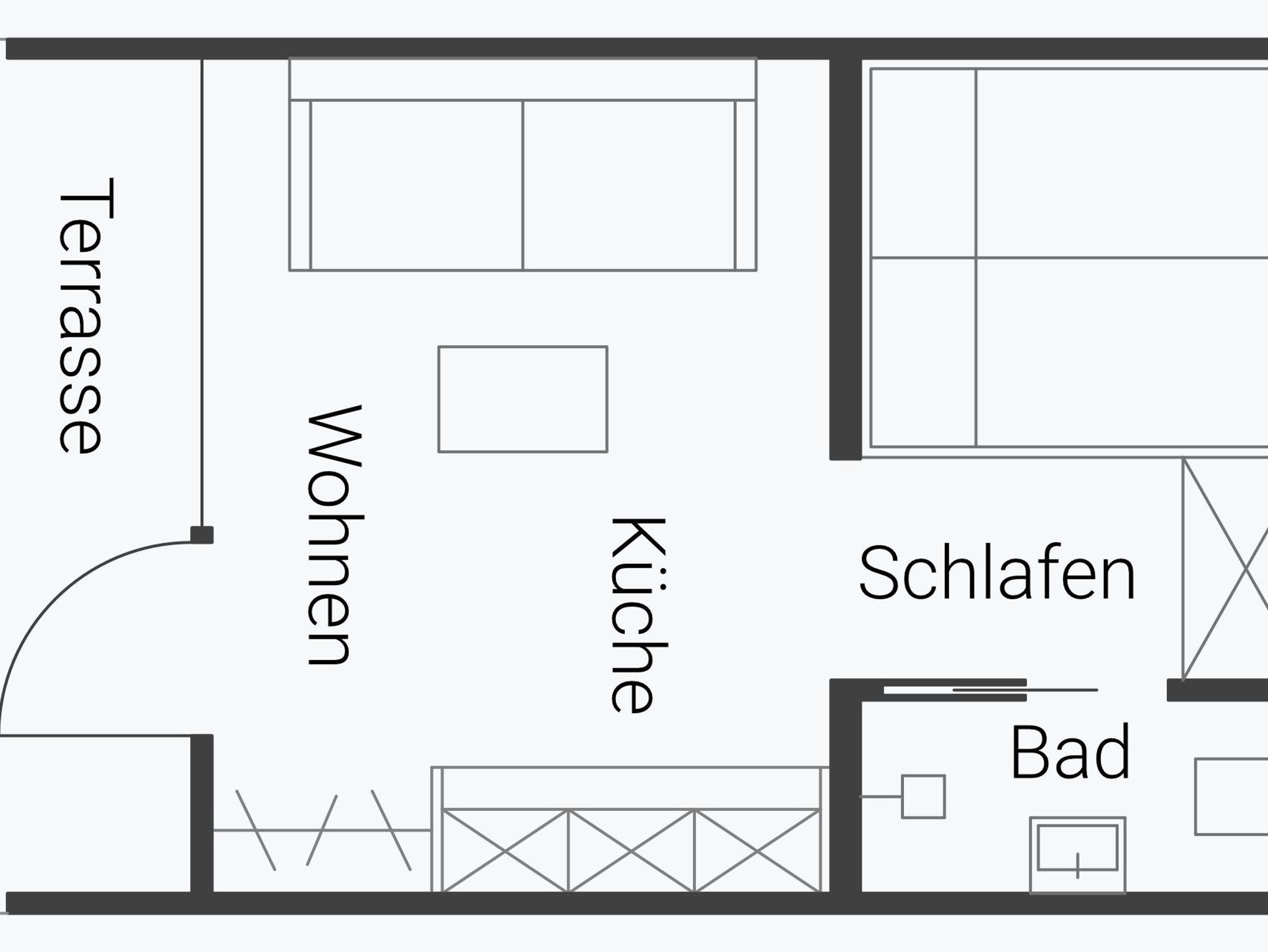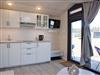 Im Wohnbereich sorgt die große Fensterfront für grandiosen Lichteinfall. Diesen kannst du vom Esstisch aus bewundern. Das gemütliche Sofa lädt dich ein, die Seele baumeln zu lassen. Außerdem bietet dieses die Möglichkeit einer Aufbettung. In der gut ausgestatteten Küche, mit Induktionsherd und Kühlschrank inkl. Gefrierfach, lassen sich leckere Gerichte zubereiten.