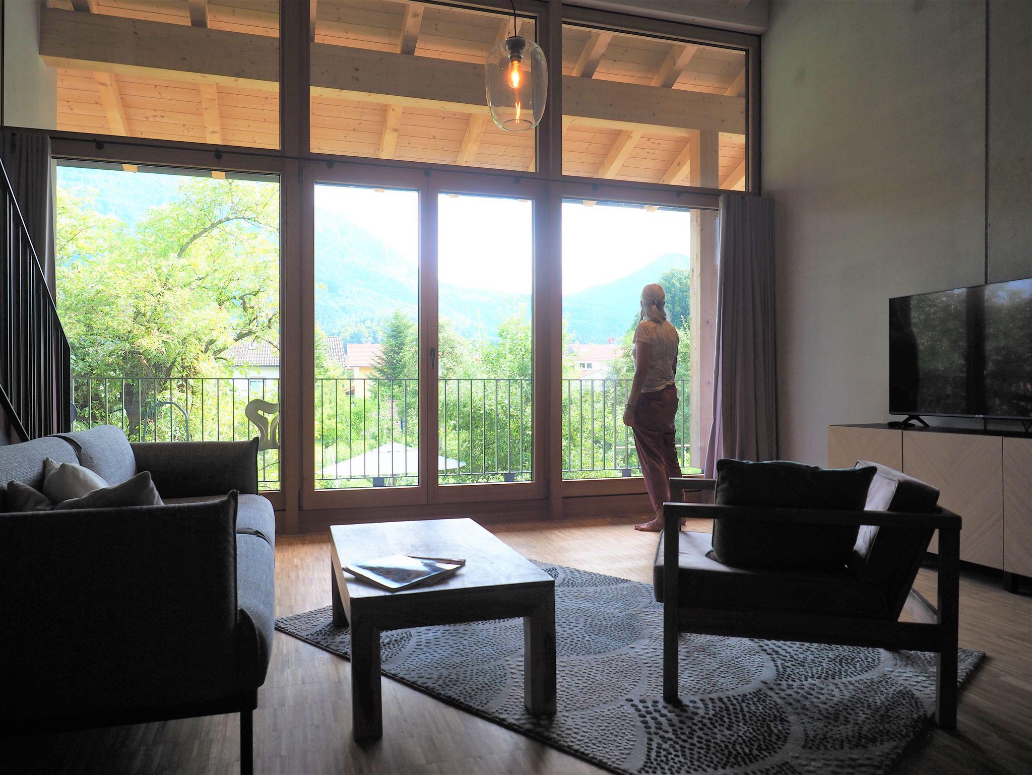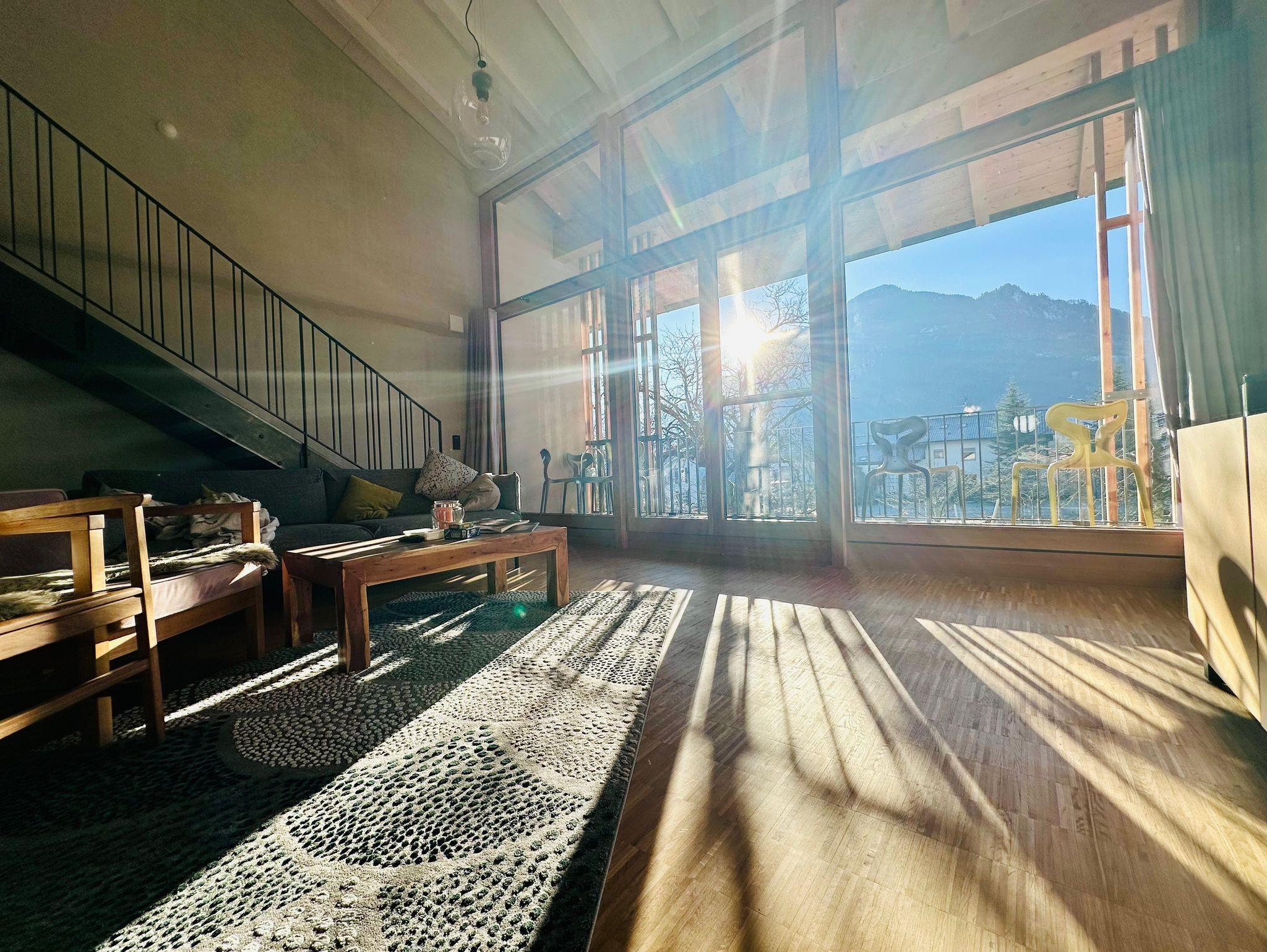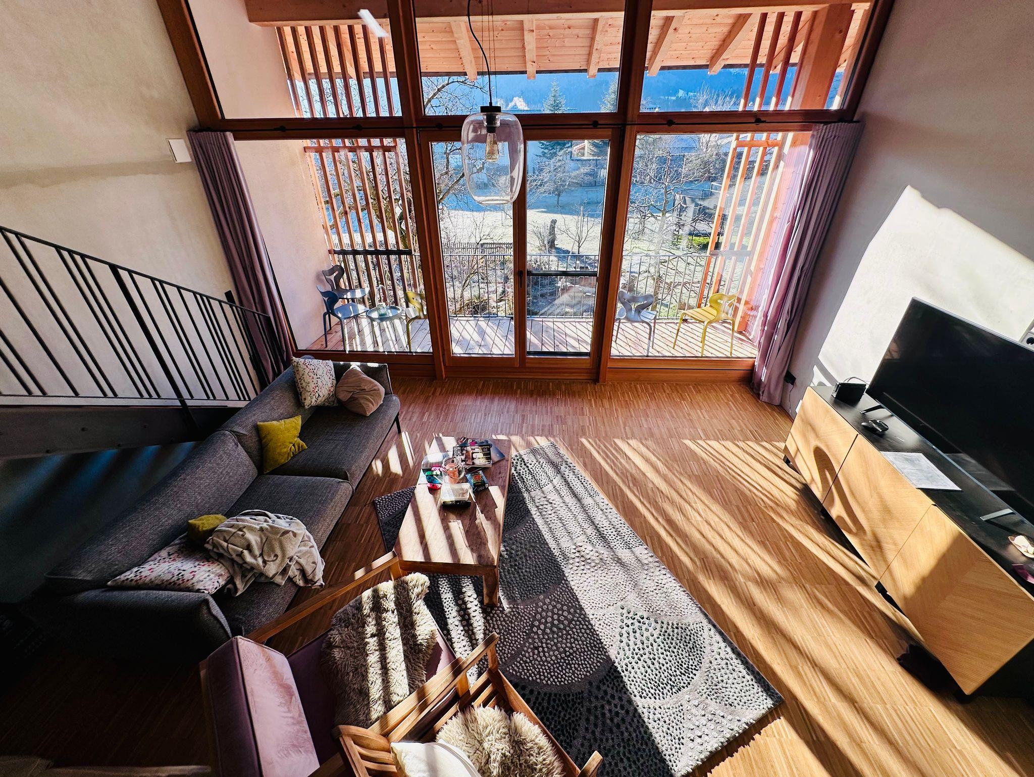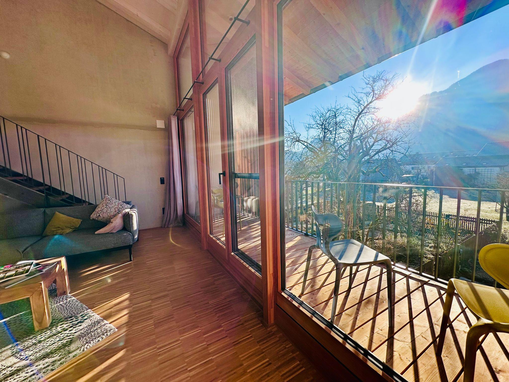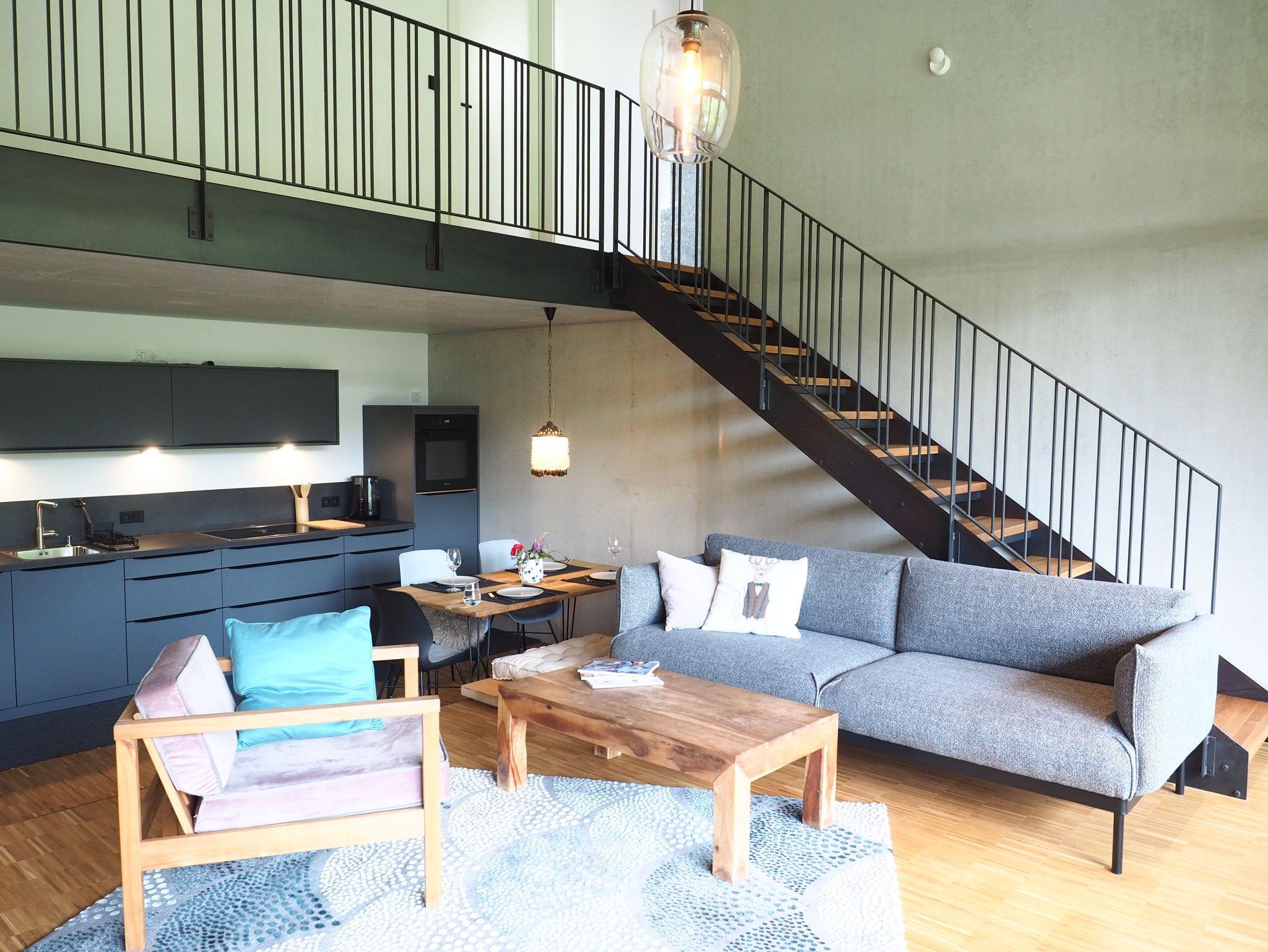 Die mit viel Liebe zum Design ausgestattete Galeriewohnung ist für 2-6 Personen geeignet und bietet mit ihrer hochwertigen Küchenausstattung (u.a. Induktionskochfeld, Geschirrspüler und Bora-Abzug), sowie der Ausstattung der beiden Bäder (freistehende Badewanne, Spülautomatik-Sensor und Regendusche) höchsten Komfort und Exklusivität. Über die Galerie gelangen Sie in zwei abgeschlossene Schlafräume (180 cm Bett bzw. 160 cm Bett), sowie einen offenen Bereich, der als weitere Schlafmöglichkeit (160 cm Schlafcouch) oder zum Chillen, Lesen oder Spielen einlädt. Vom großzügigen Südbalkon aus können Sie den Blick über die umliegenden Berge schweifen lassen. Unser Obstgarten lädt ebenfalls zum Verweilen ein.
