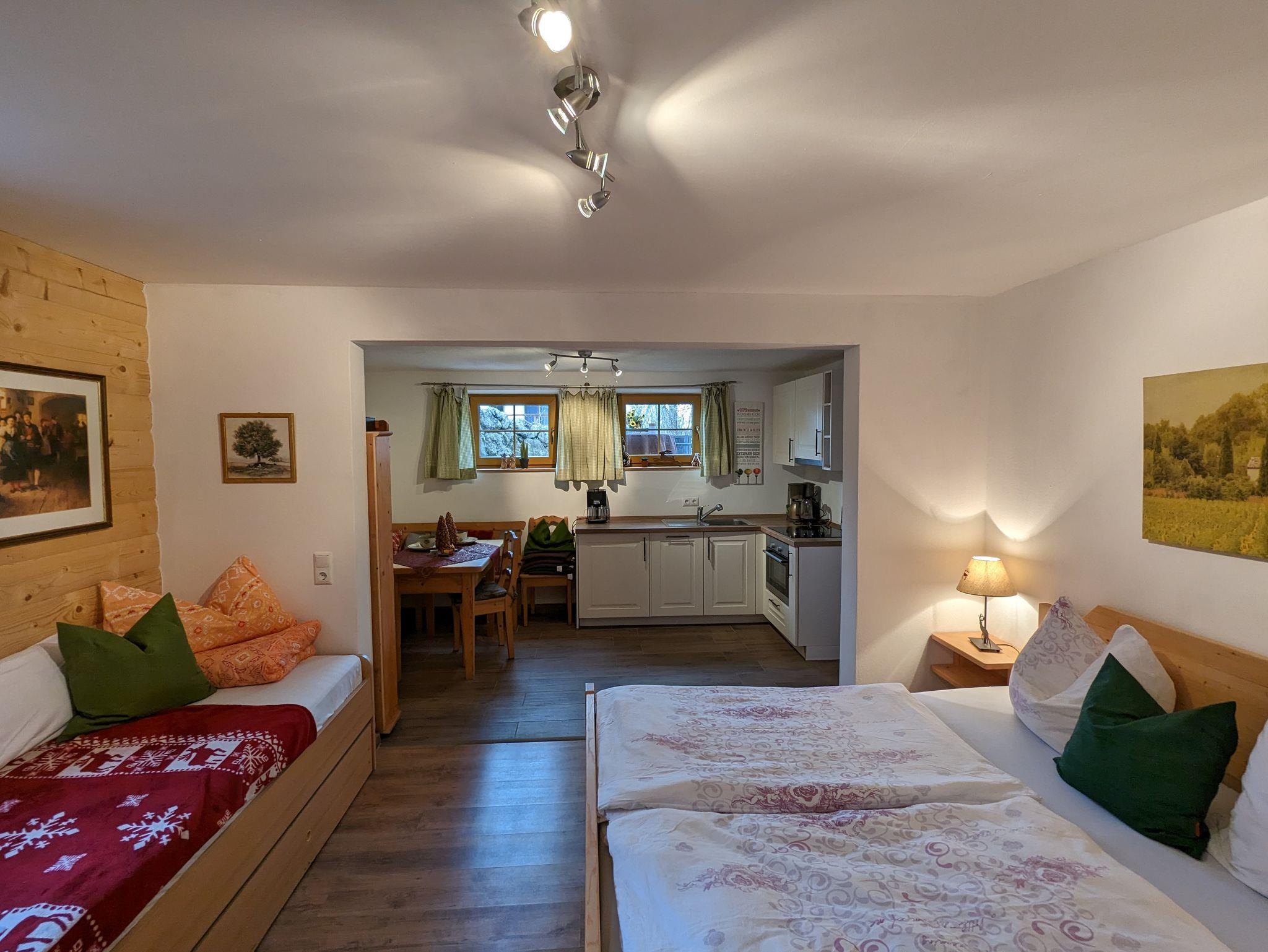 Ferienwohnung II Souterrain: 1- 3 Personen - Wohnschlafraum ca. 28m² mit Doppelbett und Ausziehcouch. Esstisch mit Stühlen. Sat-TV, kostenloses WLAN, Landhaus-Küchenzeile mit Herd und Backrohr, Spüle, Kühlschrank, Wasserkocher, Kaffeemaschine und Toaster. Spülmaschine, Geschirr, Gläser, Handtücher und Bettwäsche. Bad mit WC und Dusche. Terrasse zum Garten, Parkplatz am Haus. Ruhige Alleinlage.