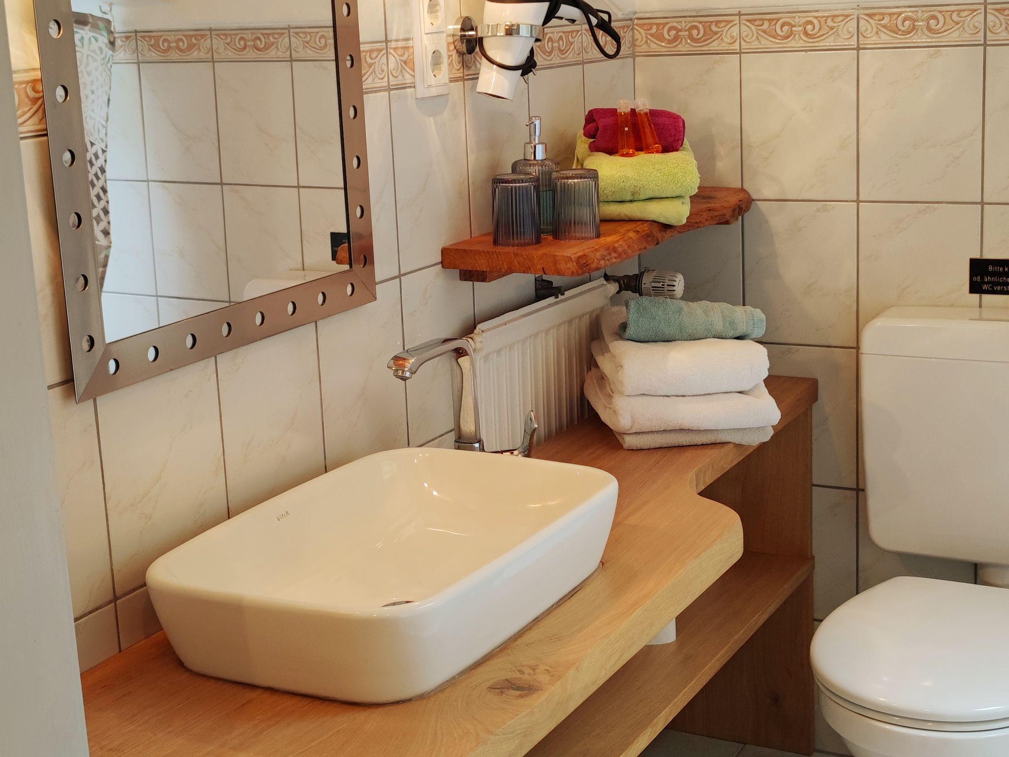 Im Tageslichtbad können Sie in unserer Duschbadewanne sowohl ein entspannendes Schaumbad genießen, als auch eine erfrischende Dusche. WC, Haartrockner, Handtücher, Spiegel übern Waschbecken und ein Kosmetikspiegel sind ebenfalls vorhanden.