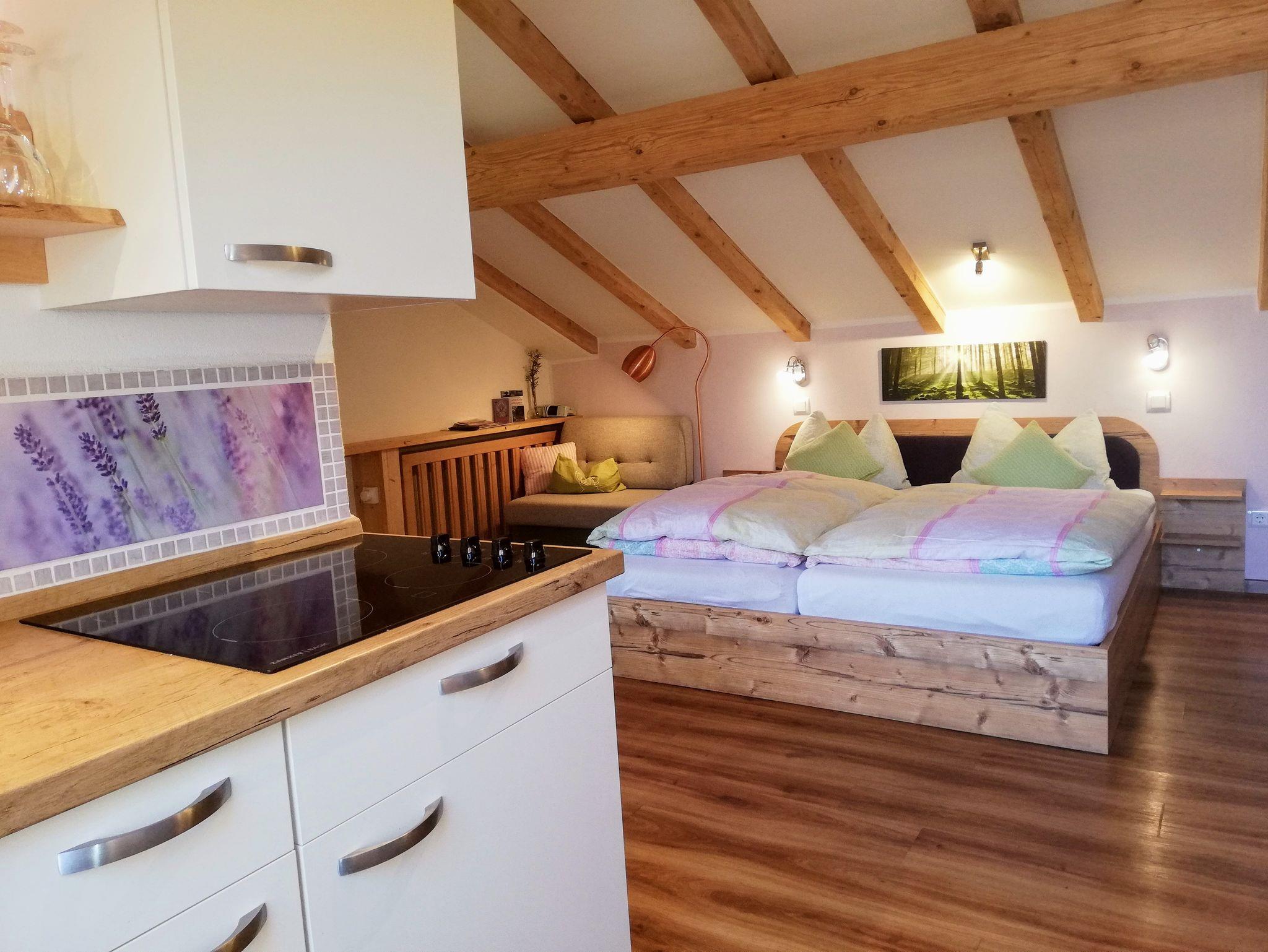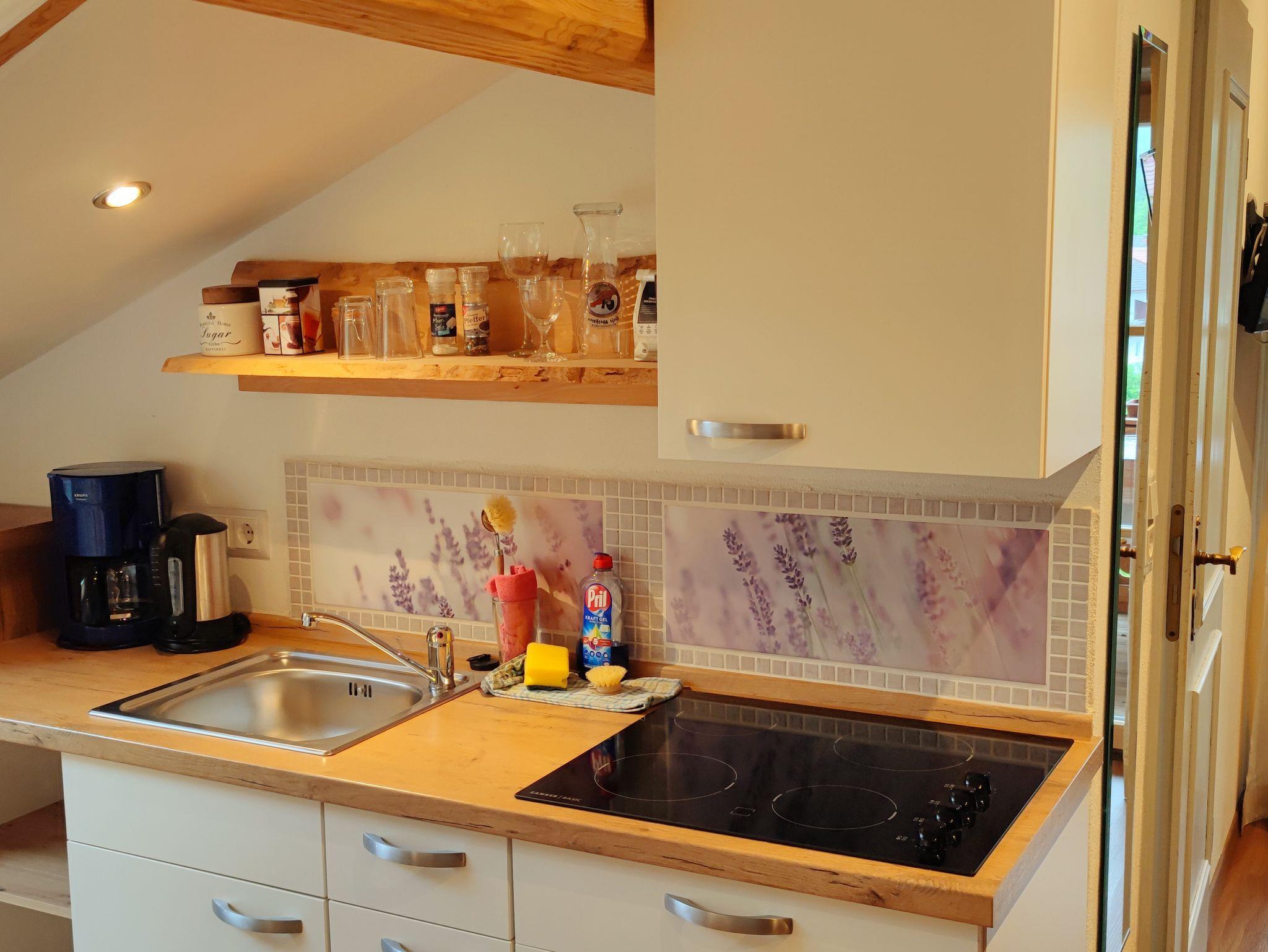 In der kleine Küchenzeile mit Wasserkocher, Herd, Kühlschrank, Spüle und Küchenzubehör, können sich unsere Gäste auch selber etwas zubereiten. Es gibt eine Essecke im Zimmer und eine auf dem Balkon. Der Balkon liegt auf der Süd-Ostseite unseres Hauses, mit Blick auf den Inntaler Bergwelt.