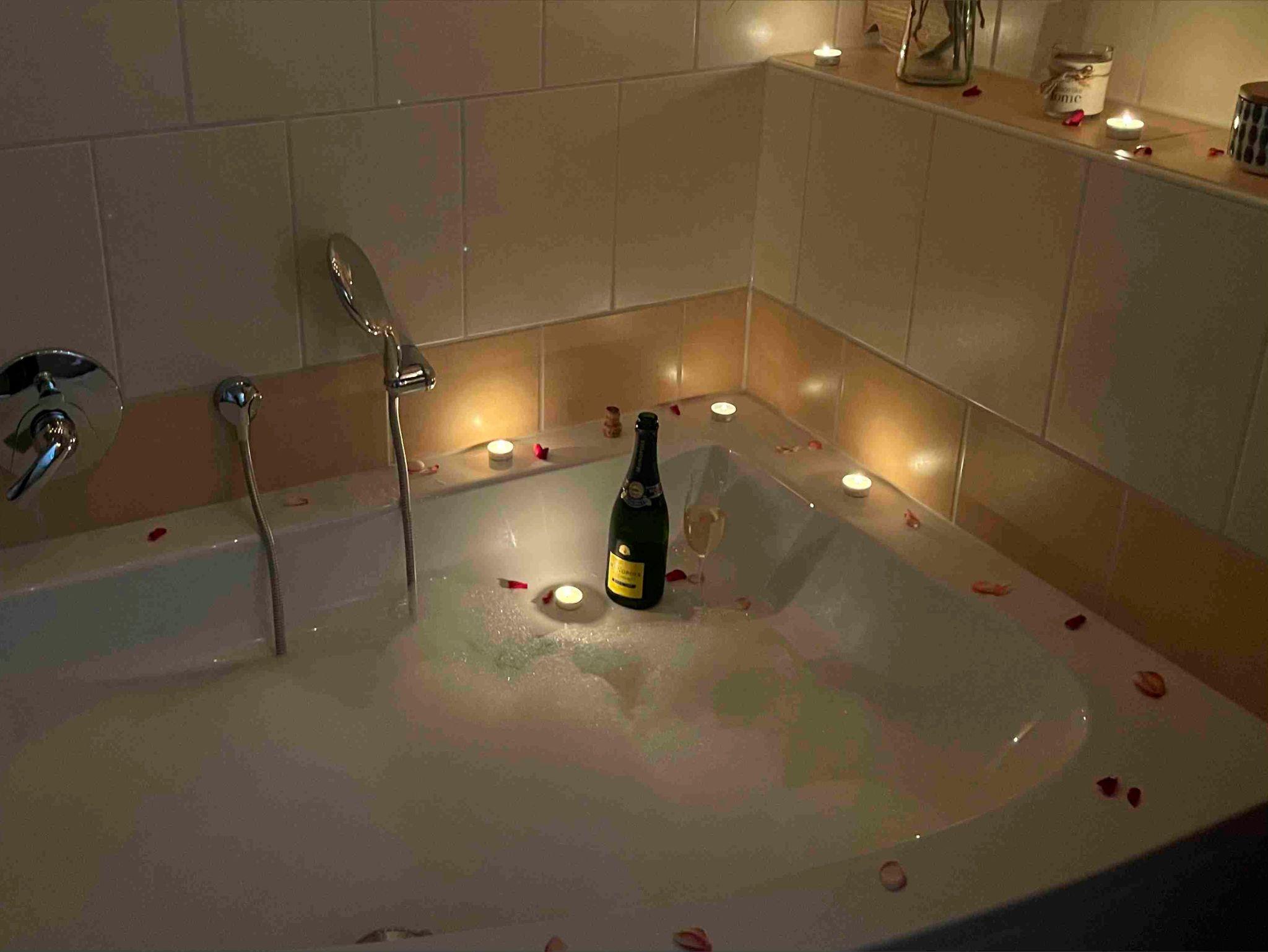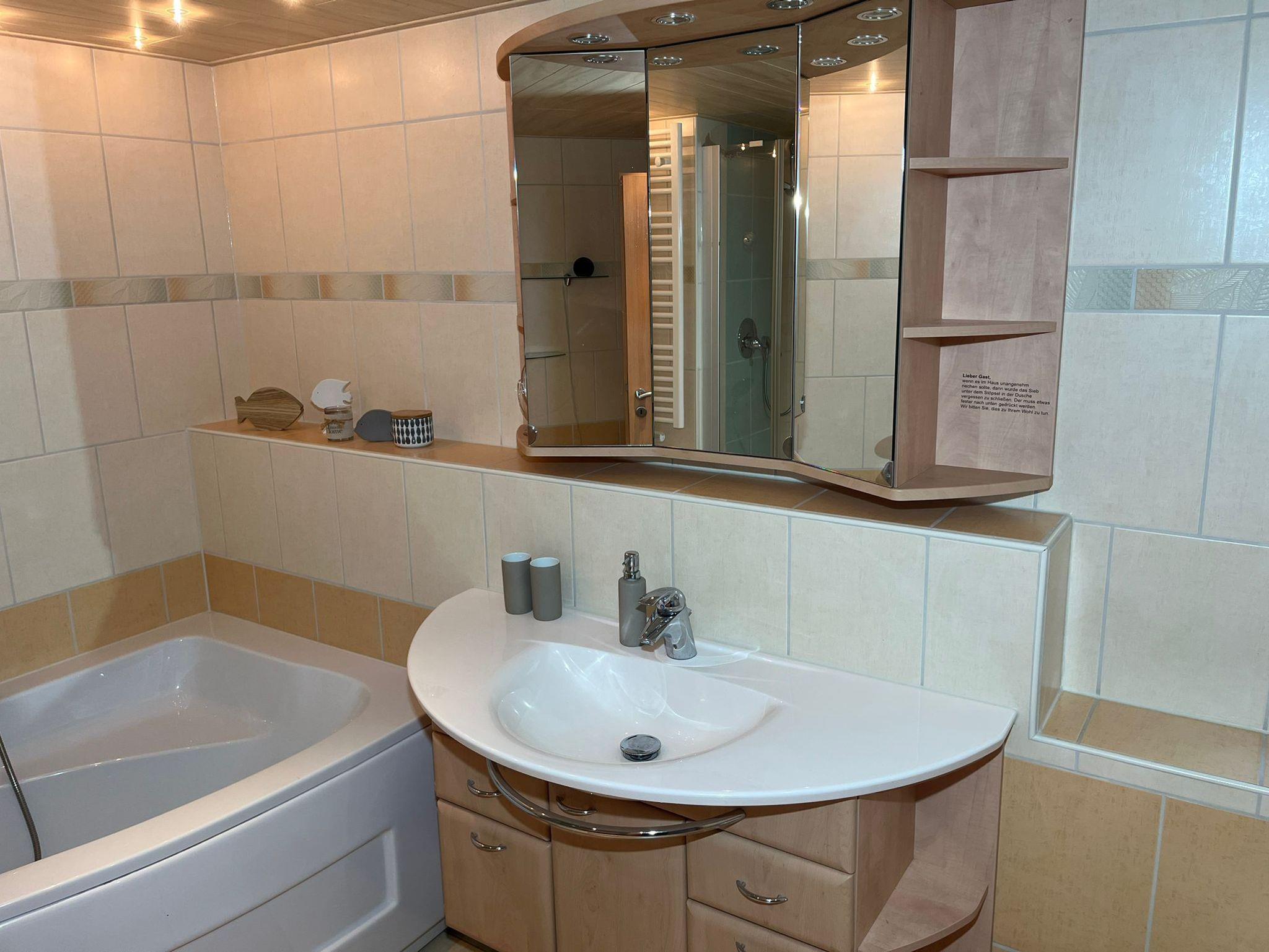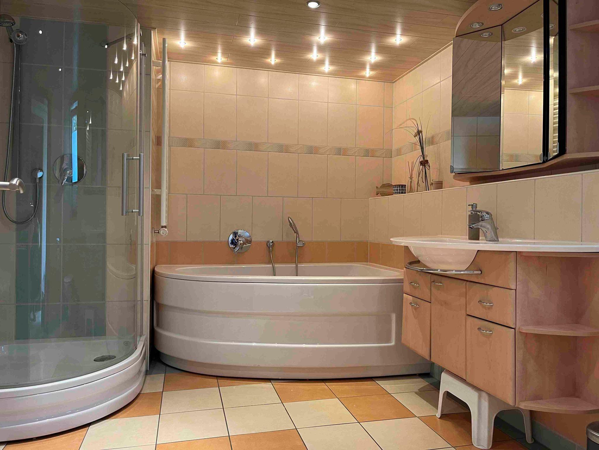 Großes Wannenbad im EG mit separater Dusche und Fußbodenheizung
