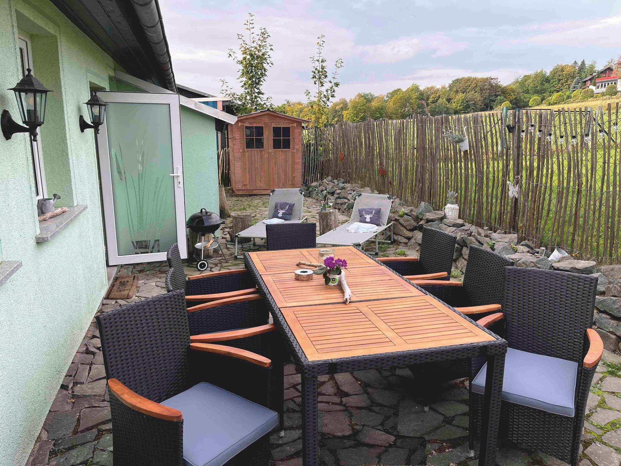 Eingezäunte Terrasse, Terasseüberdacht mit Gartenmöbeln,Holzkohlegrill und Feuerschale