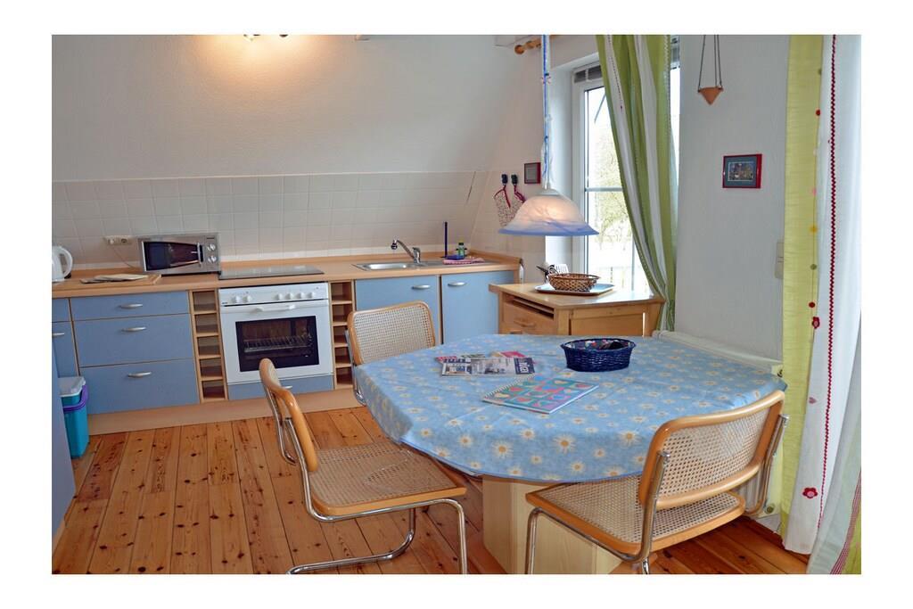 Die ca. 60 m² große Maisonette-Ferienwohnung für 3 Personen, befindet sich im ersten Obergeschoss und besteht aus einem großen Wohn-/ Essraum mit offener, voll ausgestatteter Küche (Kühlschrank mit kleinem Gefrierfach, Geschirrspüler, 4 Platten-Ceranherd, Backofen, Mikrowelle, Esstisch für 4 Personen), TV/ Sat (Flatscreen), Stereoanlage mit CD, großen Fensterfront mit Zugang zum gemütlichen Holzbalkon mit Sitzmöbeln. Abstellraum mit Waschmaschine, Wäscheständer und Bügeleisen. Bad mit Badewanne, WC und Waschbecken. Das separate Schlafzimmer im Dachgeschoss ist über eine Holztreppe erreichbar und hat ein Doppelbett mit 180 cm x 200 cm (offenes Fußende), sowie ein Schlafsofa mit einer Liegebreite von 140 cm und einen Kleiderschrank. Die Ferienwohnung ist sehr großzügig, hell und mit einem Holzfußboden und einem drehbaren Bar-Fernsehcenter ausgestattet.