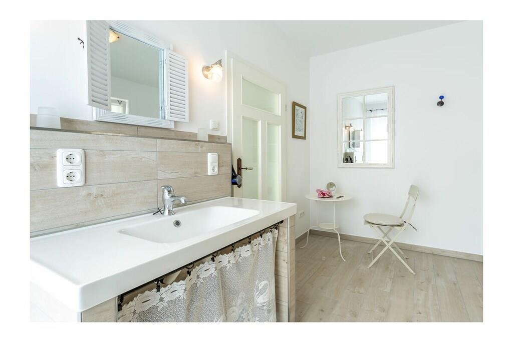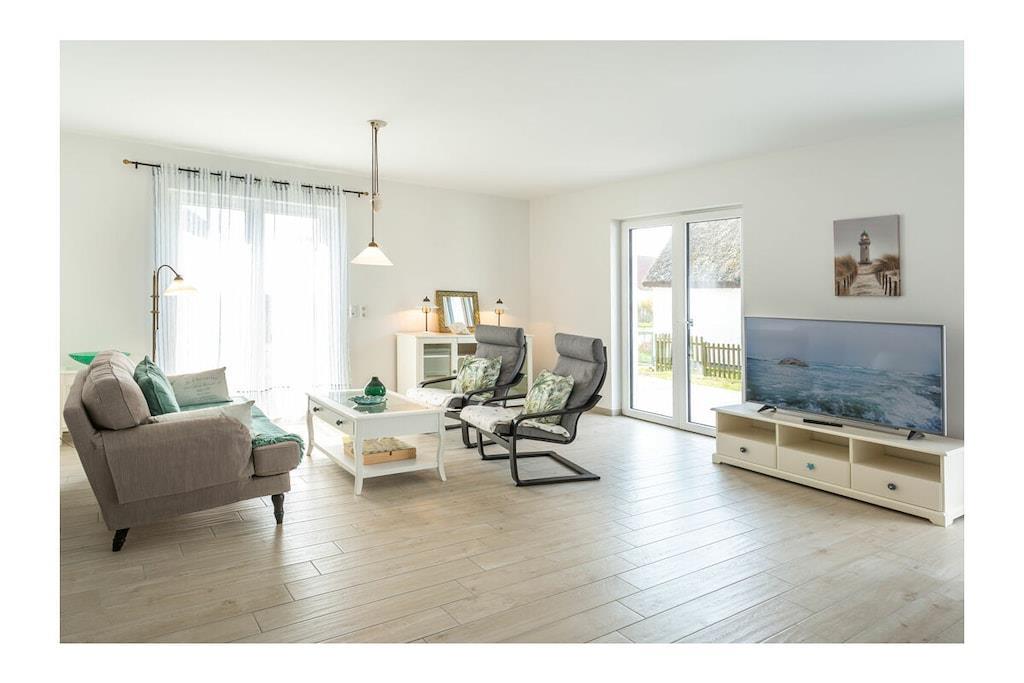 Die Unbeschwertheit des Urlaubs genießen mit viel Licht, viel Luft, viel Sonne. Es erwartet sie ein großzügiger Wohn- & Essbereich (33,74 m²) mit 3 großen Terrassentüren nach Süden und Westen. Eine gemütliche Couch und zwei Sessel laden zum Entspannen ein, zum Fernsehen (TV/Sat, 55 Zoll Flatscreen/ Smart-TV), Internet Surfen (kostenloses WLAN ) oder zu lustigen Spieleabenden (Gesellschaftsspiele vorhanden). Die große, 5m lange, voll eingerichtete Einbauküche (mit direkter und indirekter Beleuchtung) verfügt über einen 4-Plattenherd (Ceran), Backofen, Kühlschrank, Gefrierschrank, Geschirrspüler und weitere diverse Elektrogeräten wie eine Kaffeemaschine, Wasserkocher, Toaster, Eierkocher. Ein Schlafzimmer ist mit komfortablem Doppelbett (2 getrennte Matratzen je 90 x 200) und geräumigem Kleiderschrank mit Spiegeltüren ausgestattet und zusätzlich noch mit einem großem Schreibtisch. Die große Terrassentür ist nach Süden ausgerichtet. Das andere Schlafzimmer ist ebenfalls mit komfortablem Doppelbett (2 getrennte Matratzen je 80 x 200), geräumigem Kleiderschrank mit Spiegeltüren ausgestattet und zusätzlich einem kleinem Tisch. Die beiden Fenster sind nach Osten ausgerichtet und mit Rolläden versehen. Das Badezimmer mit WC bietet einen großzügigen 140cm x 140cm großen ebenerdigen Duschbereich und eine Sitzecke für bequeme Körperpflege. Kosmetikspiegel, Föhn und Wäscheständer sind vorhanden. Das Fenster geht nach Osten und die große Terrassentür nach Süden. Alle Terrassentüren in der Wohnung sind mit elektrisch bedienbaren Rollläden abdunkelbar.. Im Flur befindet sich die Garderobe mit Spiegel, Schuhbank und Schirmständer. Die 25m² große Terrasse mit Blick auf den Bodden bietet viel Platz und ist mit Gartenmöbel für 4 Personen und Sonnenschirm ausgestattet. Erstvermietung April 2019. Die Wohnung besitzt einen eigenen Hauseingang mit barrierefreier Zuwegung. Die Wohnung ist eine Nichtraucherwohnung. Sie ist ganz in weiß eingerichtet, was sie sehr leicht und luftig wirken lässt. Wunderschöne Fliesen in Holzoptik (weiß gekalkte Buche) machen sie außerdem pflegeleicht. Alle Räume haben Fußbodenheizung. Die auf der Nordseite des Hauses vorhandene Remise ist abschließbar und kann für das Abstellen von Fahrrädern genutzt werden. 1 beleuchteter PKW- Stellplatz steht ebenfalls auf der Nordseite des Hauses zur Verfügung. Der Hafen von Breege (nur 250 Meter entfernt) ist ein beliebtes Ausflugsziel und Startpunkt für Fährfahrten nach Hiddensee und Ralswiek zu den Störtebeker Festspielen. Einkaufsmöglichkeiten, Bäcker und Restaurants sind in unmittelbarer Nähe. Es gibt optimale Rad- und Wandermöglichkeiten, um die Insel zu erkunden. Haustiere sind mit Rücksicht auf Allergiker leider nicht gestattet.