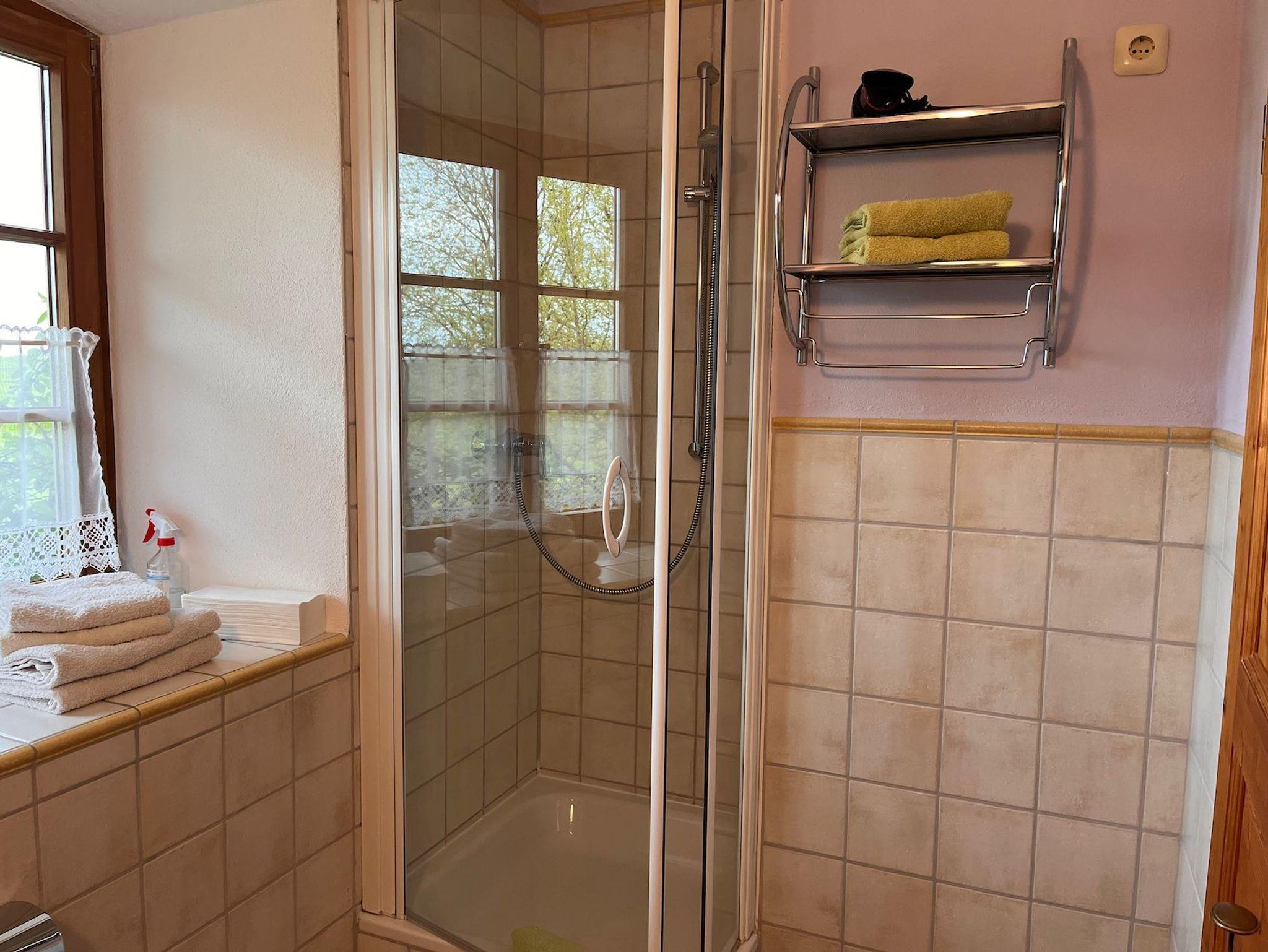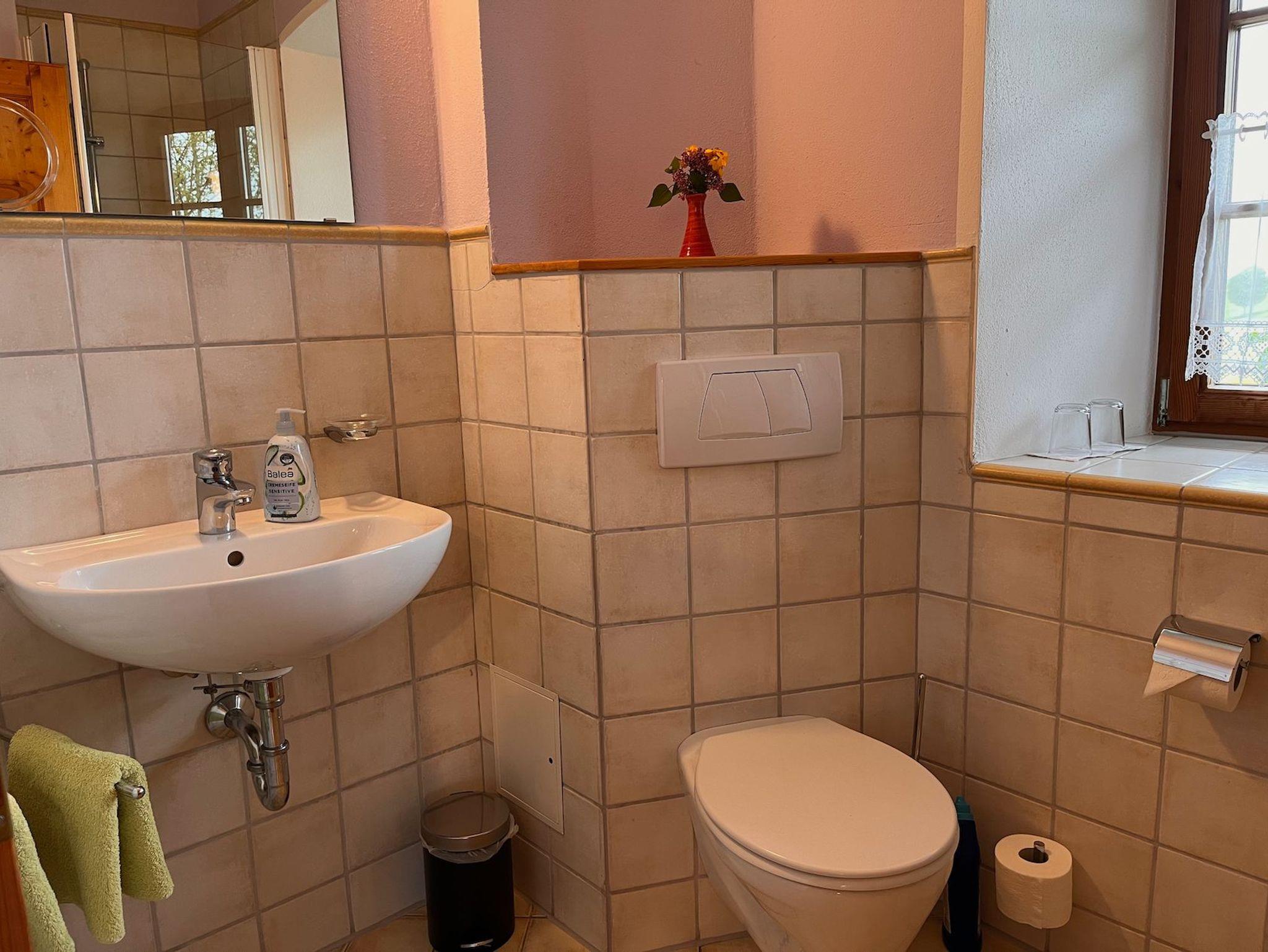 Die Ferienwohnung mit 52 qm befindet sich im 1. Obergeschoss und ist aufgeteilt in eine kleine Wohnküche mit Esstisch und einer gemütlichen Couch zum Ausspannen. Das separate Schlafzimmer ist im bayerischen Stil eingerichtet, mit Doppelbett und einem Etagenbett, sowie einem kleinen Badezimmer mit Dusche und WC. Auf dieser Etage haben Sie über den Hausgang Zugang zum Gemeinschaftsbalkon, mit einem herrlichen Blick nach Süden auf die Berge und den Garten.