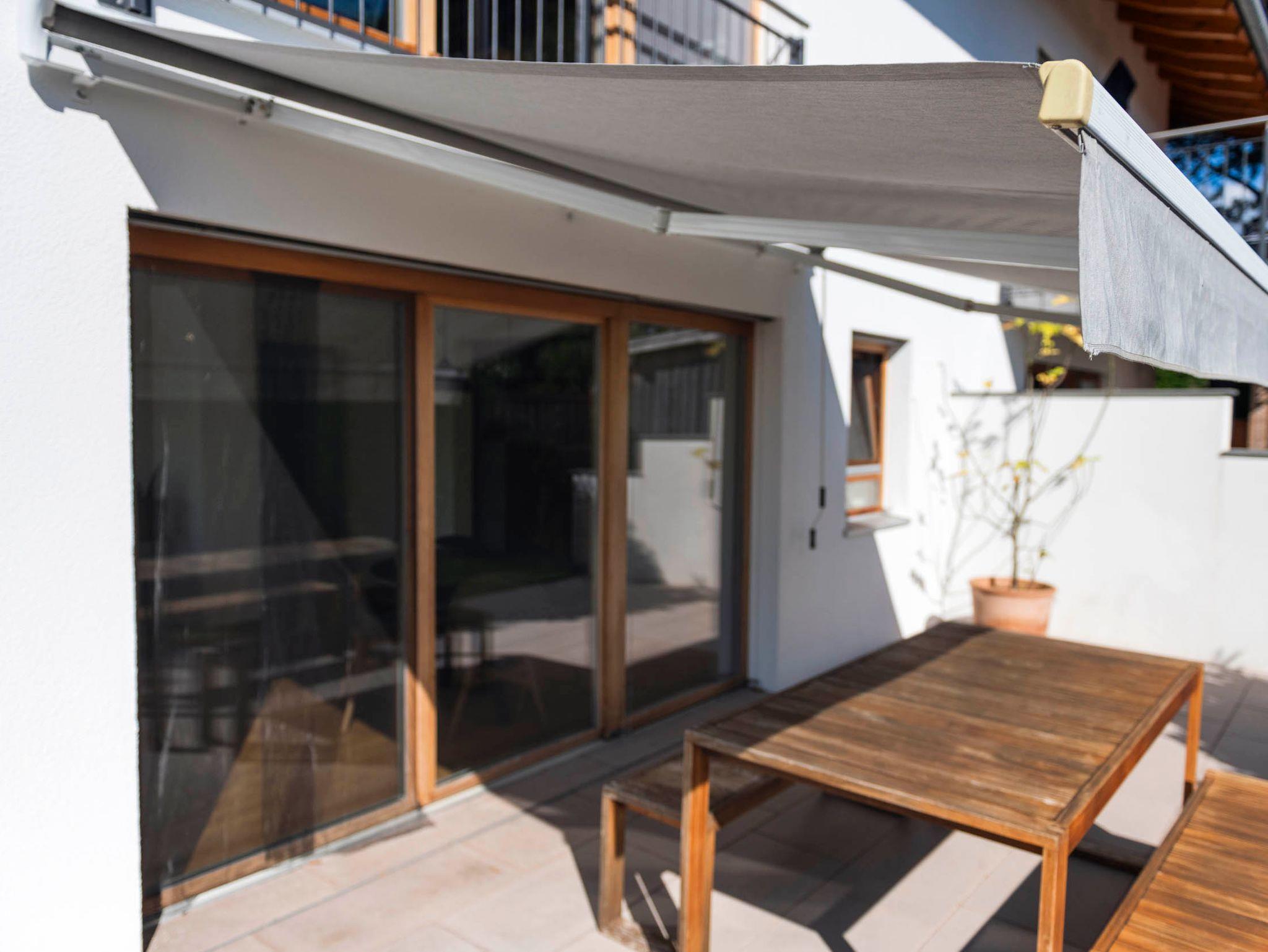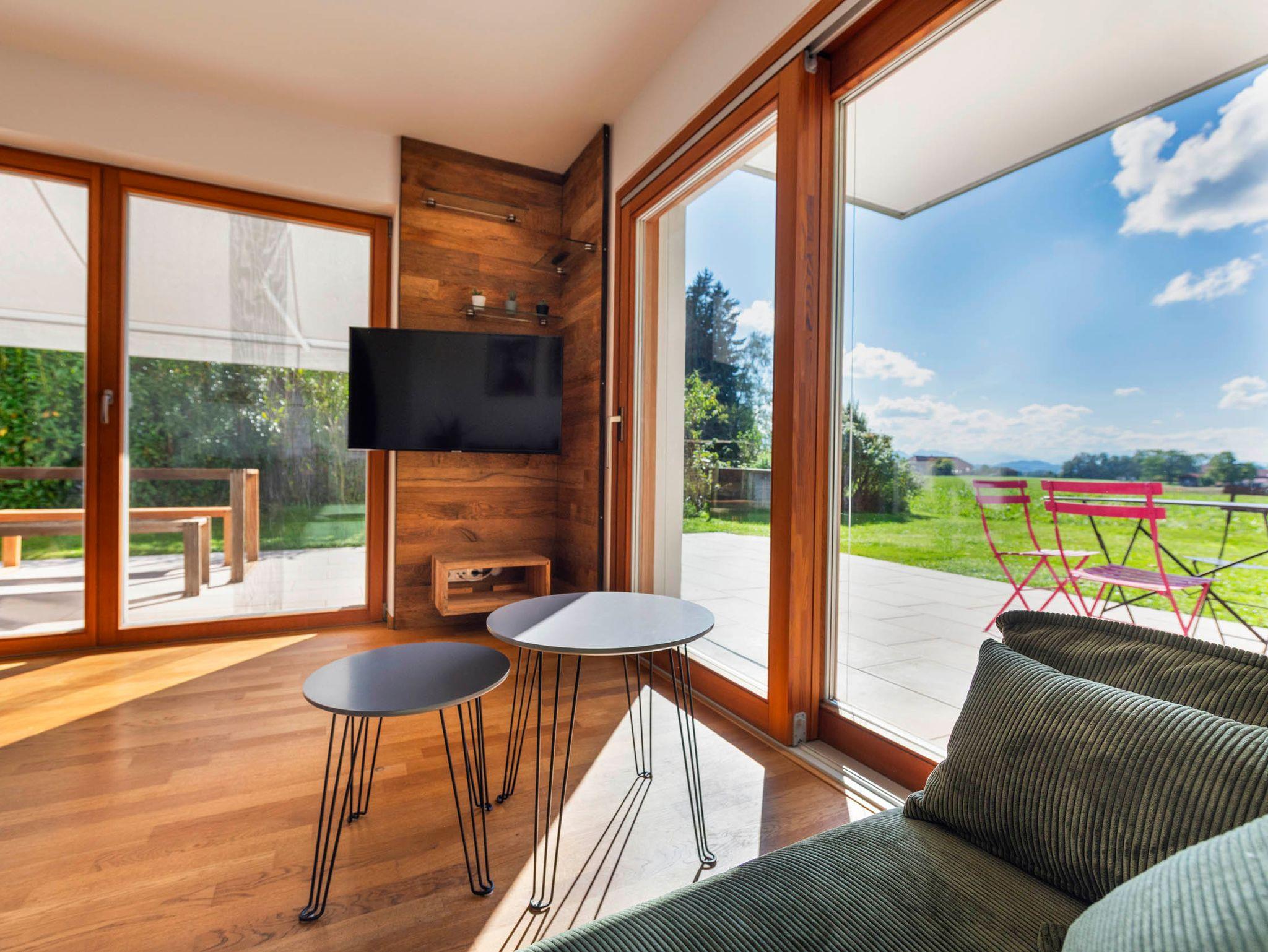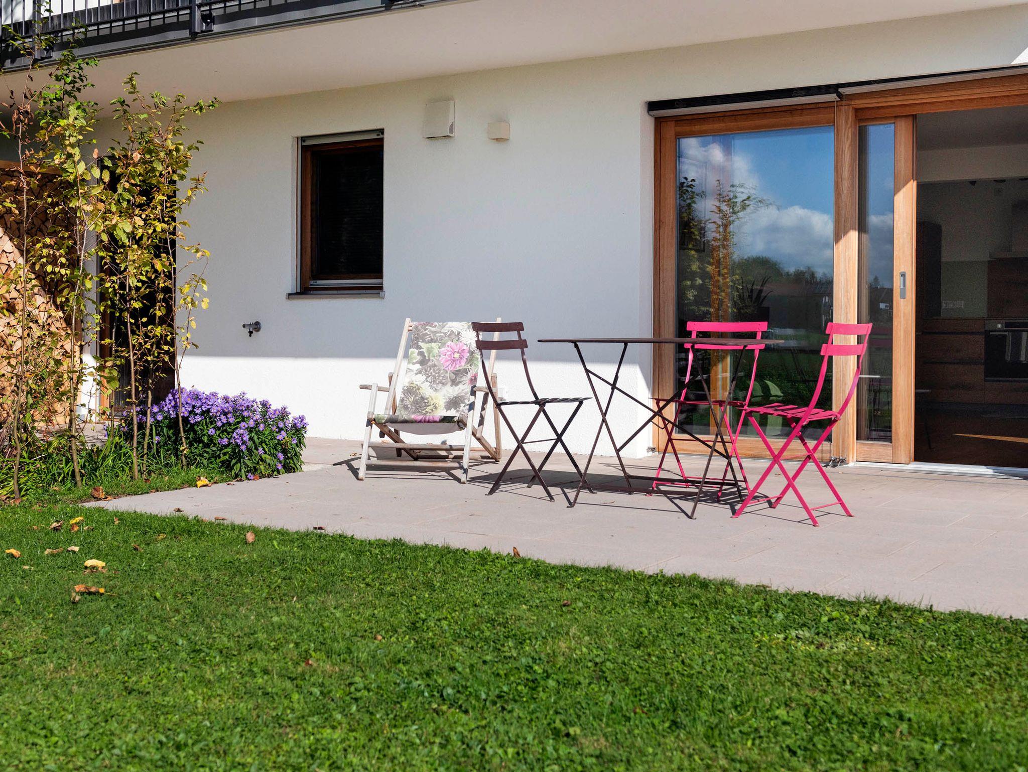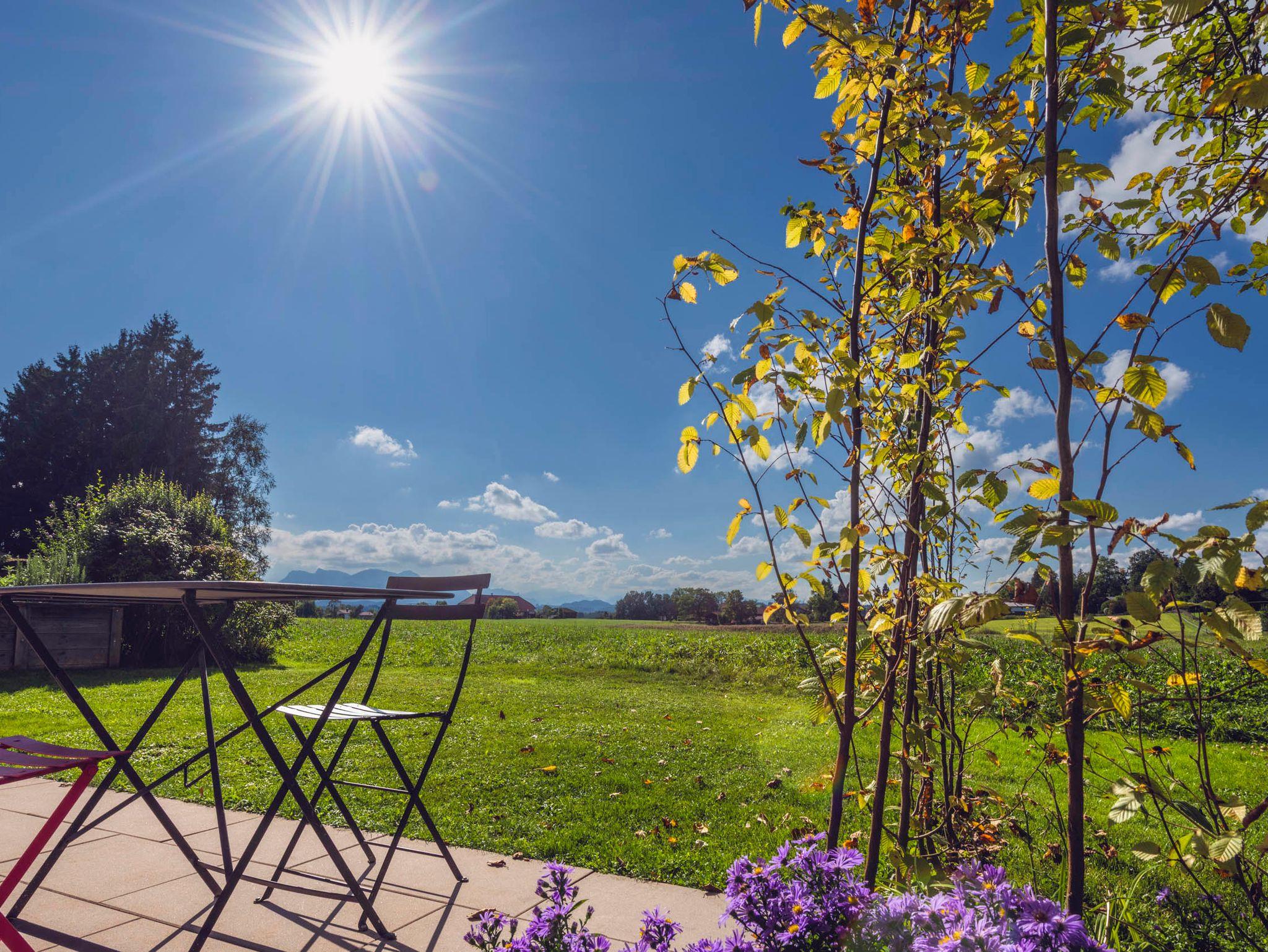 Auf der großen Terrasse genießt ihr den Blick in die Berge – perfekt für einen Kaffee im Sonnenaufgang oder am Abend ein Glas Wein im Sonnenuntergang.