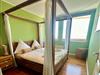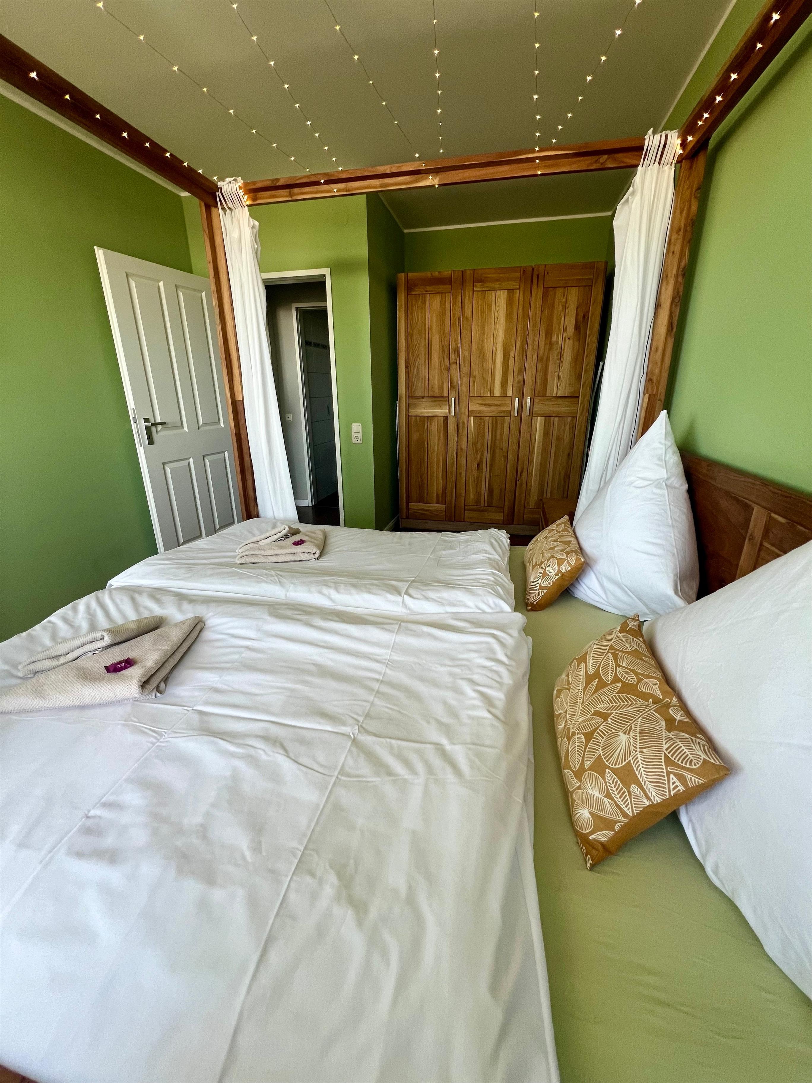 Ein Himmelbett mit Sternenhimmel im Schlafzimmer und eine bequeme Schlafcouch im Wohnzimmer bieten Platz für 2 bis maximal 4 Personen.
