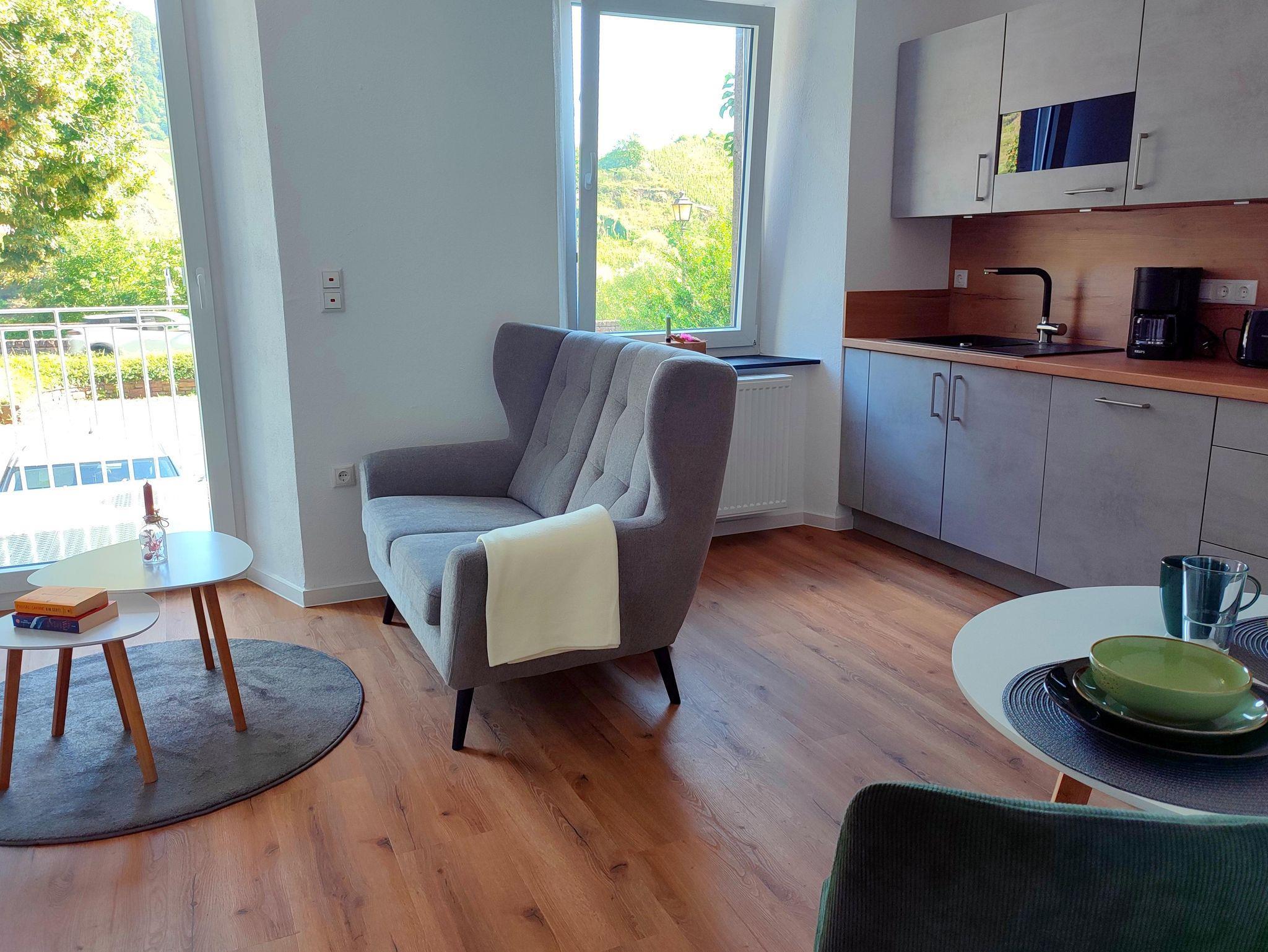 Der absolute Höhepunkt der Ferienwohnung in Bremm ist der private Balkon, der vom Wohnzimmer aus zu erreichen ist. Hier können Sie den ersten Kaffee des Tages in der ruhigen Morgenstunde genießen oder den Tag mit einem Glas Wein bei Sonnenuntergang ausklingen lassen, während Sie den Blick auf die malerische Mosel-Umgebung schweifen lassen.