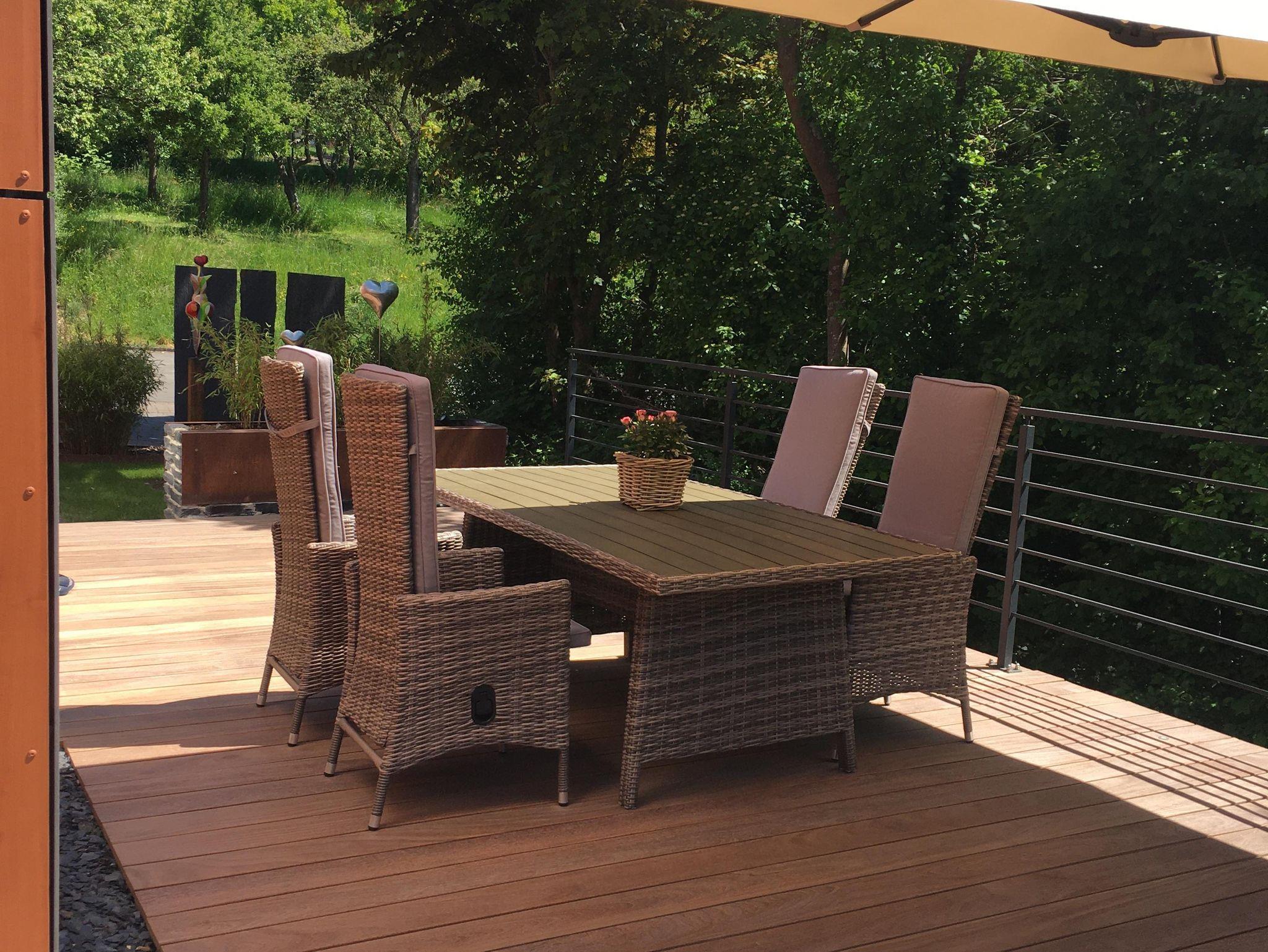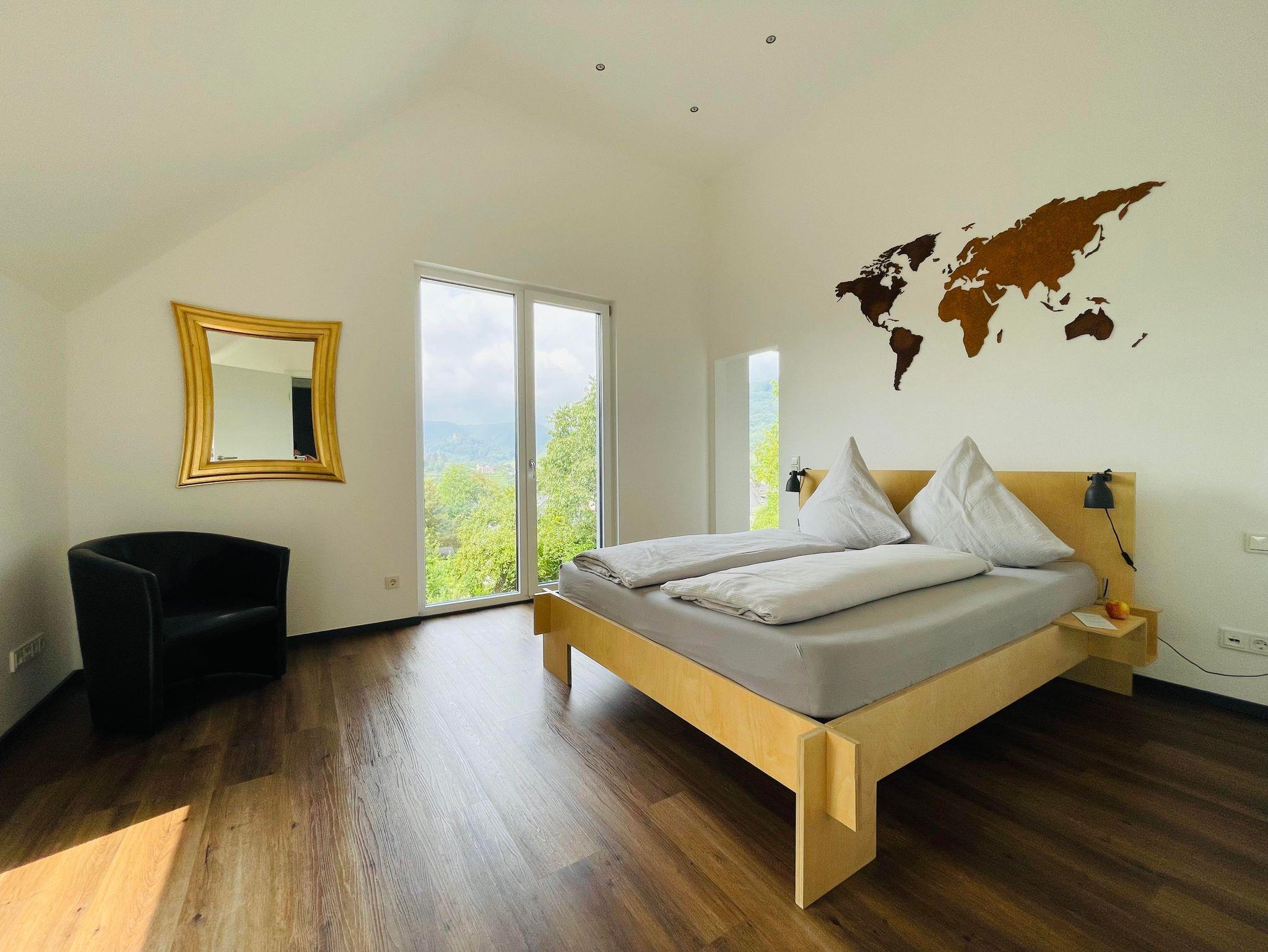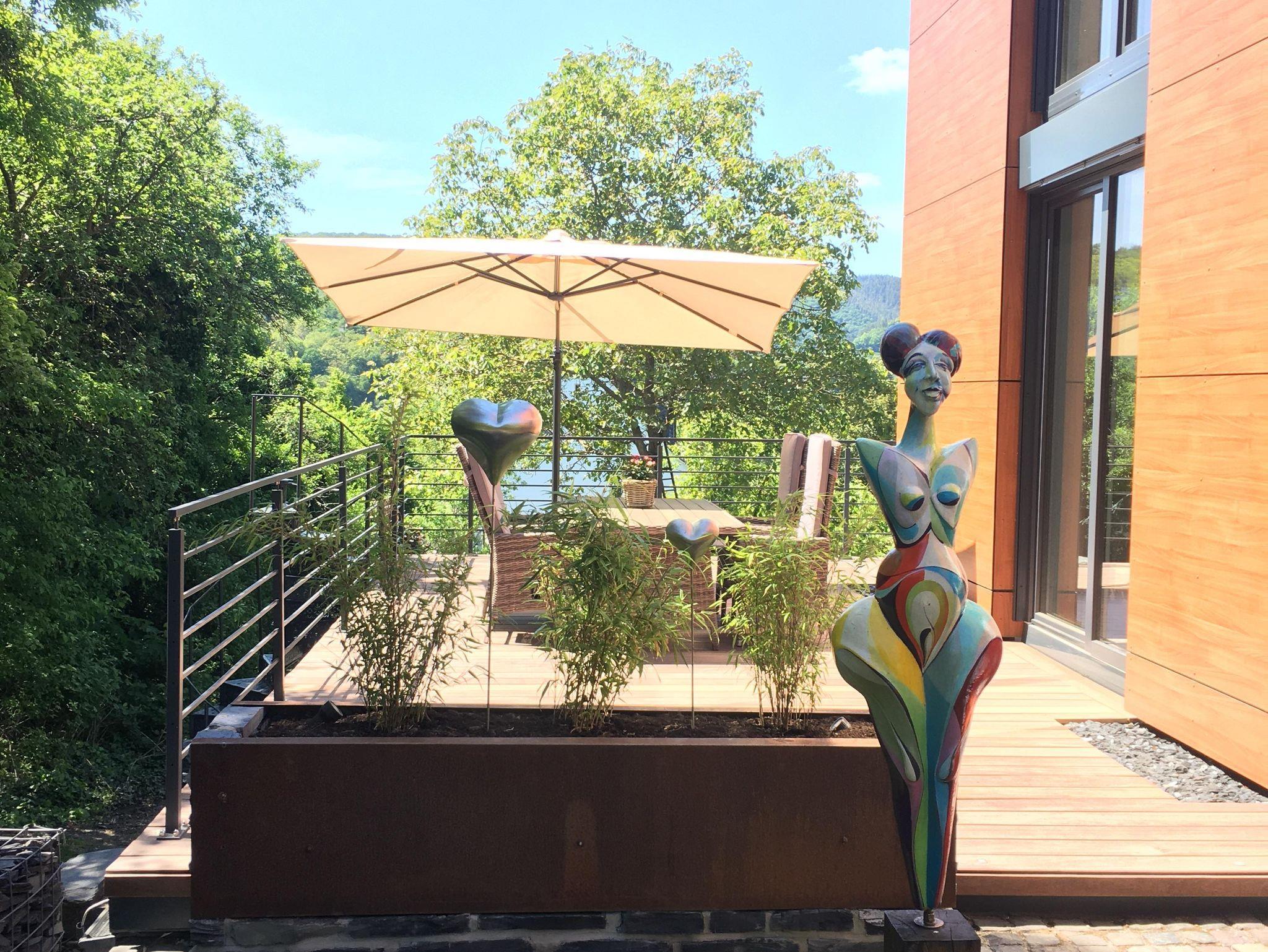 Unsere Gäste haben die Möglichkeit durch die großzügigen und lichtdurchfluteten Räume, der großflächigen Fensterfront zur Terrasse hin, sich in angenehmer Privatsphäre aufzuhalten und den Blick auf die Weinberge und Burg Arras zu genießen.