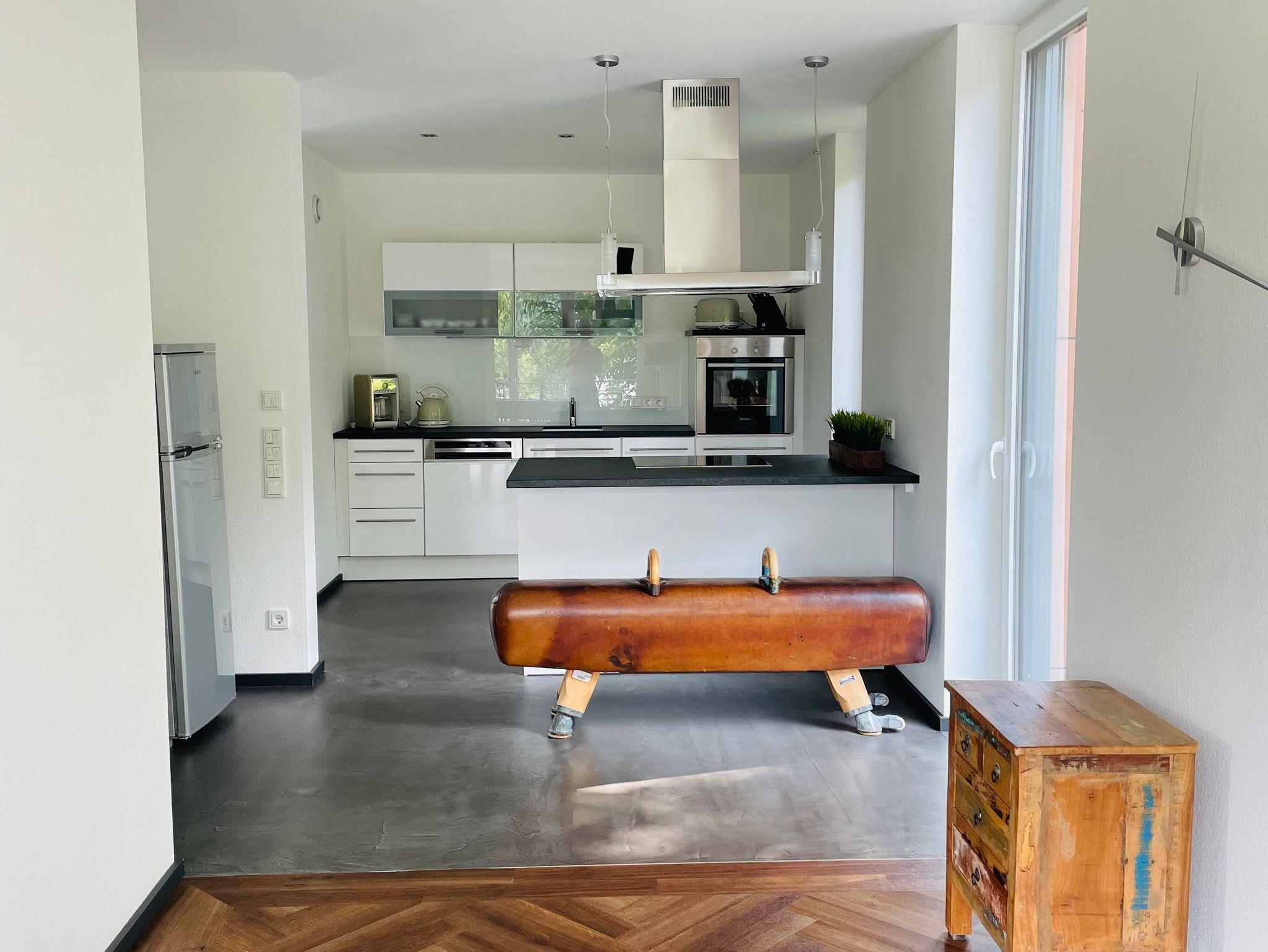 großer heller Wohnbereich mit Flachbildschirm-Fernseher
