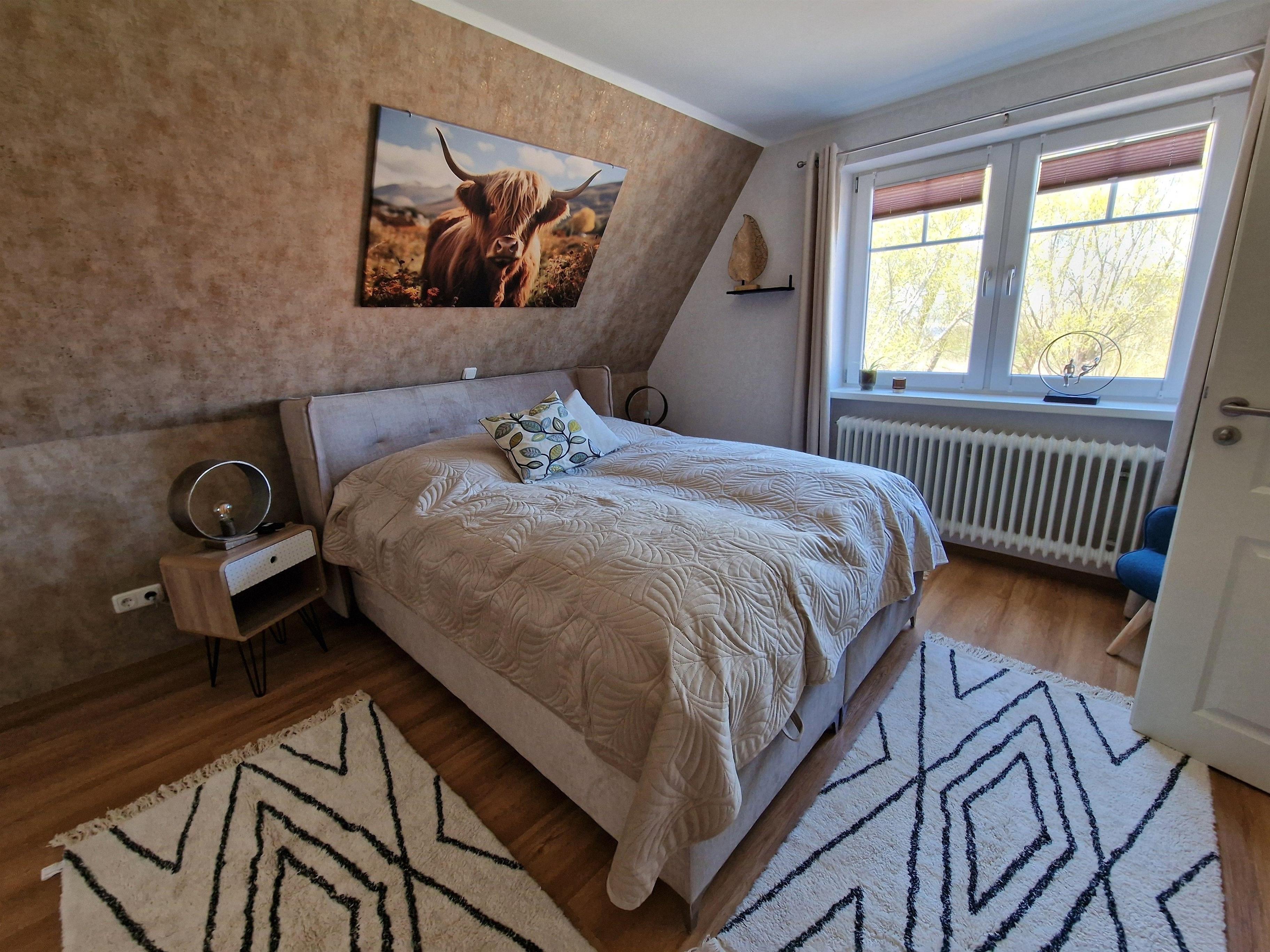 Das Schlafzimmer ist ausgestattet mit einem Boxspringbett der Größe 160x200.