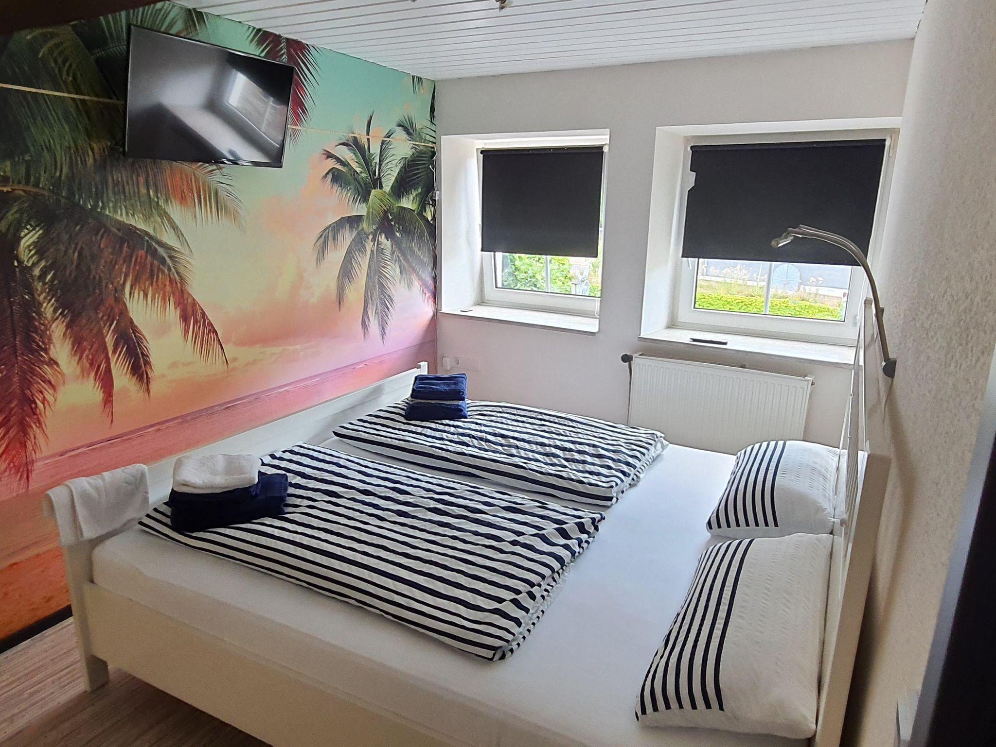 Die Wohnung hat ein Schlafzimmer mit einem 180x200cm Doppelbett, ein Kinderzimmer mit einem Etagenbett 2x90x200m und einer Zusatzmatratze in einer Schublade 90x190, ein Badezimmer mit Dusche, Badewanne, WC, Waschmaschine, Fön, 1 Gäste WC, 1 großer Wohnbereich mit Sofaecke, offene Küche, Essecke und iner Nische mit einem Bett 160x200m. Das Sofa hat auch eine Schlaffunktion. 1 großer Fernseher, Stereo Anlage und 1 große Terrasse mit Moselblick.