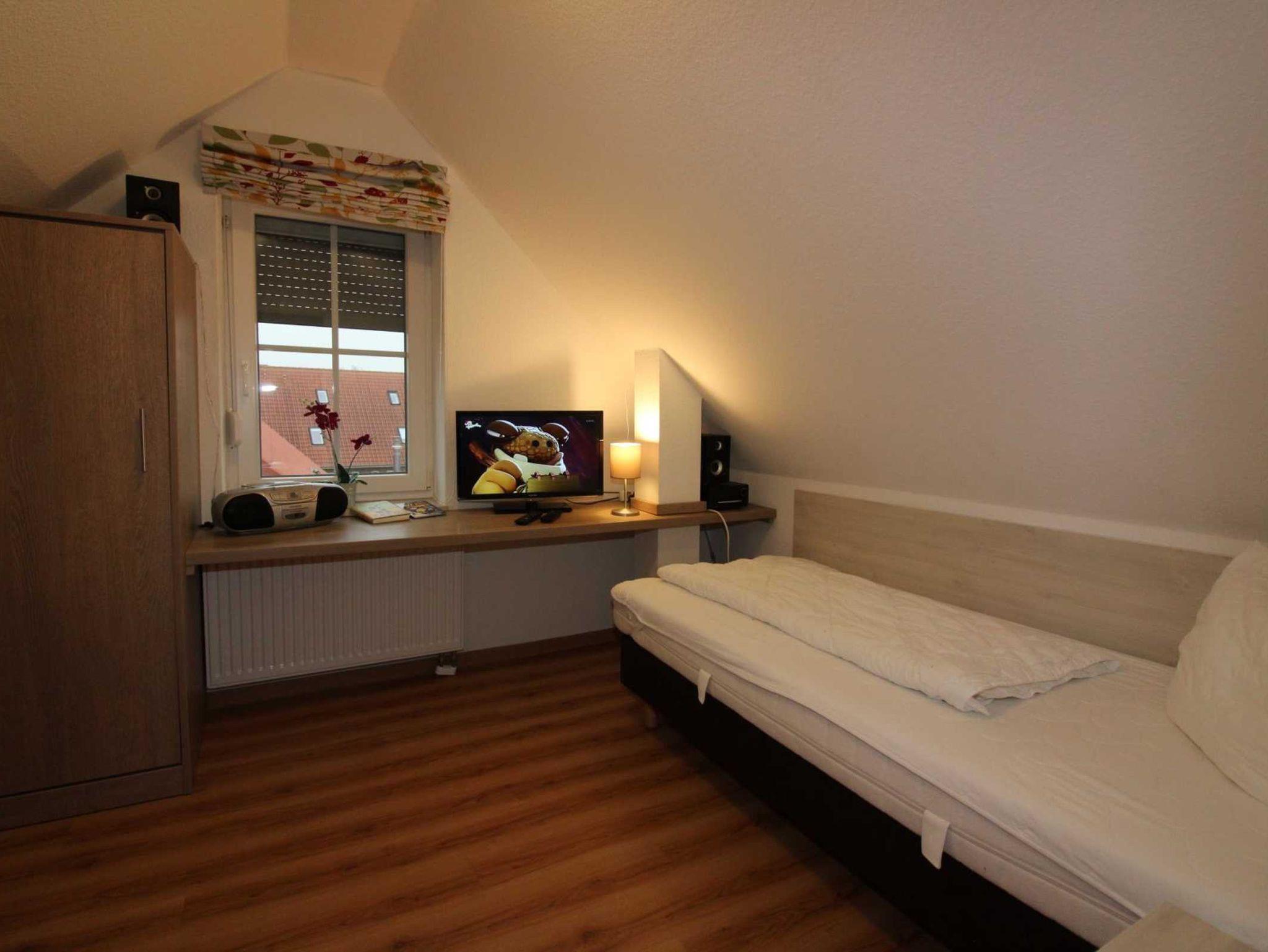 ein Schlafraum mit zwei Einzelbetten (und Kabel-LED-Fernseher)