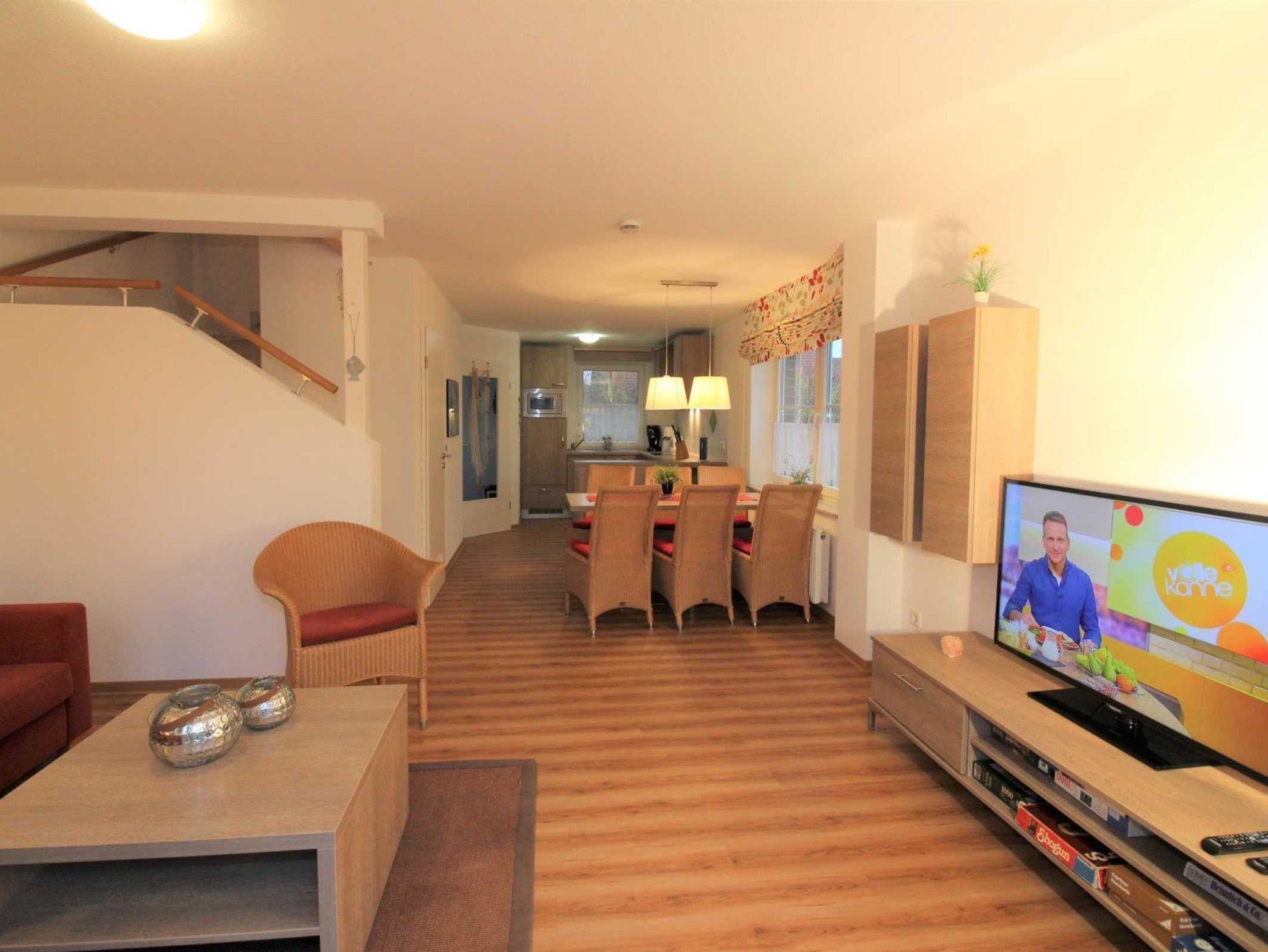 Wohnraum mit bequemer Couchgarnitur, Gaskamin, Kabel-LED-Fernseher, Stereoanlage mit CD, MP3 und USB-Anschluss