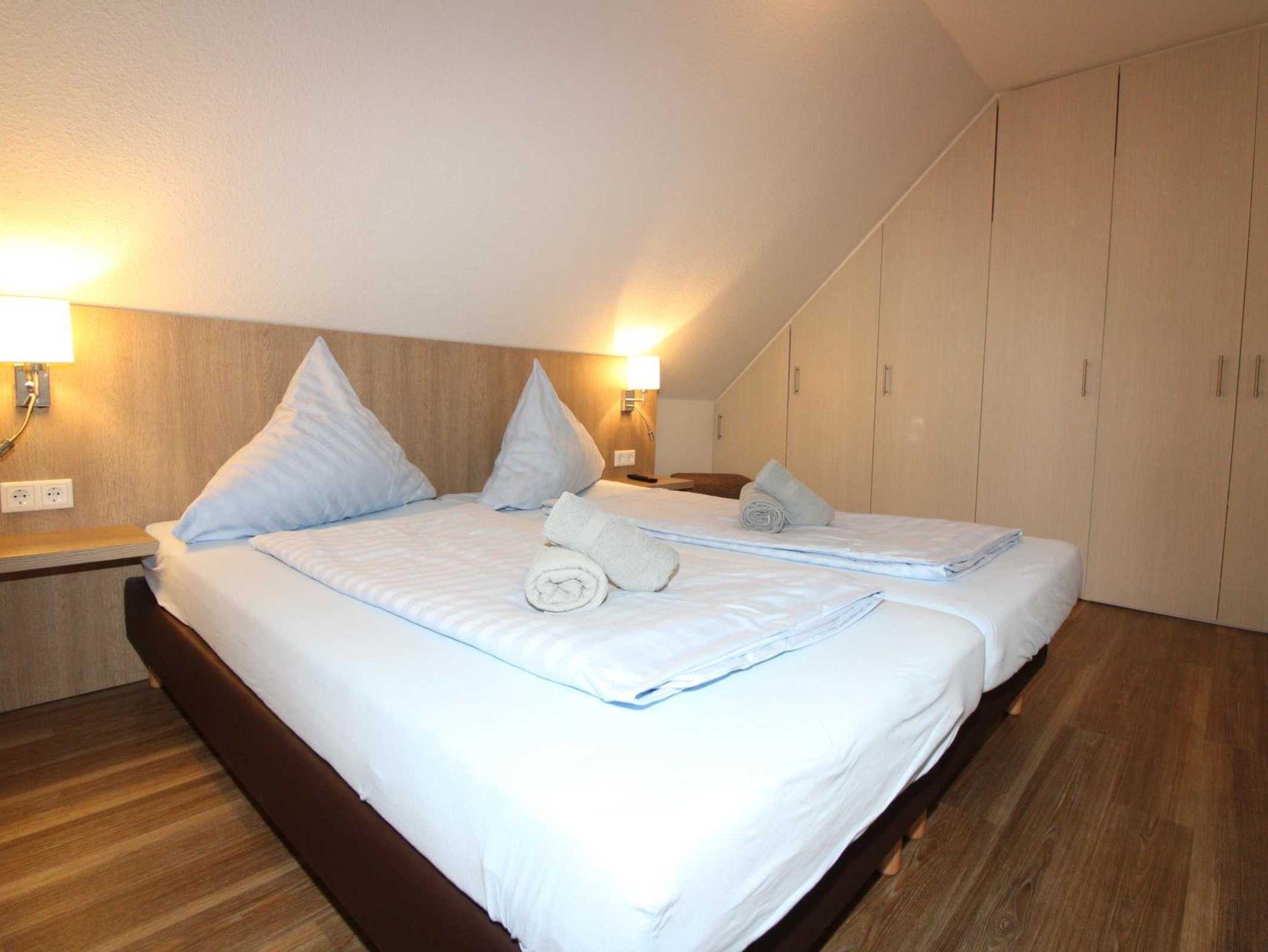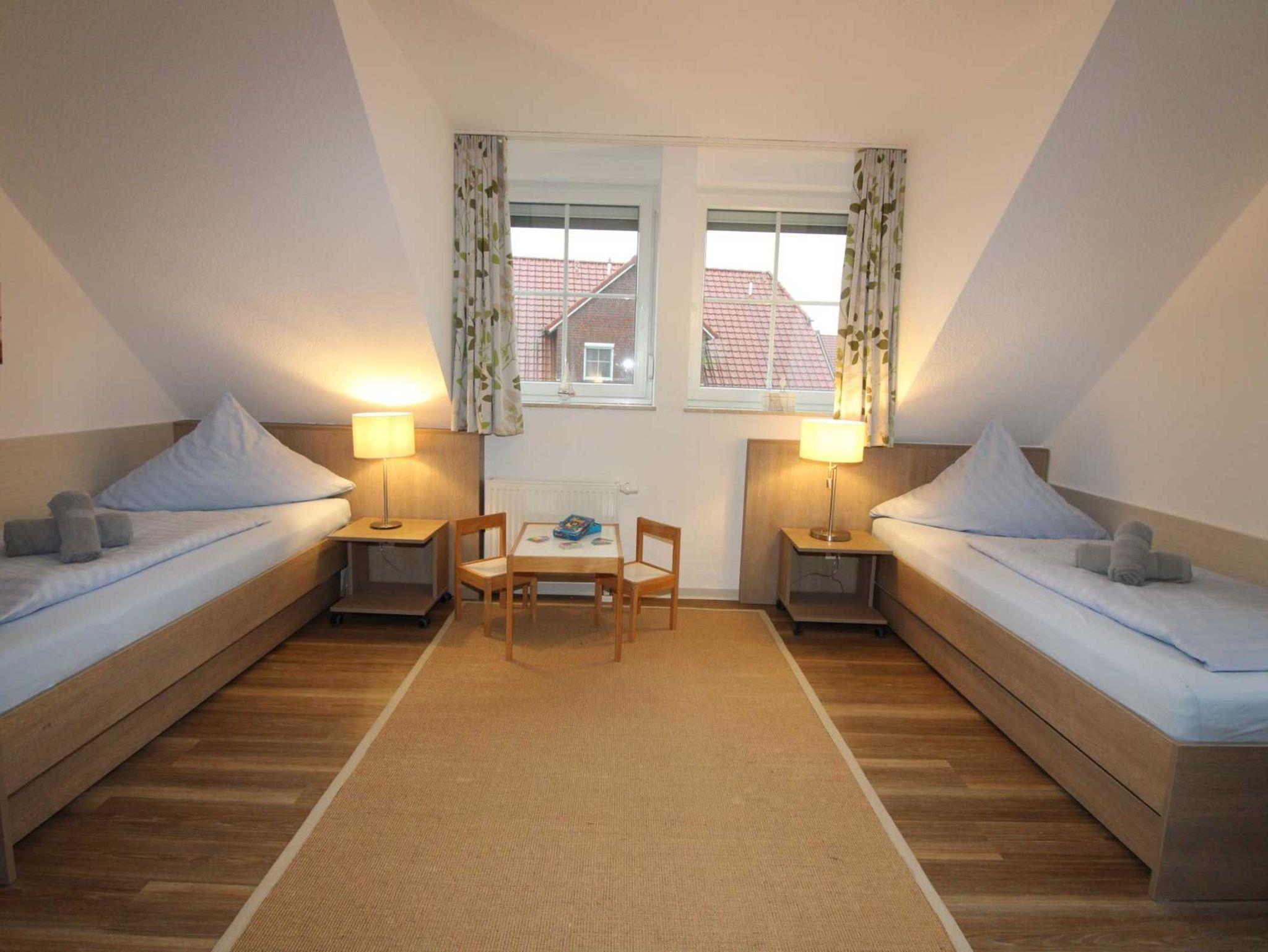 2. Schlafraum mit zwei getrennten Betten, jeweils mit zusätzlichem Ausziehbett, Kleiderschrank, Schreibtisch u. Kinder-Spieltisch.