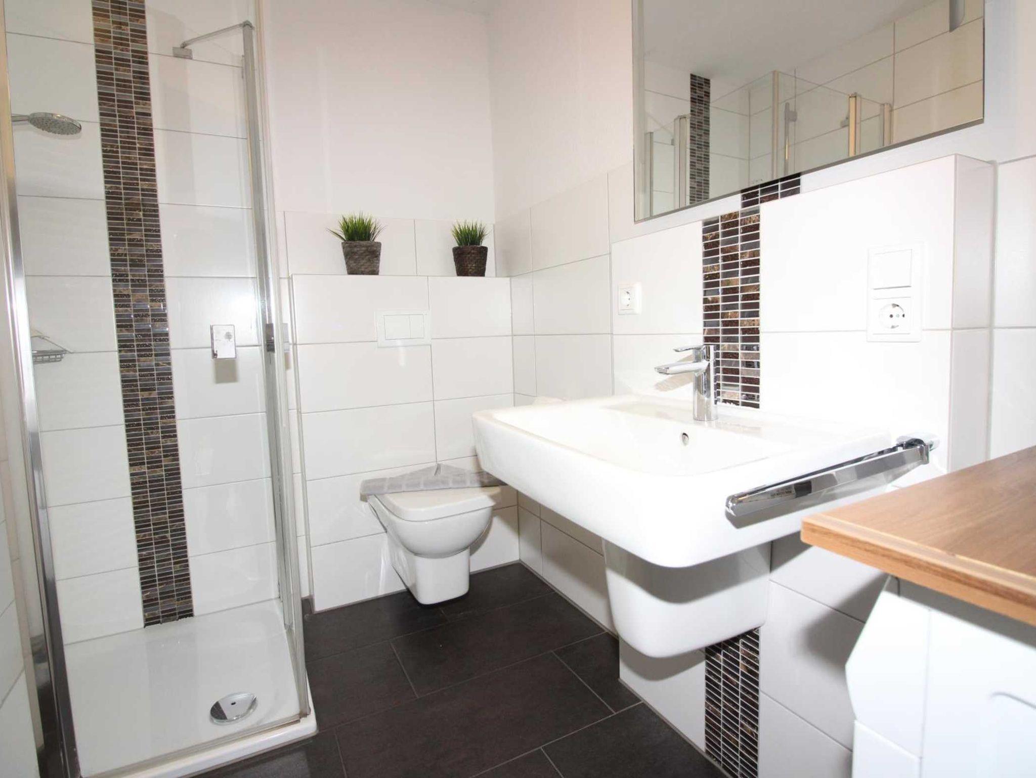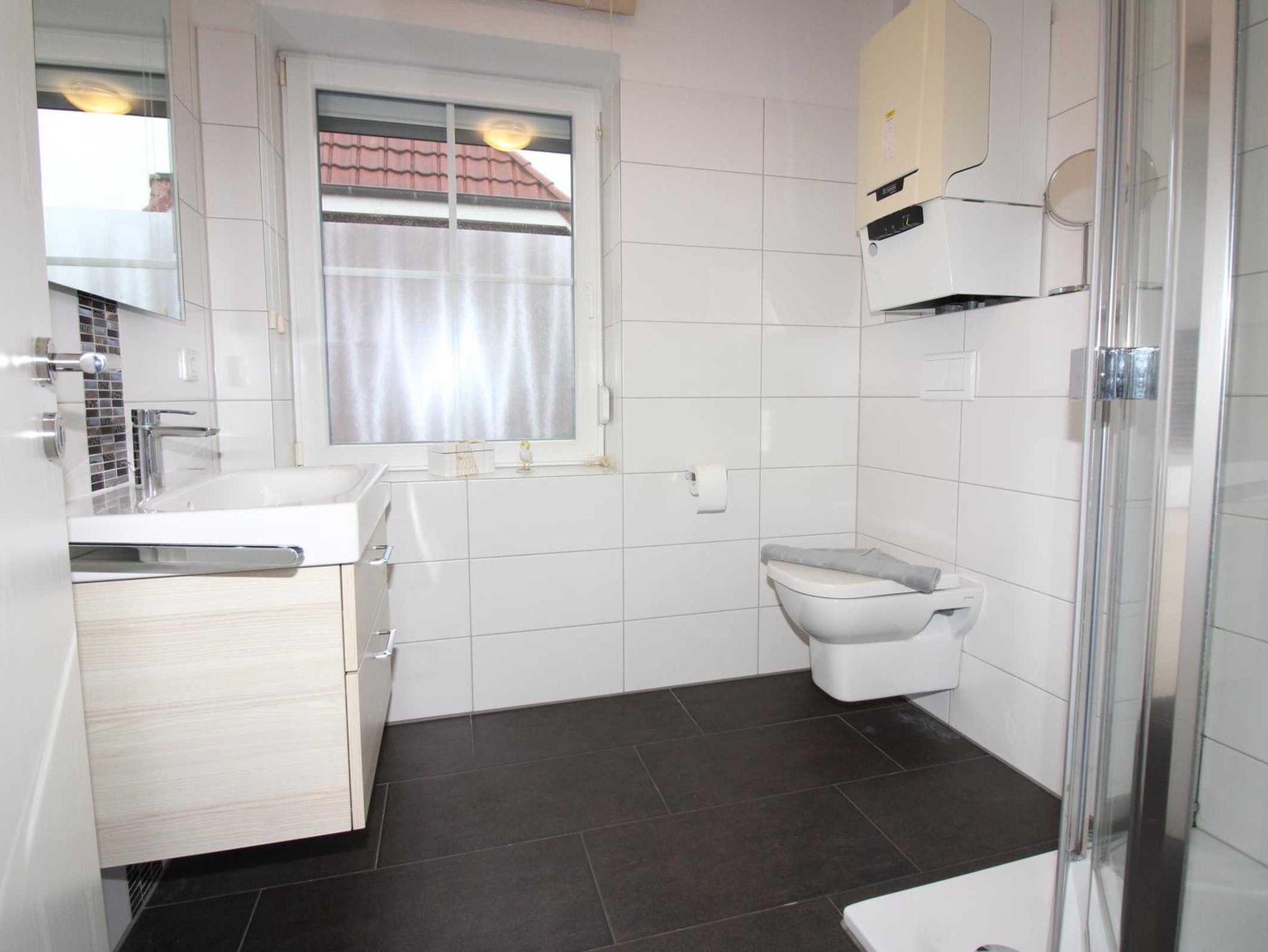 Im hochwertig ausgestatteten Bad mit Glasduschkabine, Handtuchheizkörper, Fußbodenerwärmumg, etc. befindet sich ein Waschtrockner mit Wickelablage.