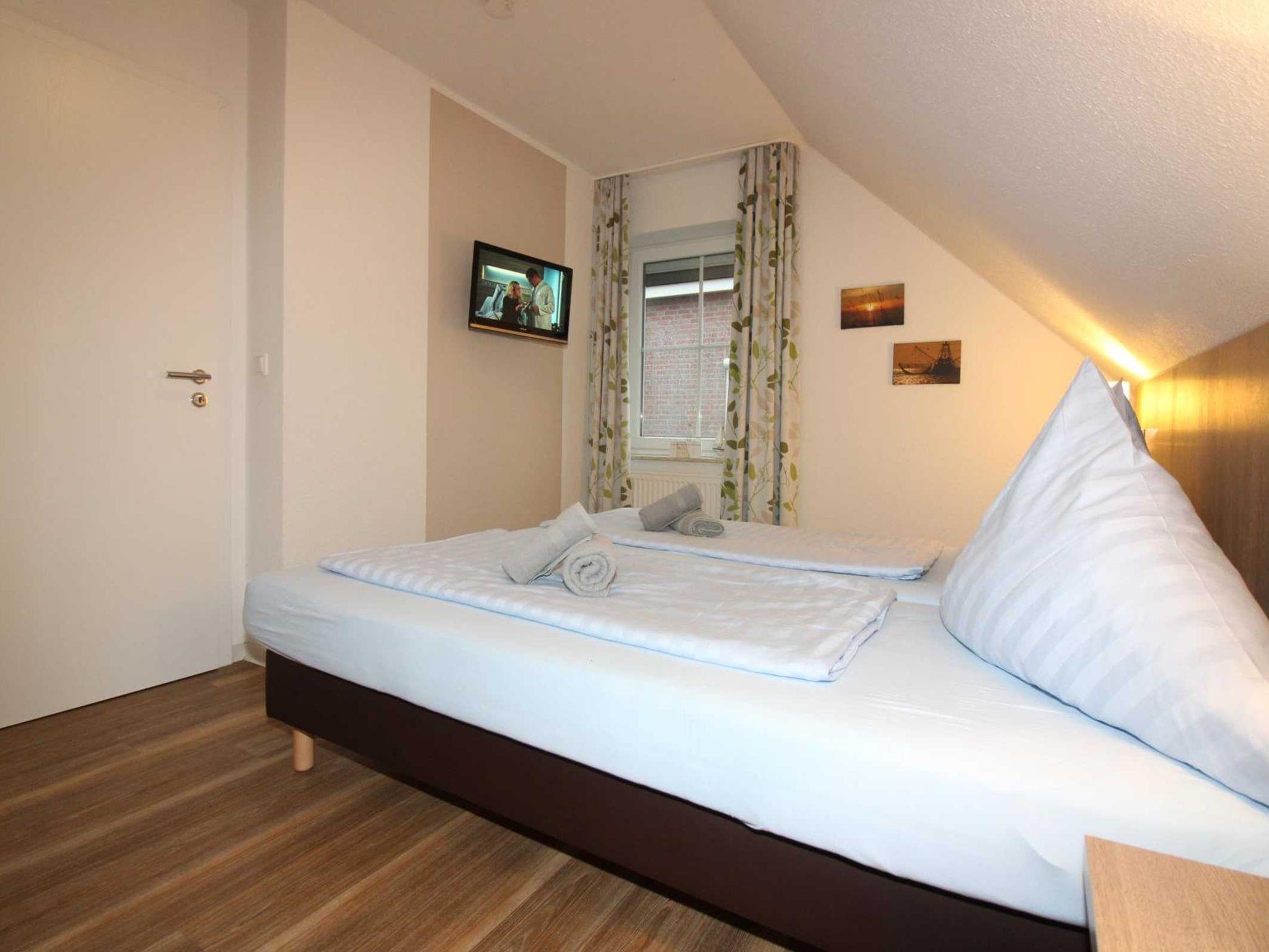 Hier befindet sich ein 3. Schlafraum mit Doppelboxspringbett, Kleiderkommode u. LED-Flachbildfernseher.