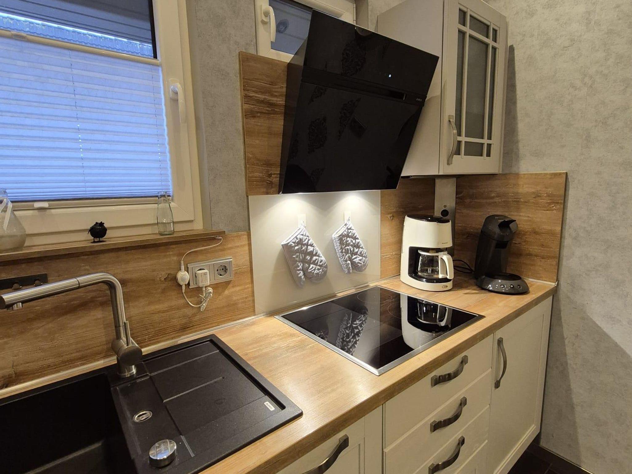 Im Erdgeschoss befindet sich ein großzügiger Wohn- und Essbereich mit einem gemütlichen Kaminofen, der auch an kühleren Tagen für eine behagliche Atmosphäre sorgt. Die moderne, hochwertig ausgestattete Küche lässt keine Wünsche offen. Das Badezimmer sowie ein Schlafzimmer mit einem Doppelbett oder zwei Einzelbetten bieten zusätzlichen Komfort.