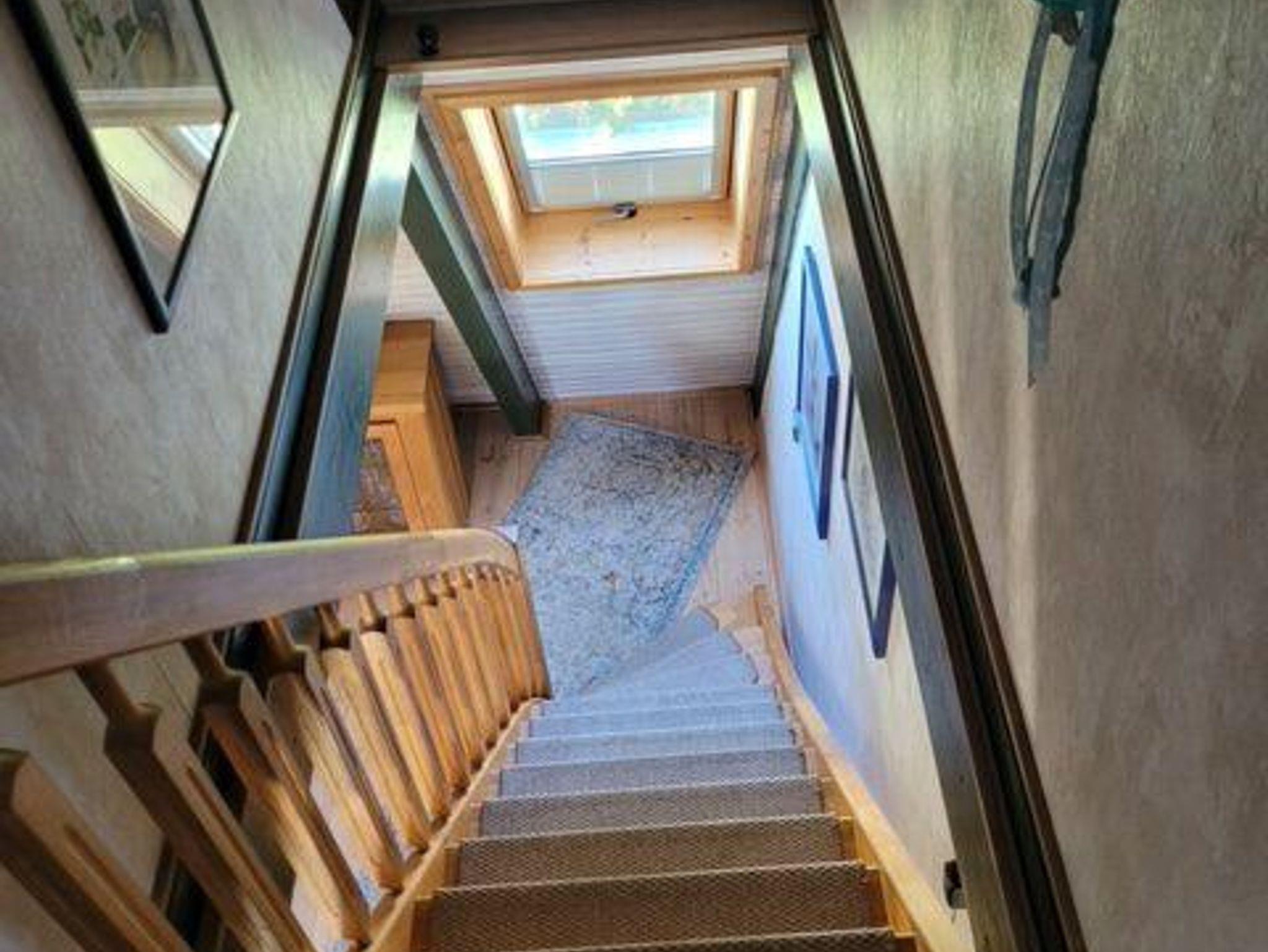 Eine elegante Holztreppe führt ins Dachgeschoss, wo zwei weitere gemütliche Schlafzimmer mit jeweils zwei Betten auf Sie warten – ideal für Familien oder Gruppen.