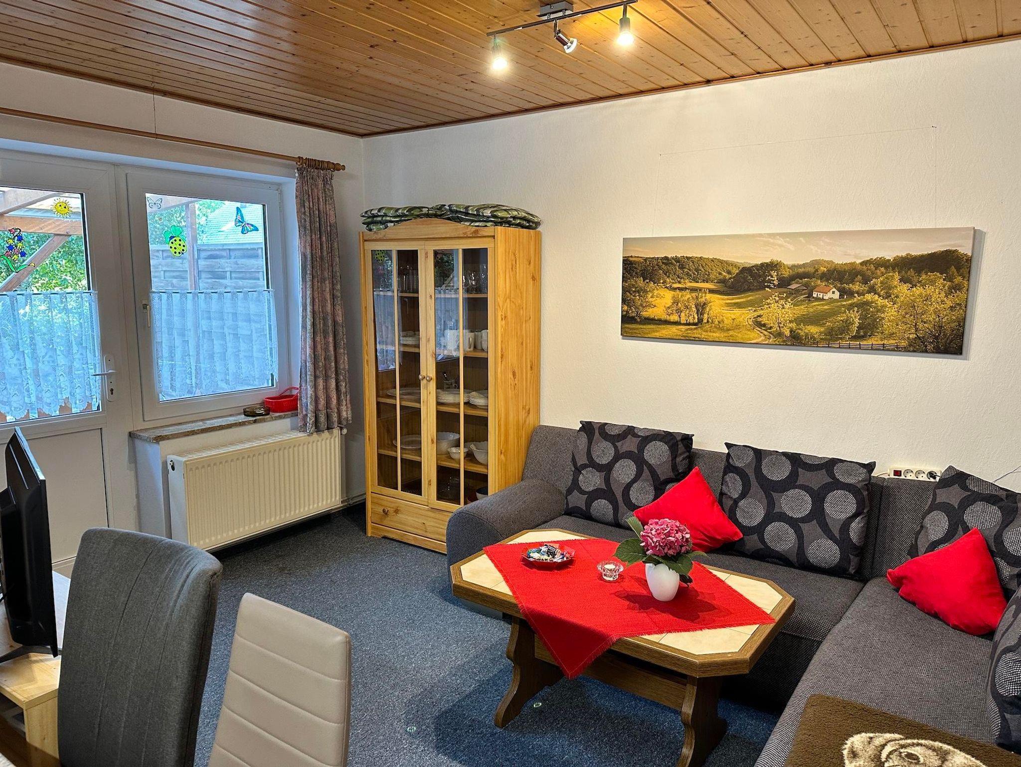 Wohnzimmer mit Couchtisch, 3 er u. 2 er Sofa, Glasschrank, Digital Sat-TV, Telefon, Stereoanlage mit CD-Player natürlich mit Fernbedienung
