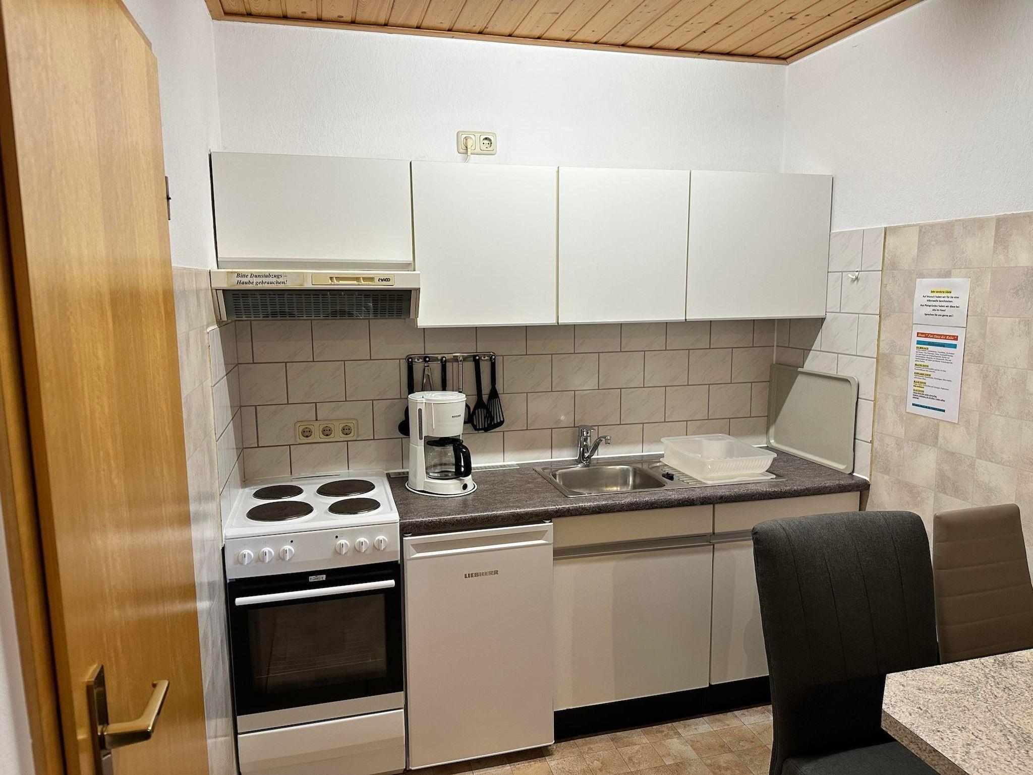 Einbauküche mit 4 Platten Herd und Backofen, Geschirr, Besteck & Töpfe, Kaffeemaschine, Eierkocher, Toaster, Wasserkocher u. div. Utensilien, Küchentisch mit 4 Stühlen