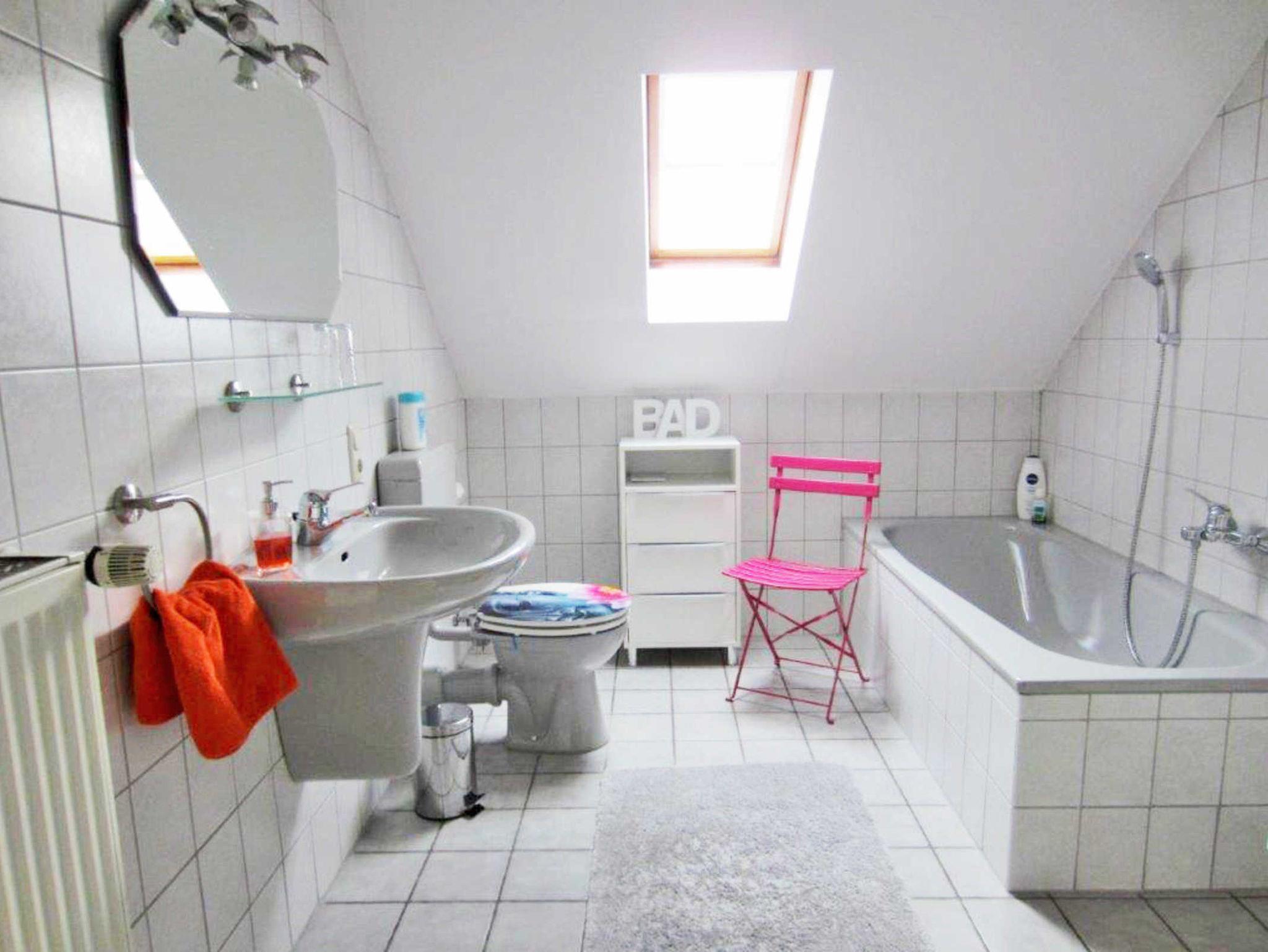Das moderne Bad ist mit Dusche, Badewanne, WC und Waschtisch ausgestattet und verfügt über Tageslicht.