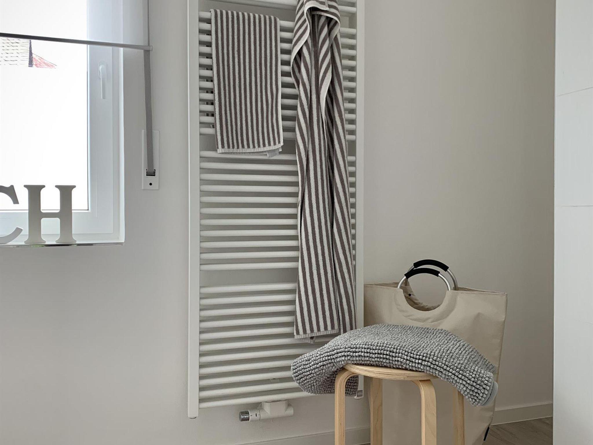 Das Bad bietet neben dem Waschtisch und einem wandhängenden Tiefspül-WC eine große Regen-Dusche (140 x 90 cm) mit Glastüren, einen Handtuch-Heizkörper, Haartrockner, Pflege-Artikel in Bio-Qualität und Handtücher in verschiedenen Größen.