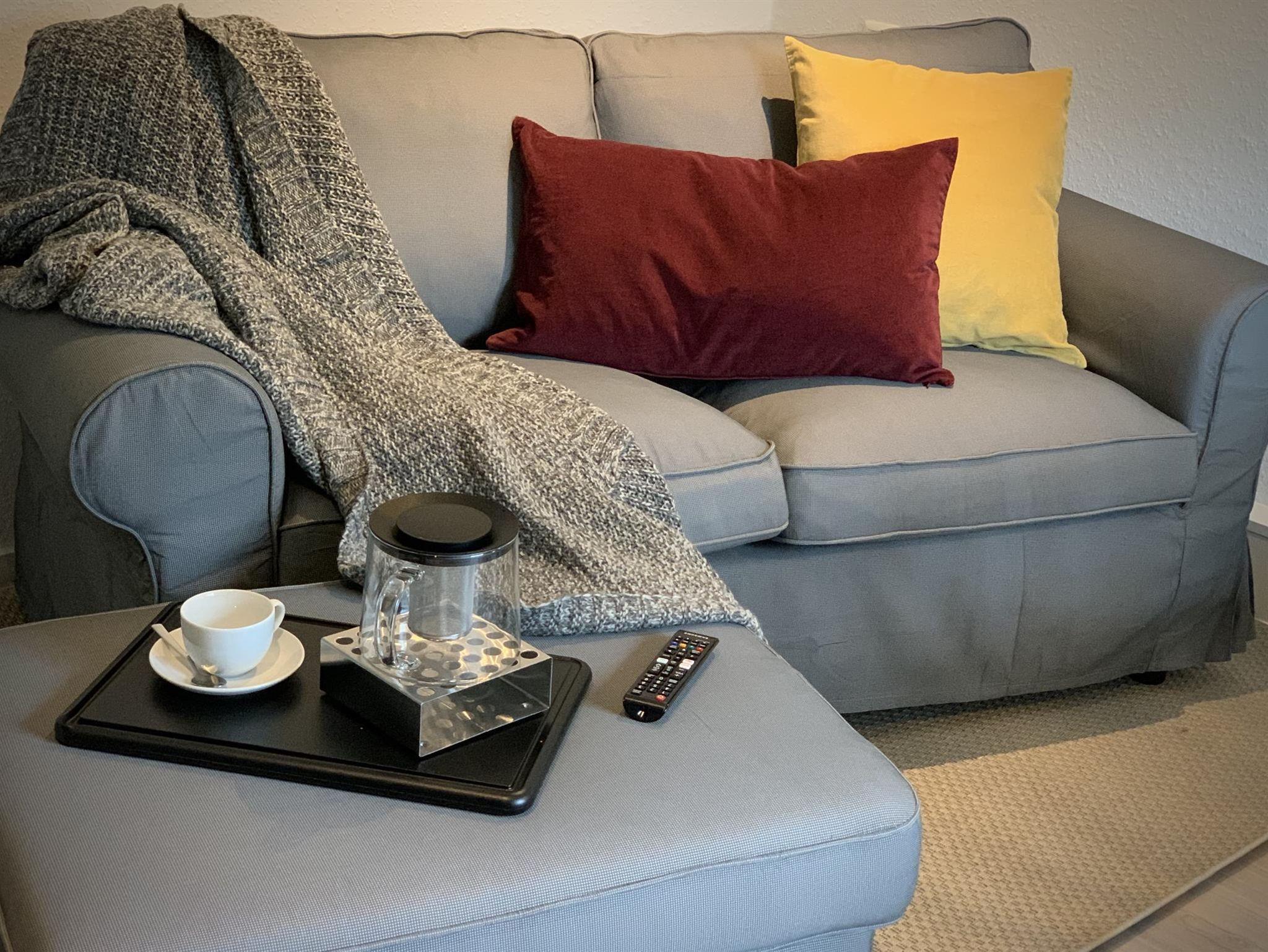Hier haben wir einen großen All-Raum, in dem Sie gemütlich mit bis zu vier Personen frühstücken, oder aber abends auf der Couch mit Fußhocker entspannen, fernsehen (55“ Flatscreen) oder lesen können. Und wenn die Lider doch zu schwer werden, lassen Sie sich einfach ins bequeme Bett (160 x 200 cm) fallen. Außerdem haben wir hier einen Kleiderschrank untergebracht. Der Bereich ist abschließbar, d.h. wenn Sie z.B. über das Wochenende nachhause fahren, können Sie davon ausgehen, dass alles so bleibt, wie Sie es verlassen haben.
