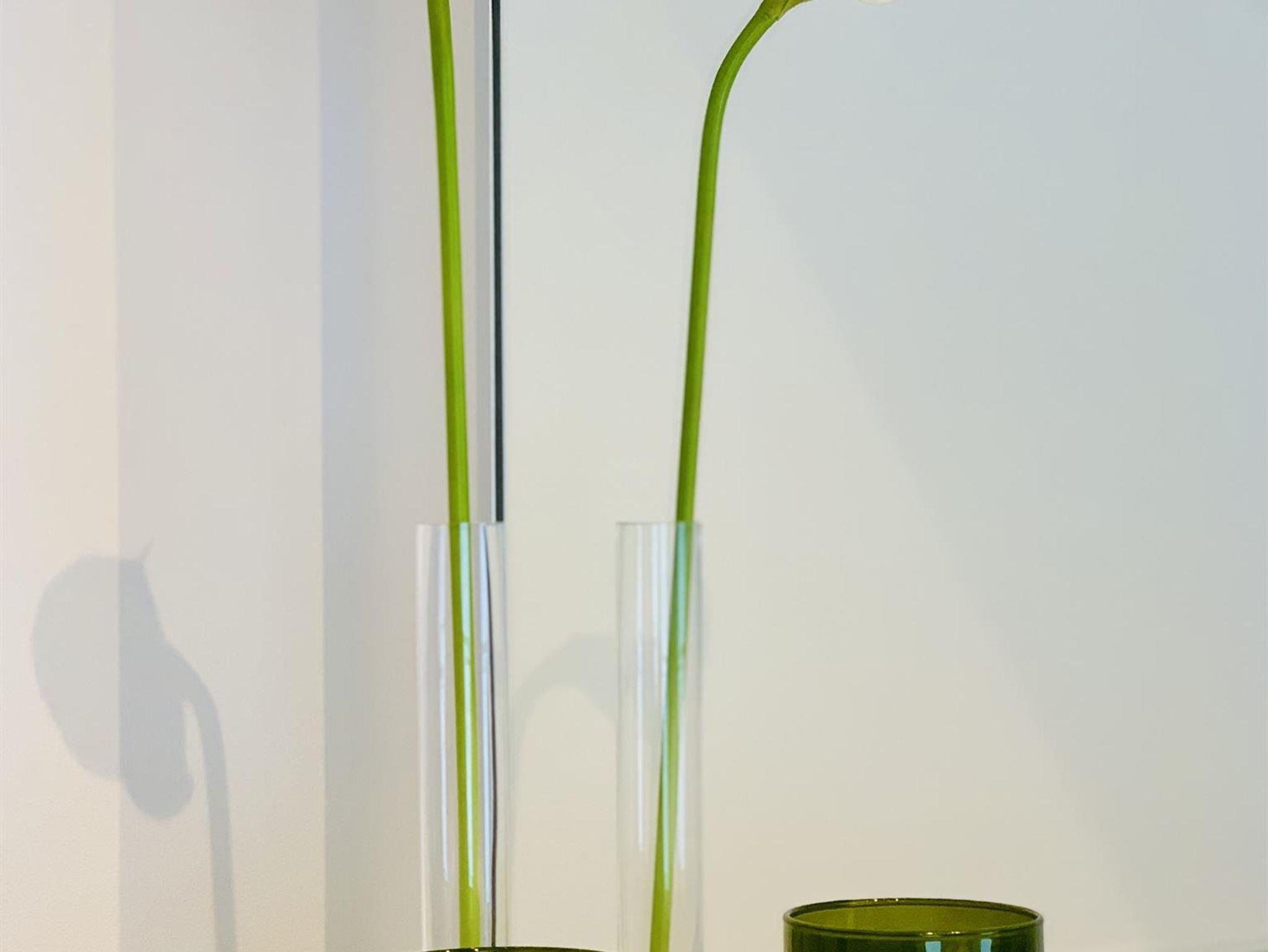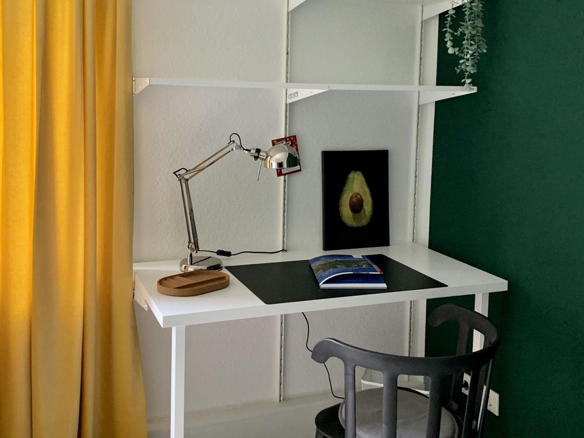In Quadratmetern identisch mit Gastbereich 1, hier allerdings aufgeteilt auf zwei Zimmer und mittels Glas-Abschlusstür vom Rest der Wohnung getrennt. Im kleinen Schlafzimmer stehen ein französisches Bett (140 x 200 cm), zwei Nachttische mit Leseleuchten und ein Kleiderschrank. Für den letzten Check vor dem Start in den Tag gibt es einen Spiegel im Flur. Nebenan haben wir ein kleines Wohn-Arbeitszimmer eingerichtet. Auch hier kann man gemütlich auf einer Couch mit Fußhocker entspannen und fernsehen (55“ Flatscreen), am Arbeitsplatz die letzten Mails checken (kostenloses WLAN) oder aber mit bis zu vier Personen essen.