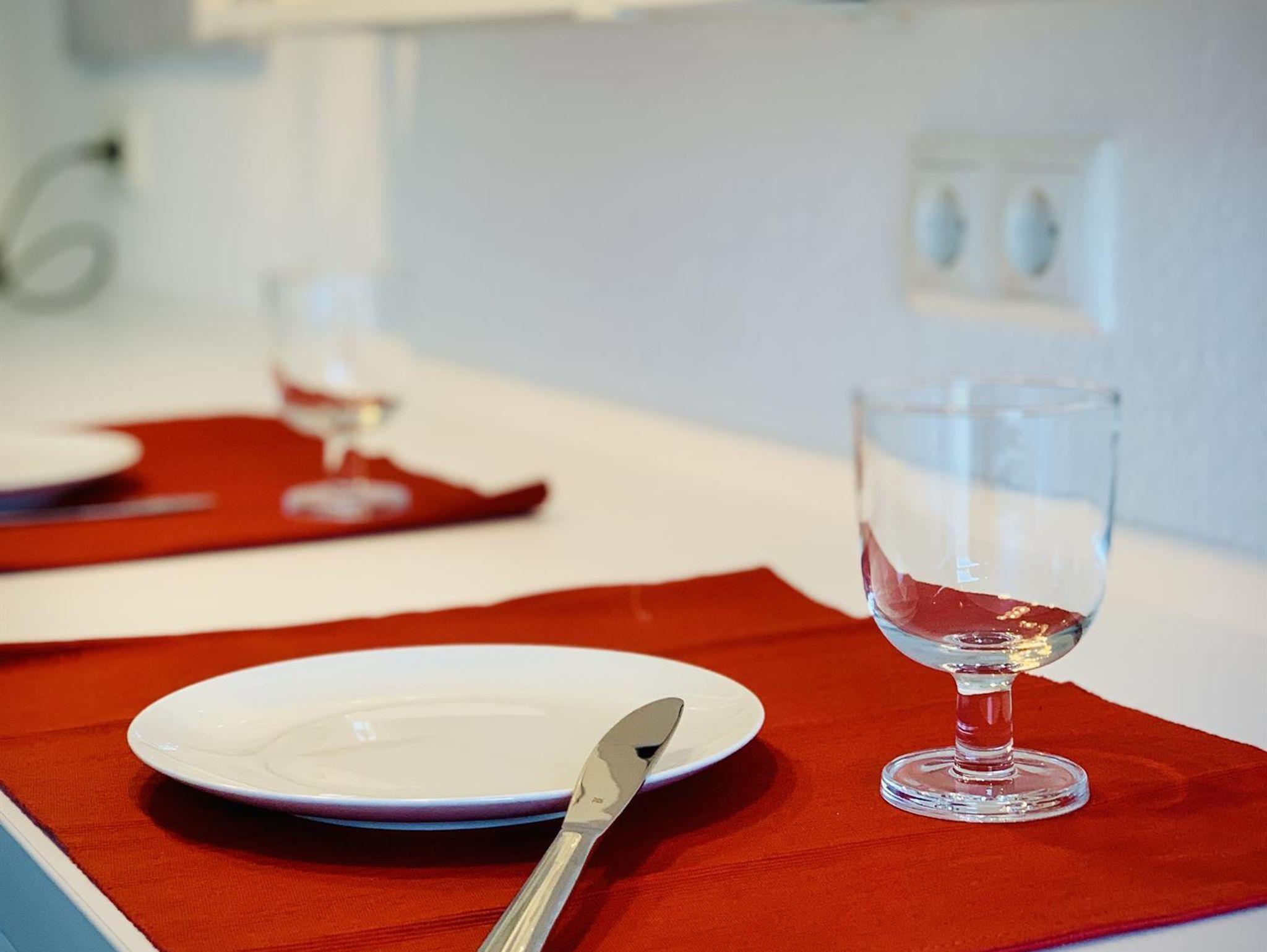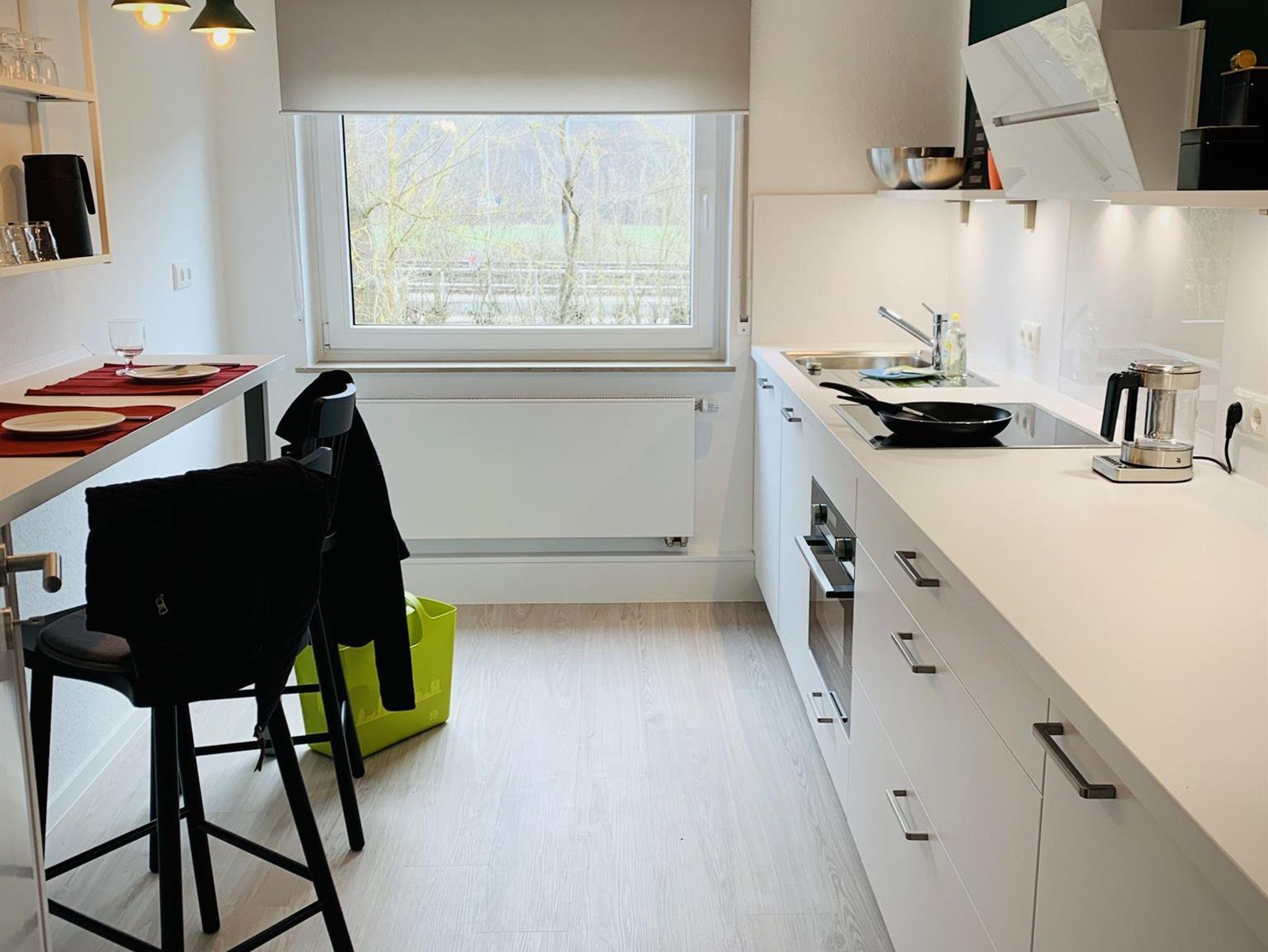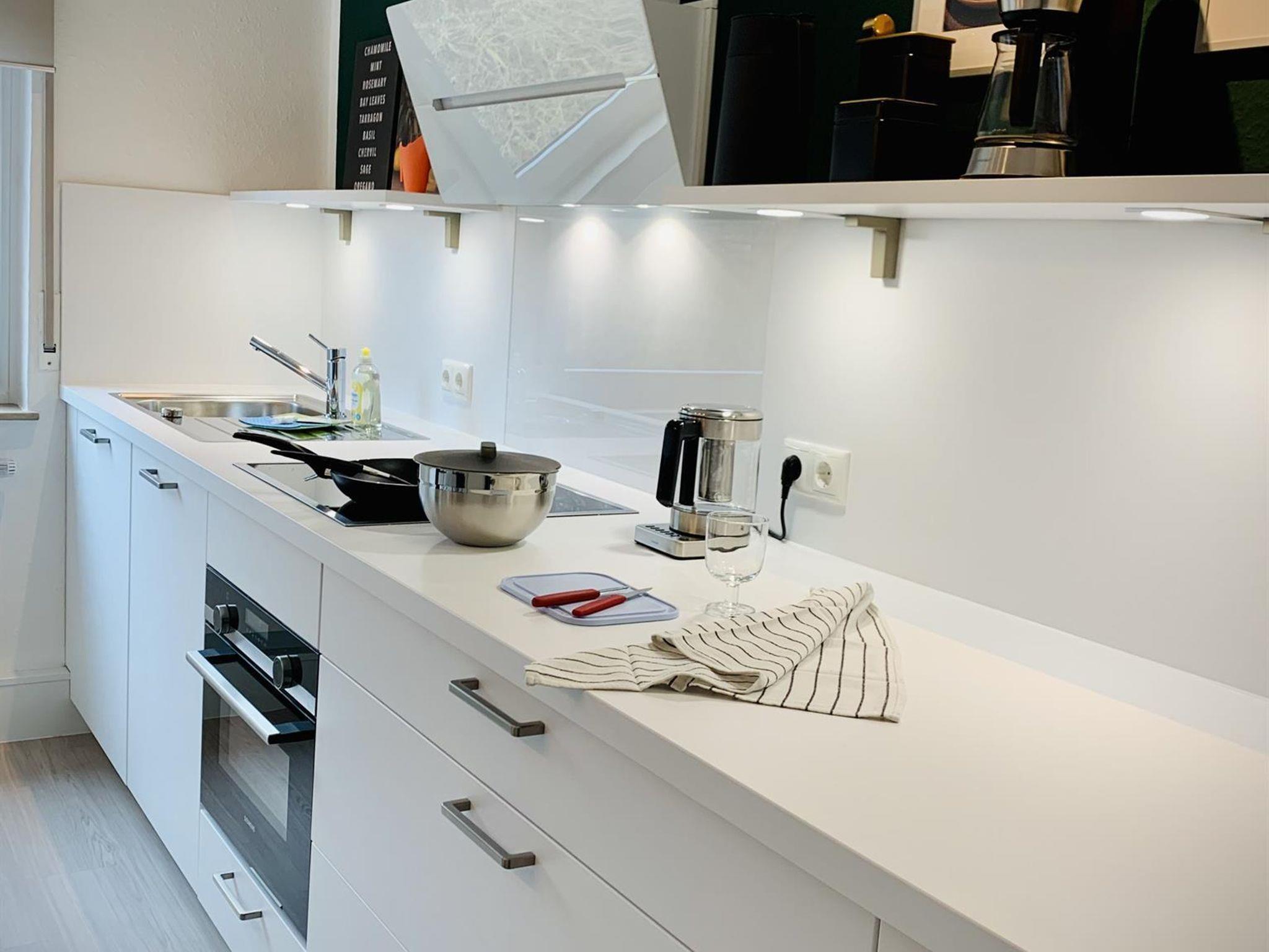 Unsere in 2021 neu eingebaute Küche hält alles bereit, was man zum Kochen und Genießen braucht: Induktionsherd mit Glas-Dunstabzug, Kombiherd mit Mikrowelle, Spülmaschine und Kühlschrank mit ***-Gefrierfach. Darüber hinaus die gängigen Elektro-Geräte, wie Wasserkocher, Toaster und Kaffeemaschinen (Filter & Kaffepad). Neben genügend Töpfen und Pfannen finden Sie hier eine Auswahl von Vorratsbehältern, Schneidbrettern und Kochutensilien. Für Eilige haben wir in unserer Küche auch eine Frühstückstheke eingerichtet. Hier kann man zu zweit morgens den ersten Kaffee genießen oder abends beim Kochen gemeinsam „schnibbeln und klönen“. Platzsets, Geschirr, Besteck, Gläser für Wein, Wasser, Saft und Weizenbier finden Sie im Schrank neben der Theke, bzw. sichtbar im Regal über der Theke.
