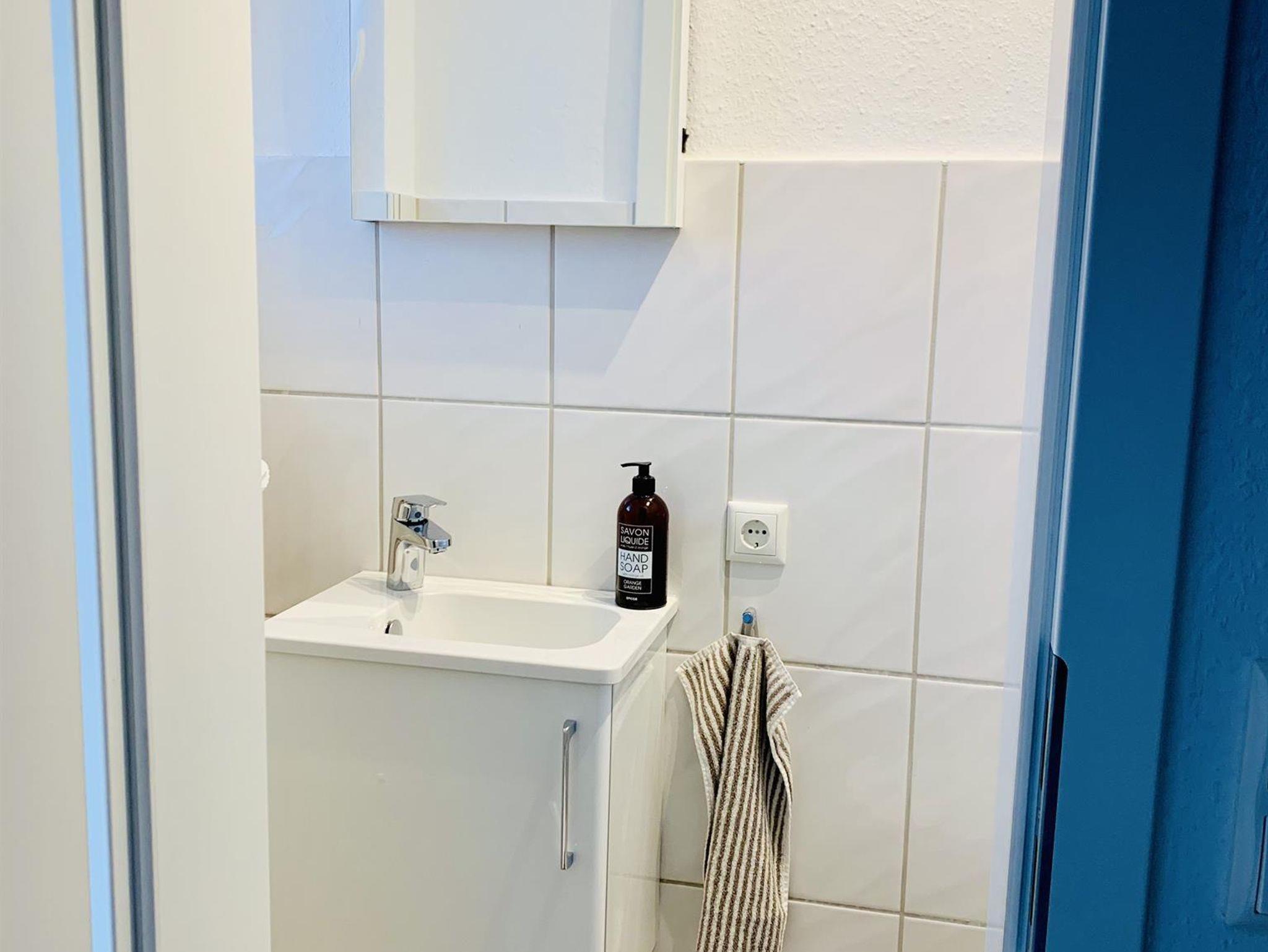 Gäste-WC: Ausgestattet mit Handwaschbecken und wandhängender Toilette (wegen baulicher Voraussetzungen ist die Sitzhöhe etwas niedriger als allgemein üblich).