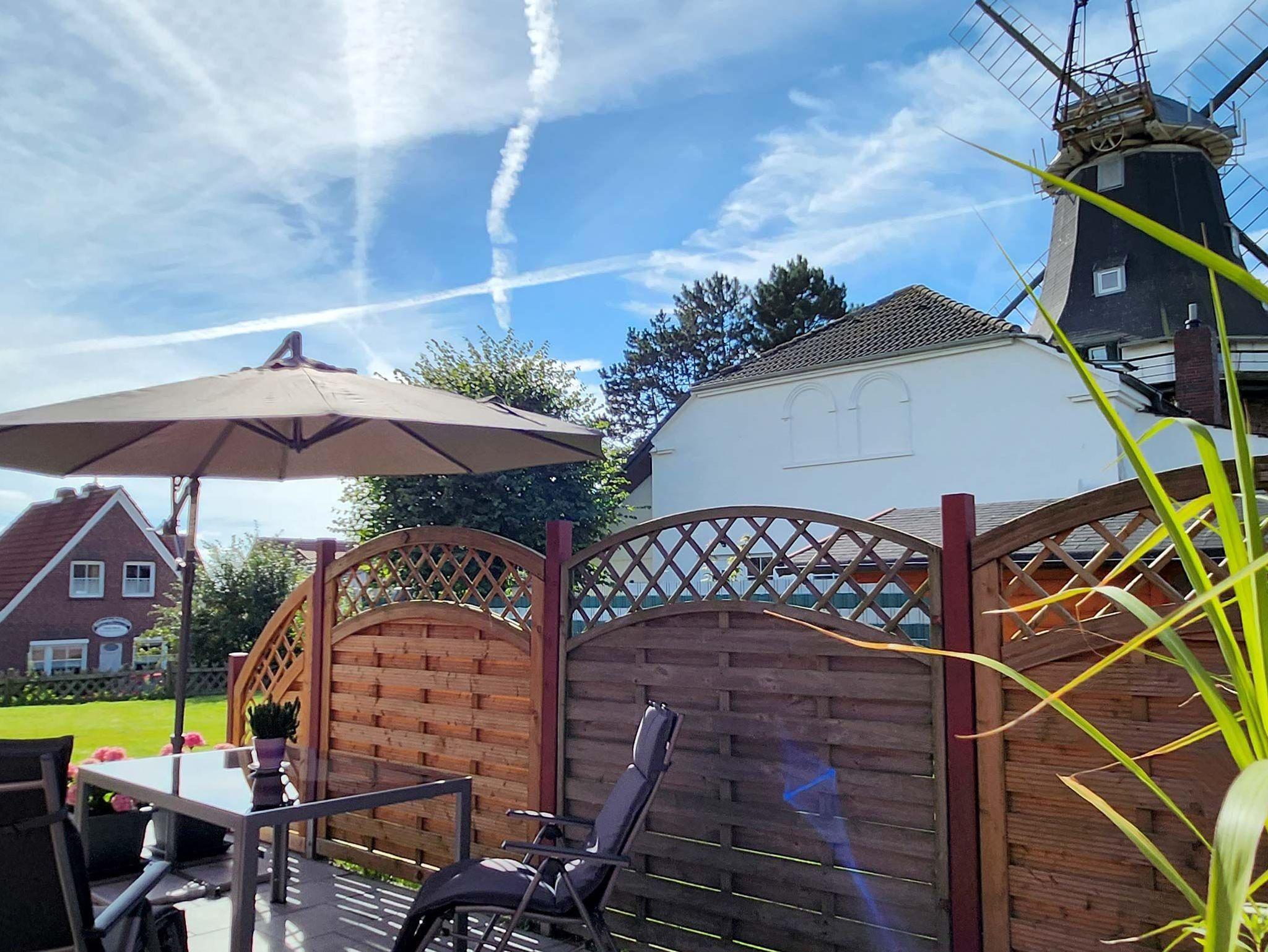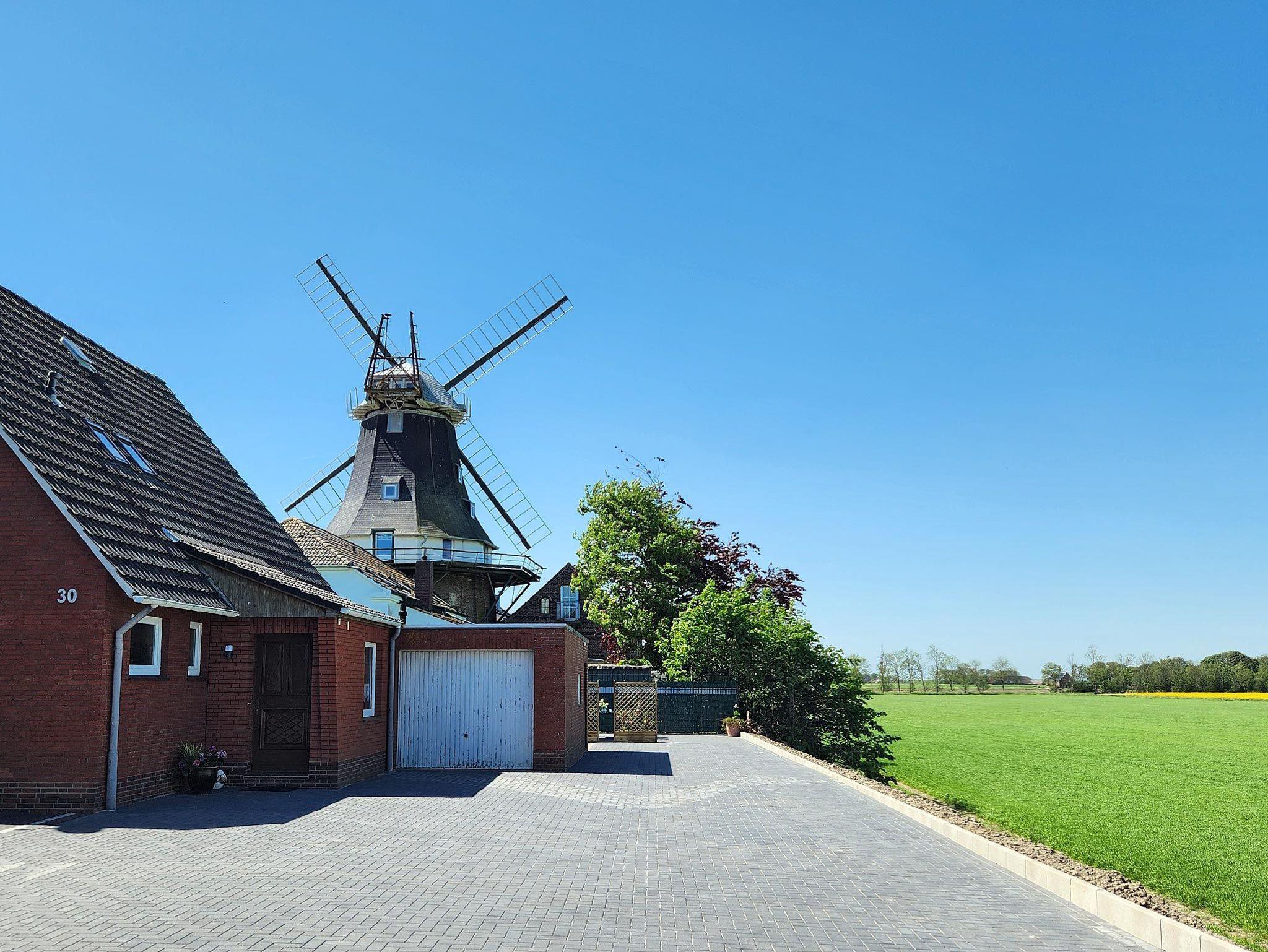 Ferienwohnung Deichperle in Carolinensiel: Komfortabler Urlaub mit Blick auf die historische Windmühle und nahe Hafen-Zentrum.