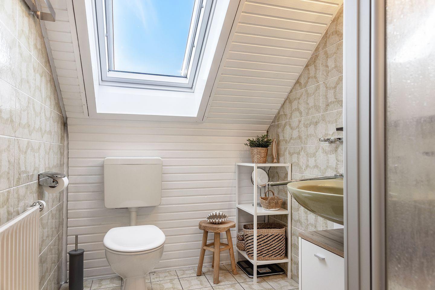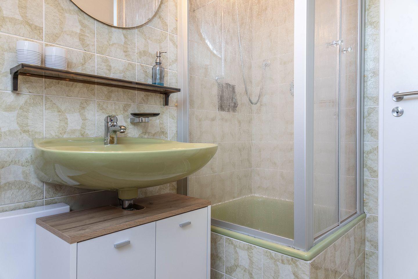 Das mit Tageslicht durchflutete Badezimmer verfügt über Dusche, WC, Heizkörper, Haartrockner, Personenwaage und Tritthocker.