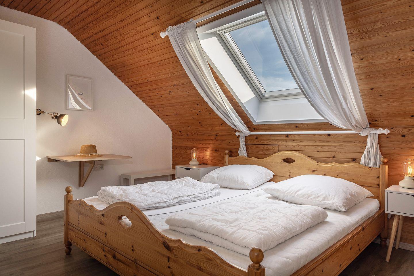 Das helle und freundliche Schlafzimmer ist ein absoluter Traum. Hier kann man direkt unterm Sternenhimmel einschlafen. Natürlich besitzt das Fenster einen Sonnenschutz und ein Rollo. Ein großes Doppelbett (180 x 200 cm) lädt zum Ausschlafen ein. Außerdem kann hier problemlos ein Kinderbett aufgestellt werden.