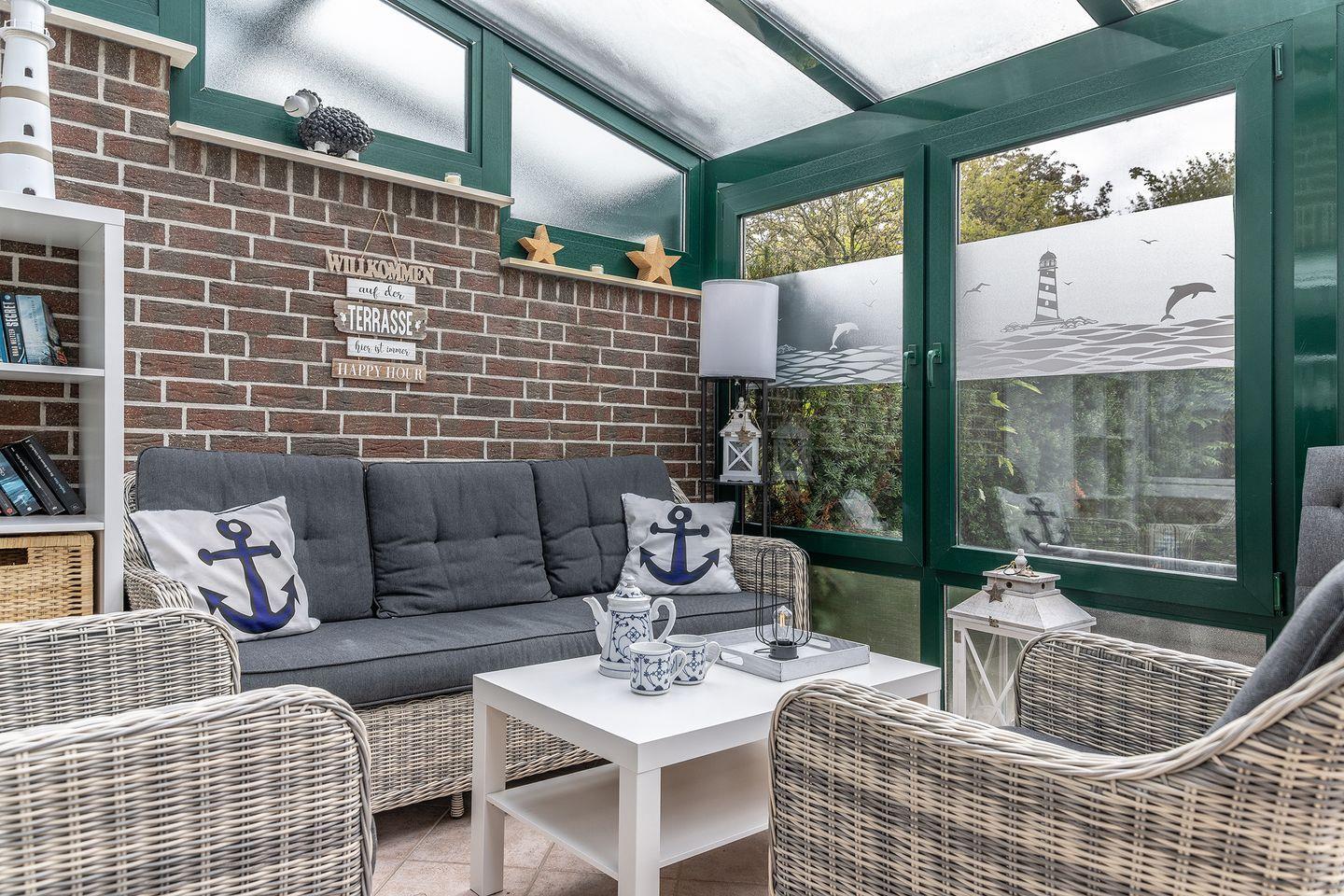 Der beheizbare Wintergarten (ca. 13 m²) sorgt auch bei Schietwetter für Gemütlichkeit: Ausgestattet mit Sitzgelegenheiten, Sonnenschutzscheiben, Dachmarkise und Zugang zu Terrasse und Garten.