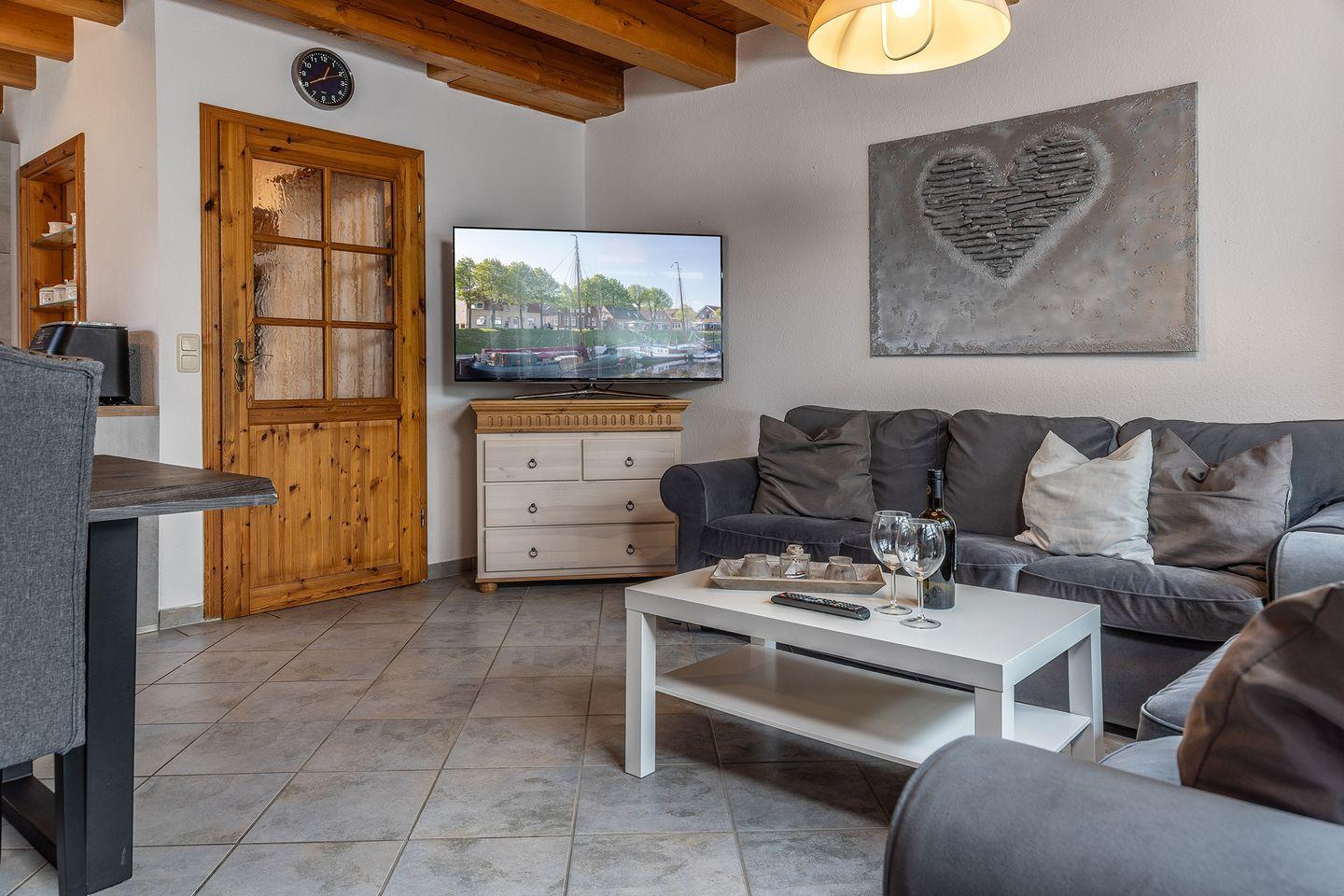 Gemütlicher Wohn- /Essbereich mit Flachbildschirm, Amazon Alexa und Urlaubsliteratur