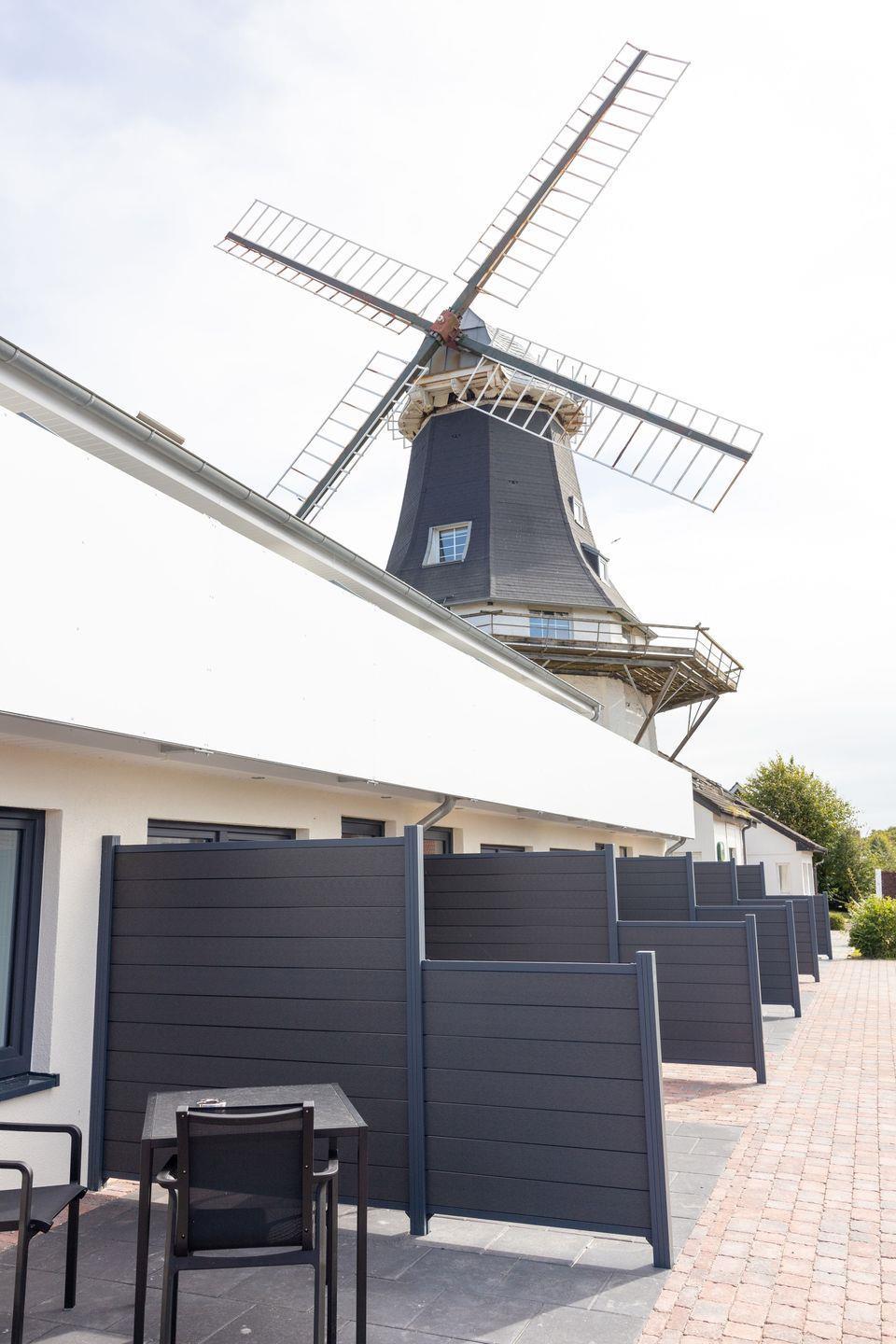 Moderne Ferienwohnung in Carolinensiel mit Terrasse und Blick auf historische Mühle, ideal für entspannte Tage an der Nordseeküste.