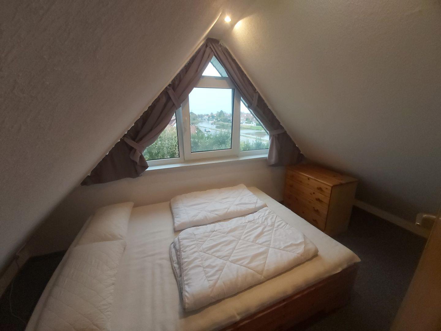 Über eine Treppe gelangen Sie in das Schlafzimmer direkt unter dem Dach, von wo aus Sie einen fantastischen Ausblick genießen können.