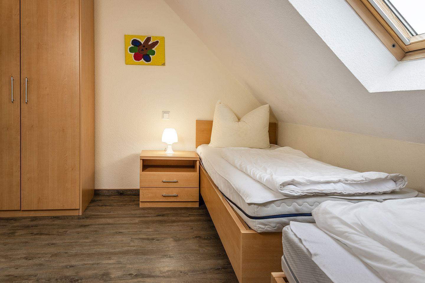 1 Schlafzimmer mit Doppelbett, 1 Schlafzimmer mit 2 Einzelbetten, zustellbares Kinderbett, Latexmatratzen, Bad mit Dusche.