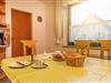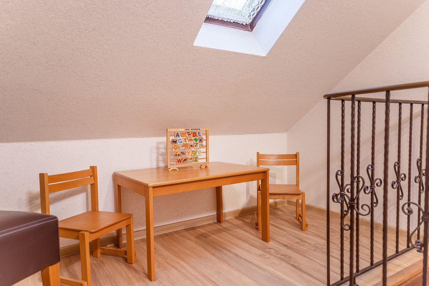 Separate und gut ausgestattete Wohnküche mit großem Essplatz, Gäste-WC, Bad mit Dusche, 1 Schlafzimmer mit Etagenbett und ausziehbarem Kojenbett.