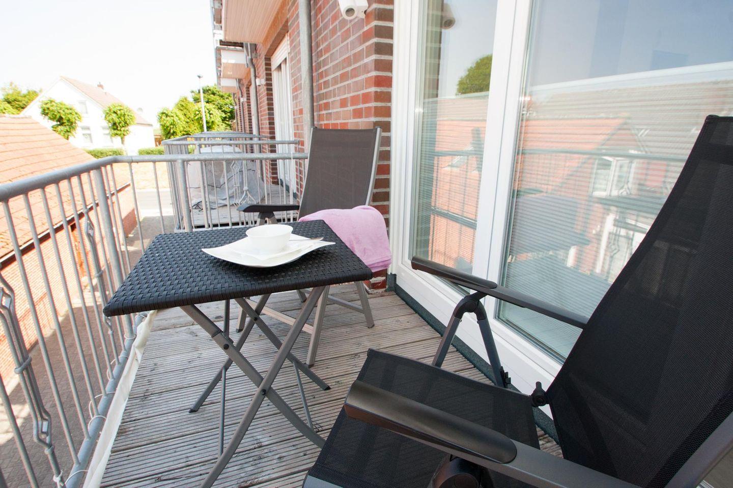 Moderne und helle Ferienwohnung mit Balkon in Carolinensiel, ideal für Familien und behindertenfreundlich ausgestattet.