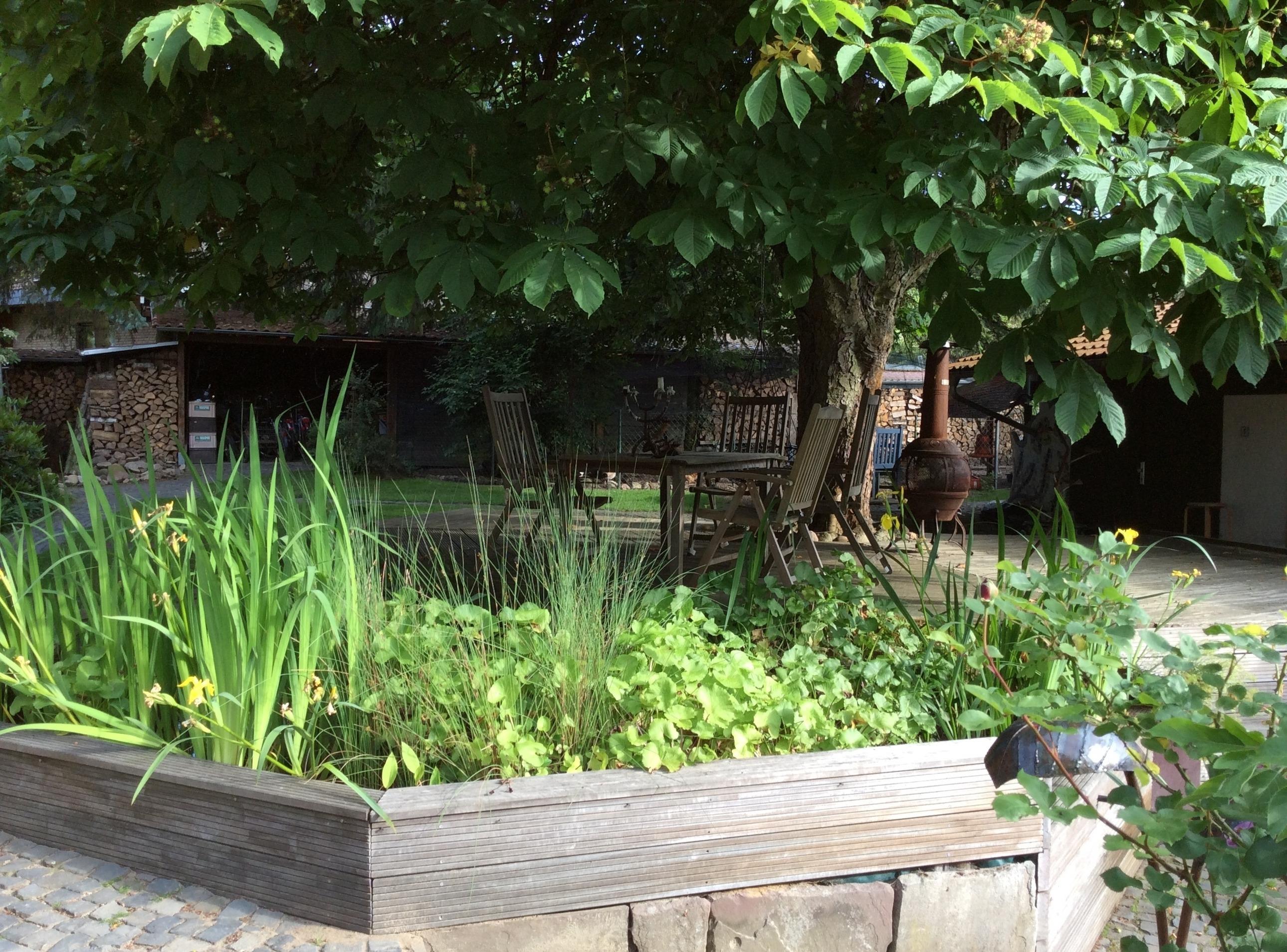 Unser 1.700 m² großes Grundstück hat einen Innenhof, in dem sich eine große Kastanien hoch und breit macht. Hier liegt auch der Eingang zum Studio. Durch einen Torbogen gelangen sie in einen großen naturnahen Garten mit Blumen, Bäumen, Büschen und einem großen und bewohnten Schwimmteich sowie unterschiedlichen Sitzplätzen.