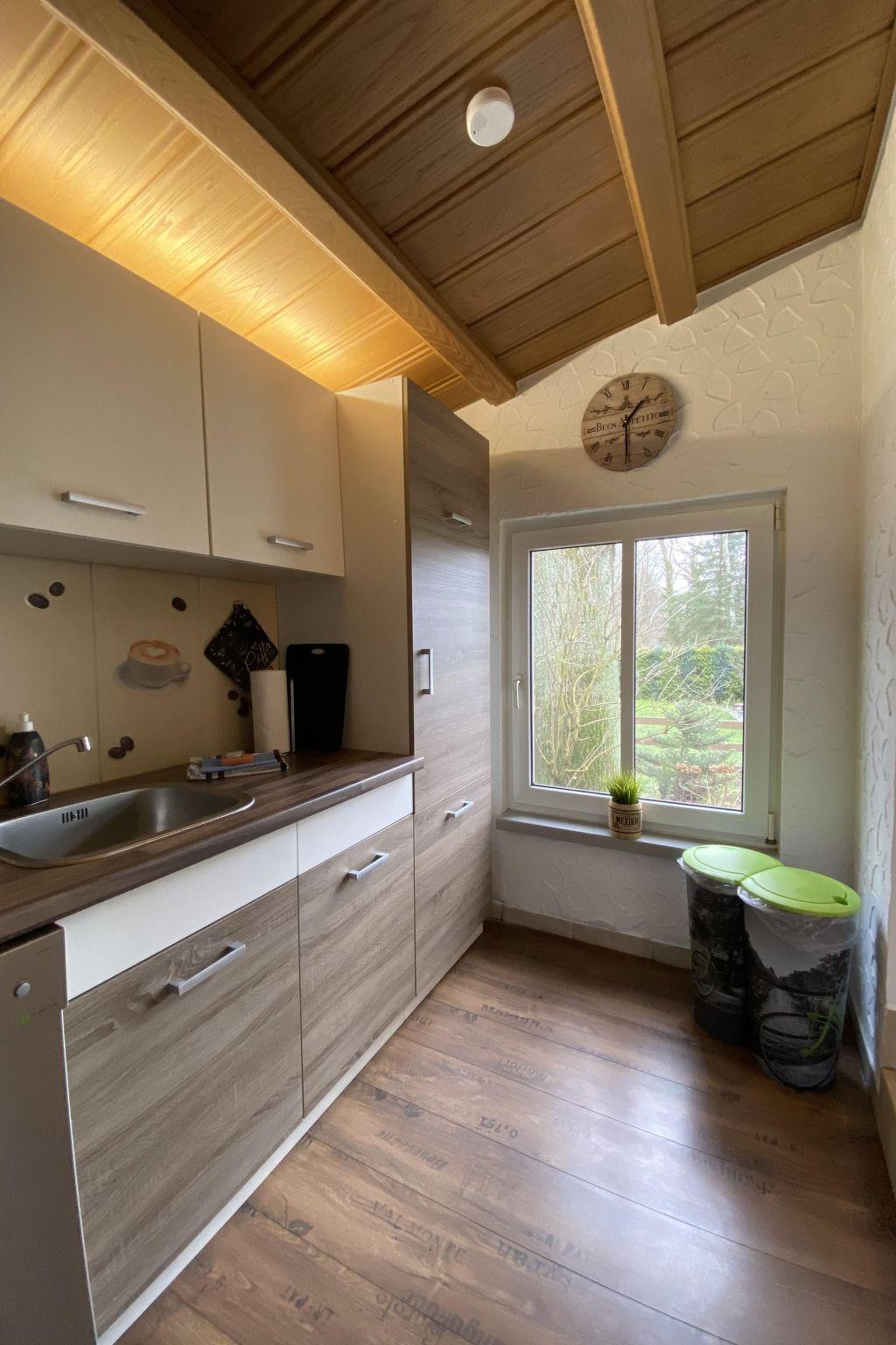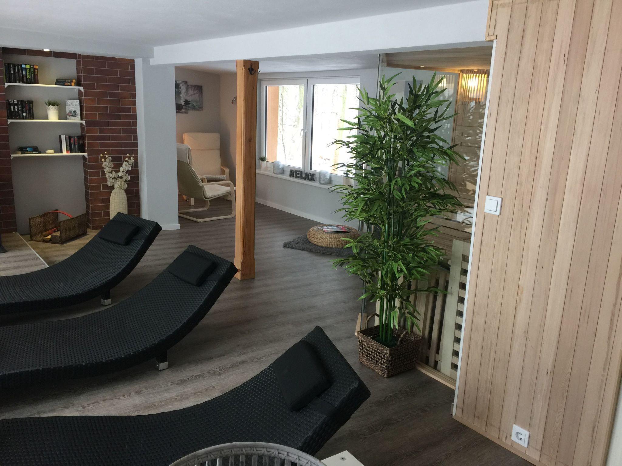 Im Eingangsbereich gibt es zum gemeinsamen Essen eine Essecke, auf der Terrasse mit Blick auf die Liegewiese stehen Gartenmöbel und Sonnenschirm sowie ein Grill zu Ihrer Verfügung bereit. Zur gemeinsamen Nutzung gibt es in der Anlage eine 70 m² große Sonnenterrasse mit Pool sowie (gegen Gebühr) eine Sauna mit Kamin und Ruheraum mit Blick in die Natur.