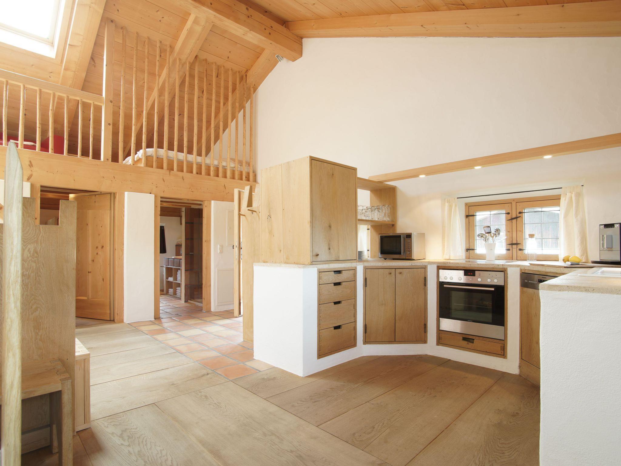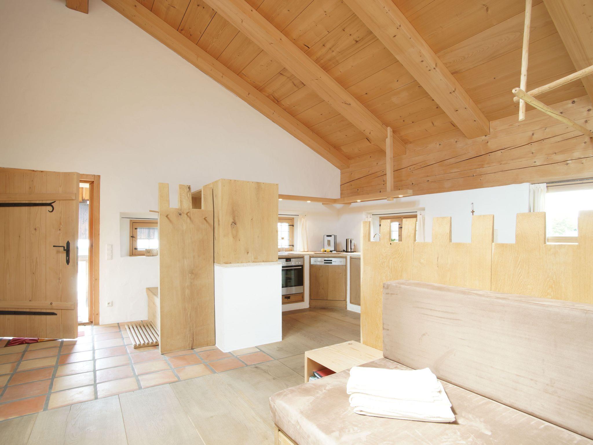 Der Wohn- und Essbereich bietet einen außergewöhnlichen Blick auf den Sichtdachstuhl, der in alter Zimmermannstradition gefertigt wurde.